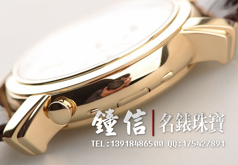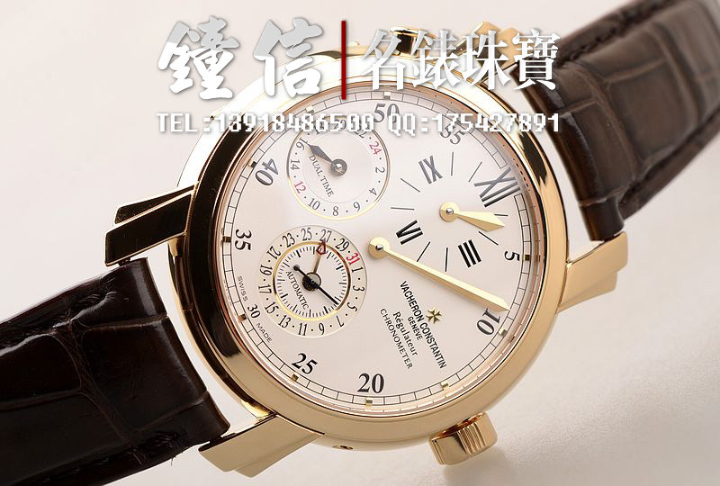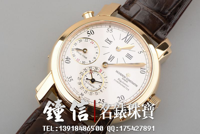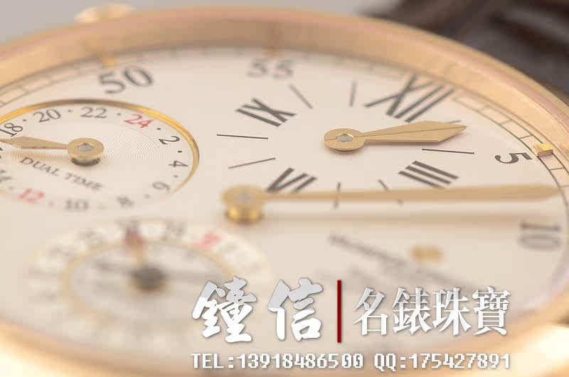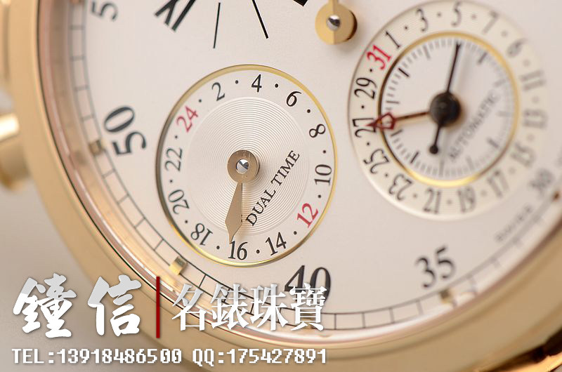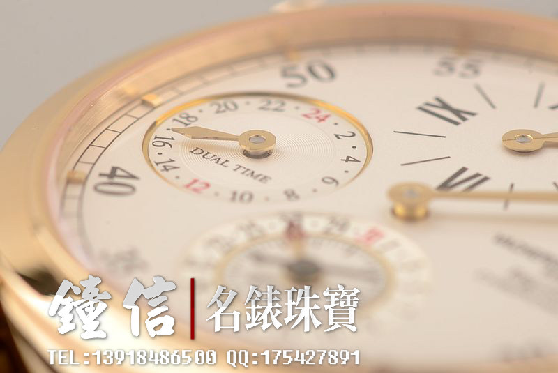18K黄金表壳及表扣,圣伯纳狗头印记。原厂棕色鳄鱼皮表带成色很新。象征着顶级系列的黄金将官底盖。蓝宝石水晶镜面及底盖,立体银白色表盘,黄金规范指针,12点位时针,9点位GMT第二时区,6点位日历指针及独立小秒针。口径39MM*11MM,防水30M。