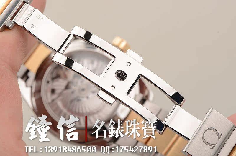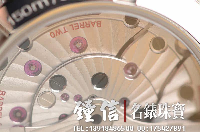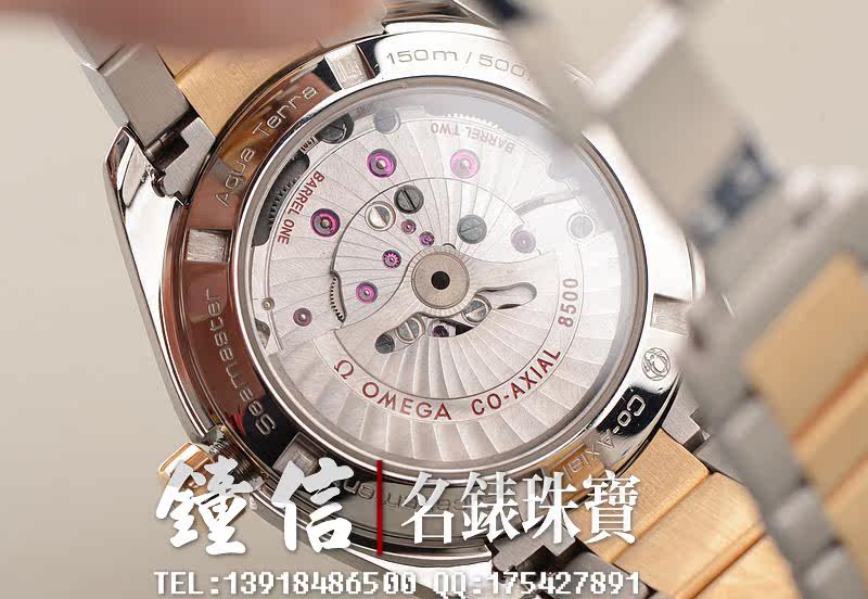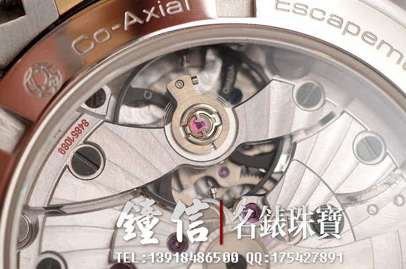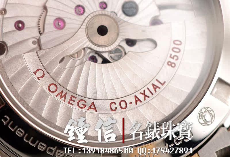 欧米茄自产的CAL.8500型机芯,自动机械,瑞士天文台认证,极其精致日内瓦条纹打磨,倒角抛光修饰,双发条盒,双向自动上链,同轴擒纵,由202个零件组成,39钻,摆频25200,5方位校正,动力储存约60小时。走时状态极佳。