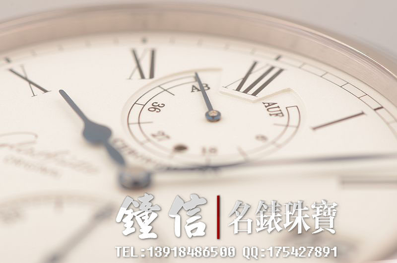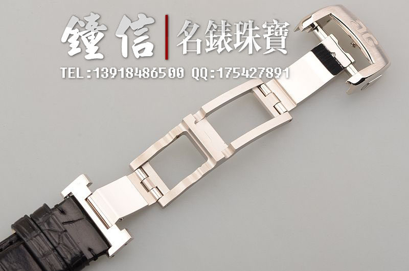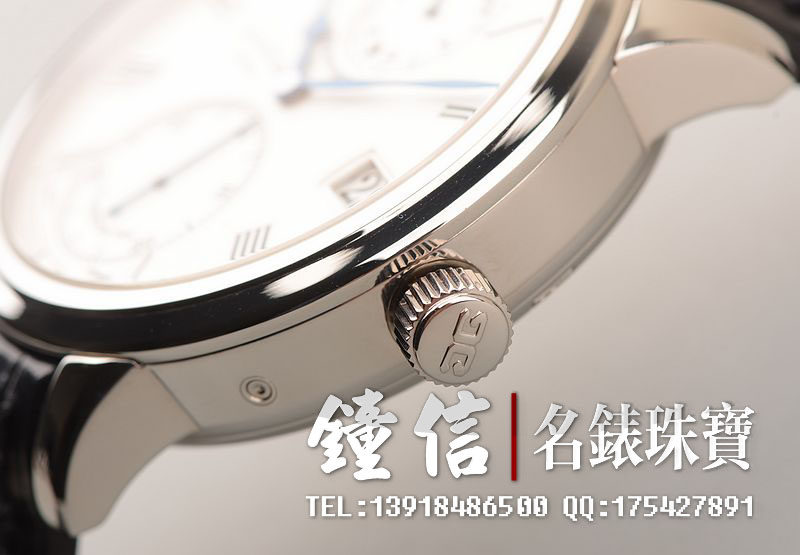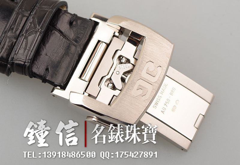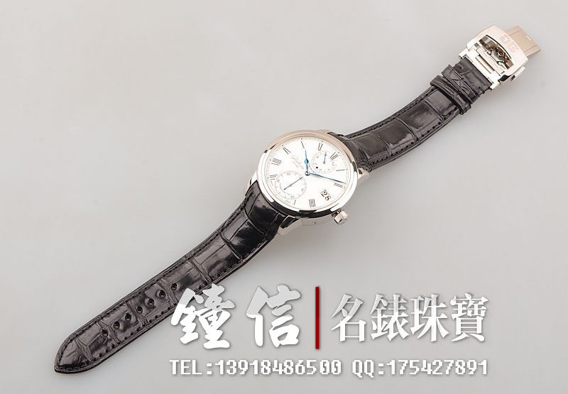 18K白金表壳及折叠式表扣,圣伯纳狗头印记。蓝宝石水晶镜面及底盖。后配全新黑色短吻鳄鱼皮表带。立体银白色细喷砂表盘。优雅的蓝钢桃心指针。3时位大日历窗显示日期,12时位动力储存及昼夜显示,6时位独立小秒针。口径42MM*12.3MM。防水50M。