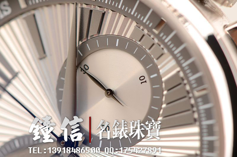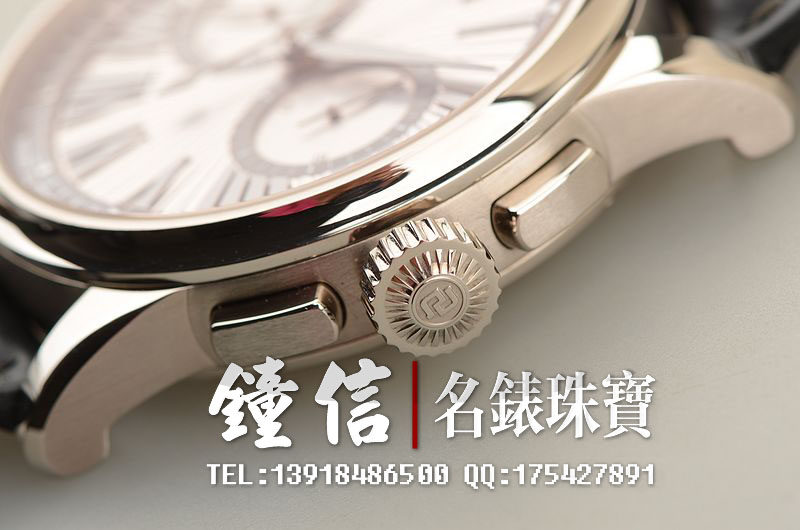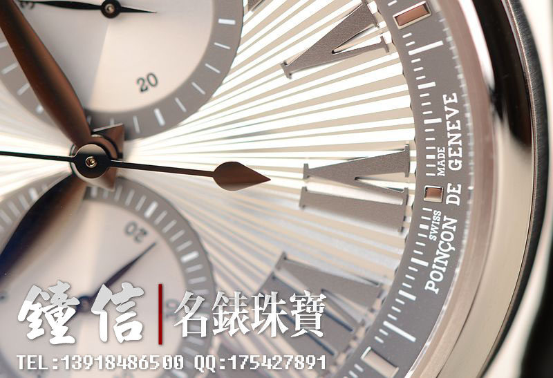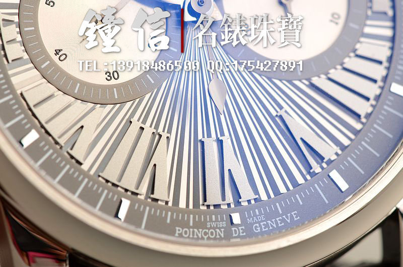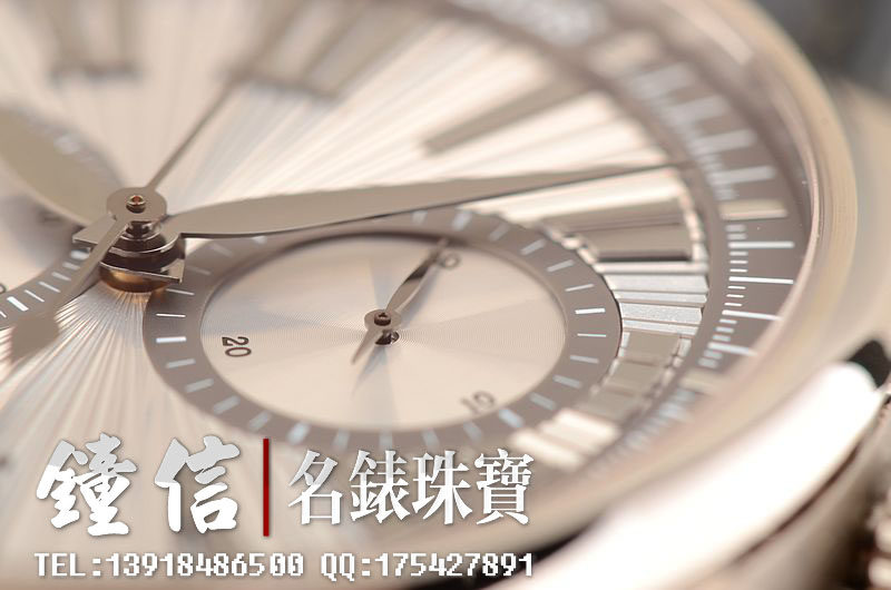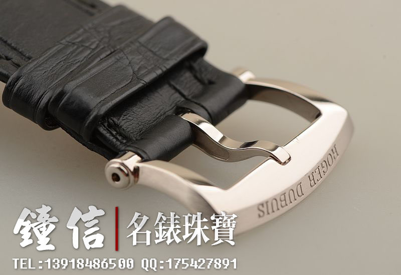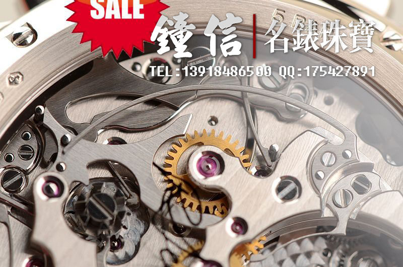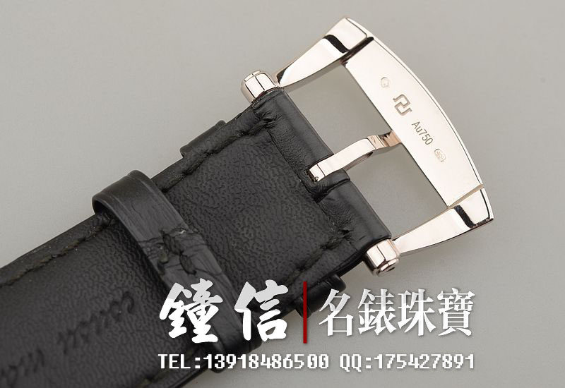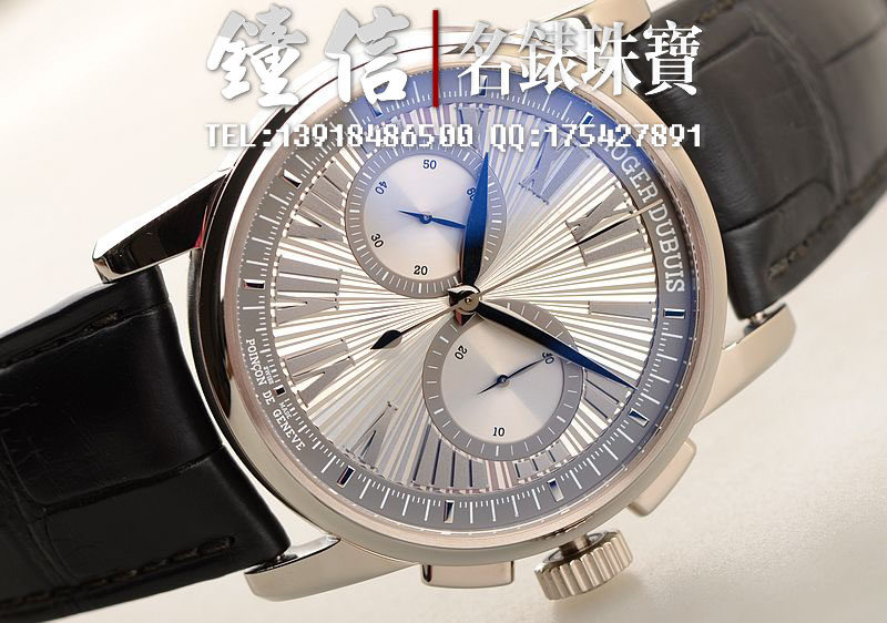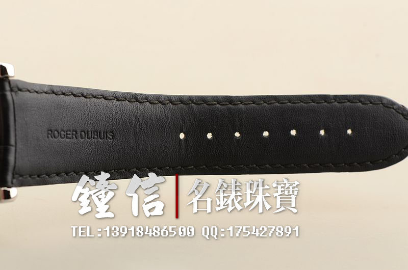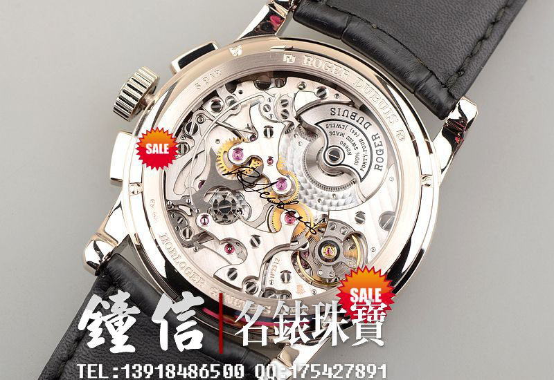 18K白金表壳及表扣,圣伯纳狗头印记。原厂全新黑色短吻鳄鱼皮带。蓝宝石水晶镜面及底盖,立体手工玑镂饰纹表盘,9点位独立小秒针,3点位30分钟计时。表背蓝宝石水晶镜面镌刻罗杰杜彼先生签名。口径42MM*12.3MM。防水50M。