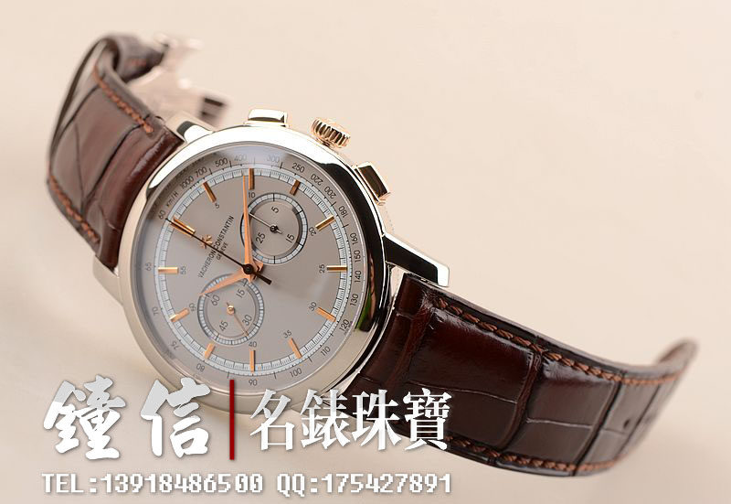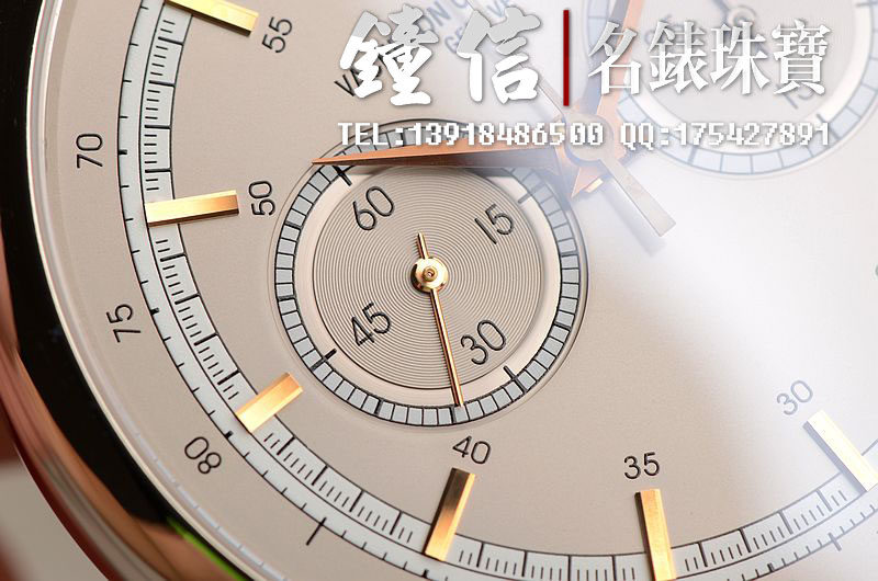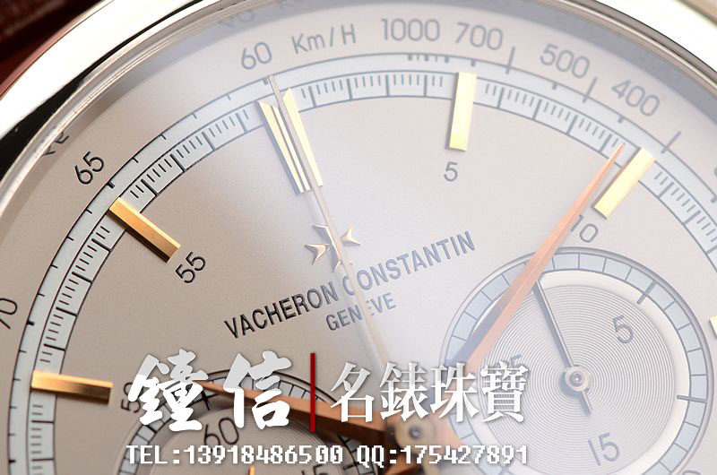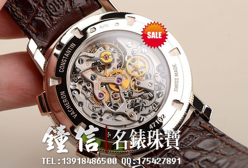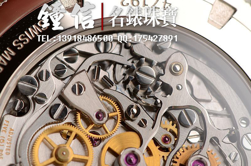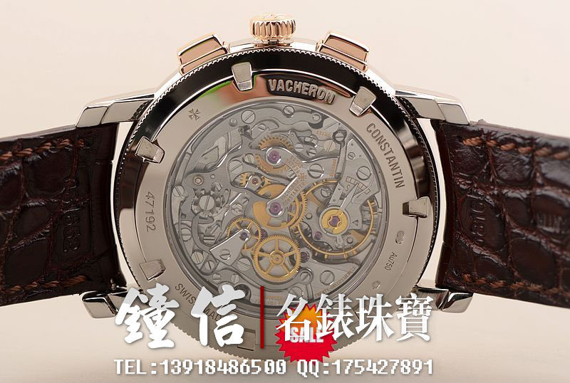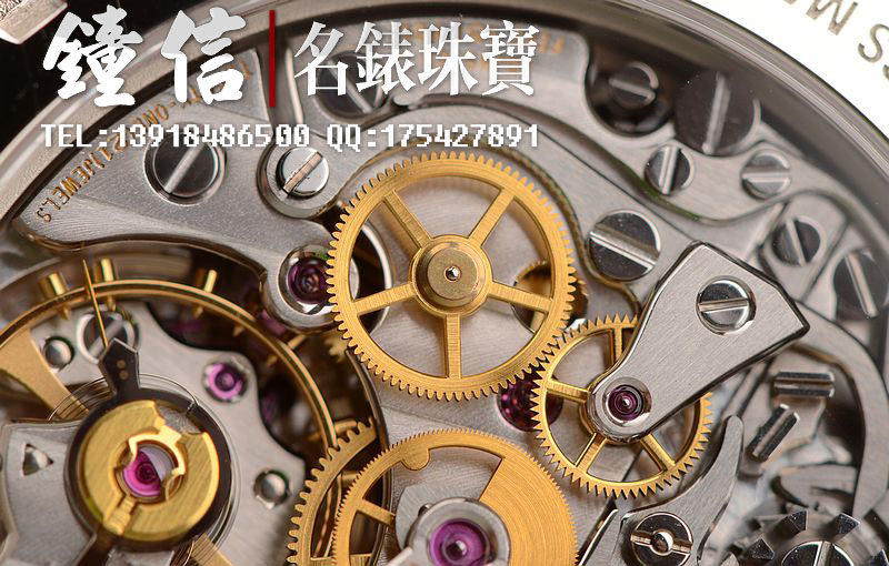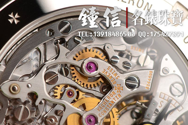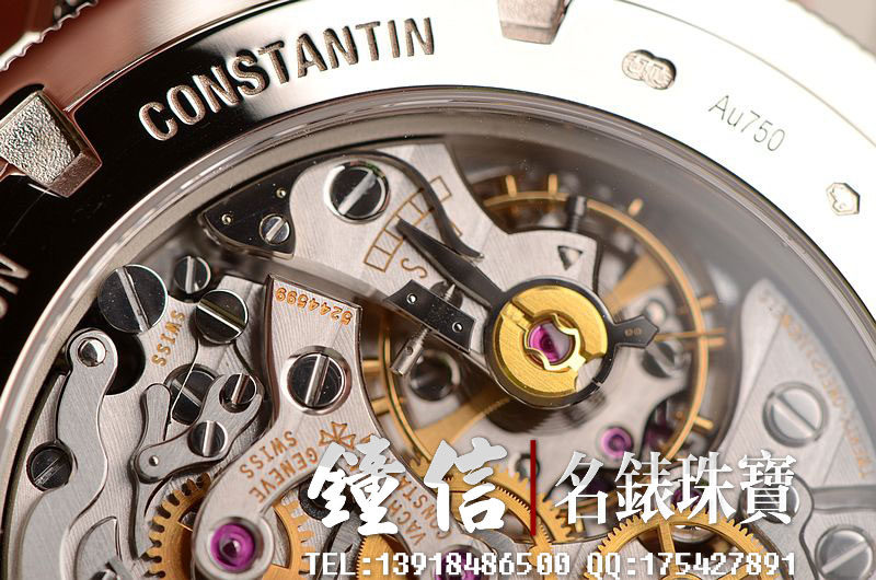 VC自产的顶级CAL.1141型机芯,手上链,极其精致日内瓦条纹打磨,倒角抛光修饰。21钻,摆频18000,鹅颈微调,五方位校正,机芯有独立签署。动力储存约48小时,走时状态极佳。
