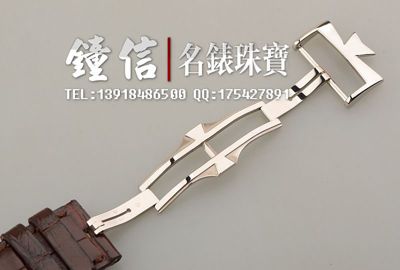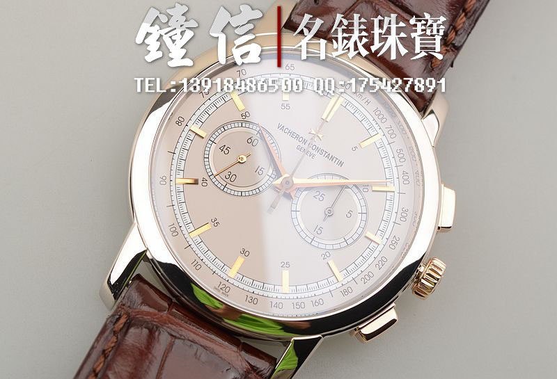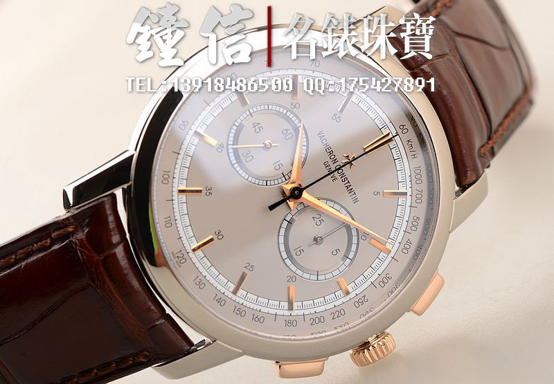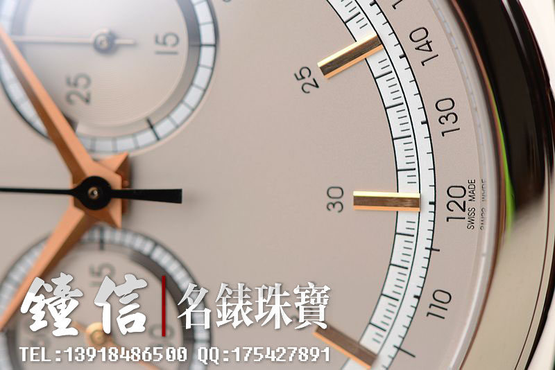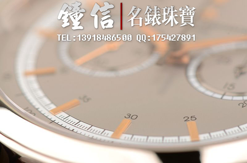 18K白金表壳及折叠式表扣,圣伯纳狗头印记。原厂棕色短吻鳄鱼皮带成色极新。蓝宝石水晶镜面及底盖,立体灰色计时表盘有测速圈,玫瑰金指针及刻度,玫瑰金计时按钮及表冠。9点位独立小秒针,3点位30分钟计时。口径42MM*10.6MM,防水30M。