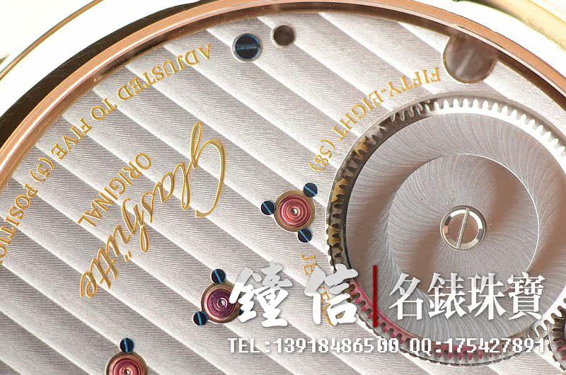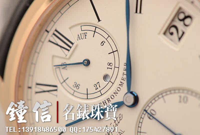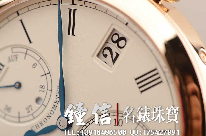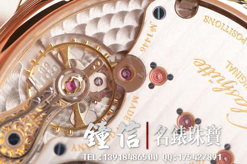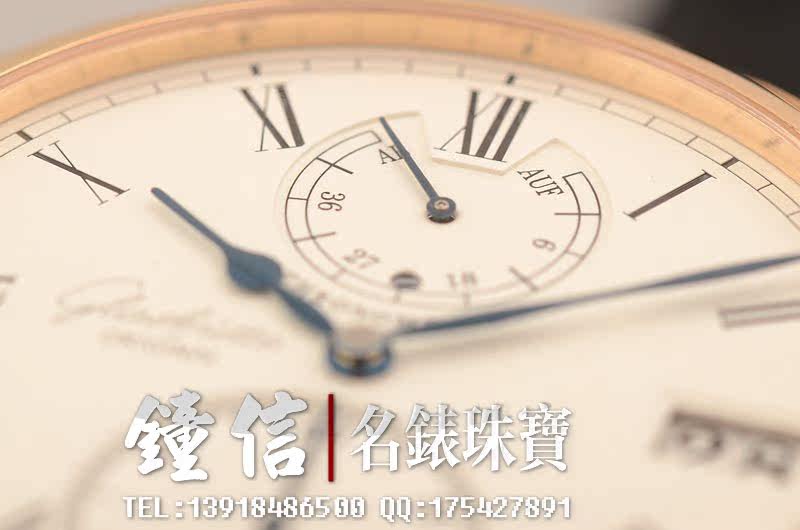 GO自产的CAL.58-01机芯,属于该品牌的高级别机芯,获德国格拉苏蒂天文台认证。手动上链,58钻,摆频28800。动力储存约45小时。德式3/4大夹板,全手工精致打磨及倒角抛光处理,18K黄金游丝摆轮,鹅颈微调功能,5方位校正,黄金套筒固定红宝石轴承。基本汇集所有德式高级机芯元素。走时状态极佳。