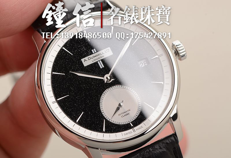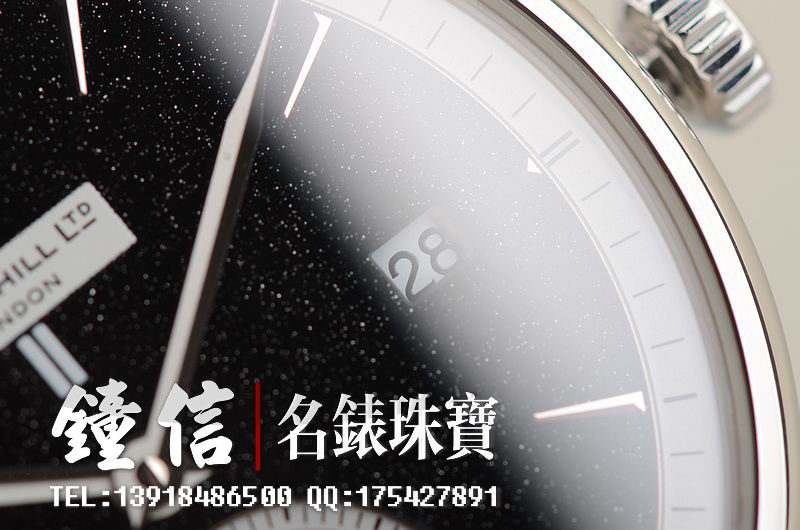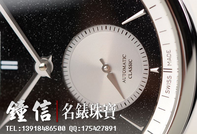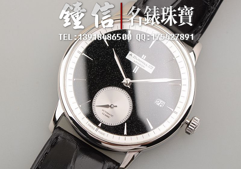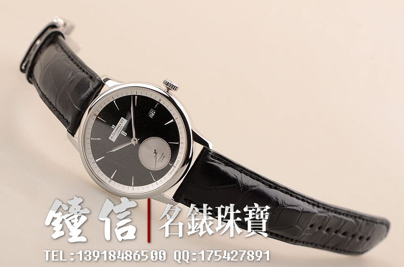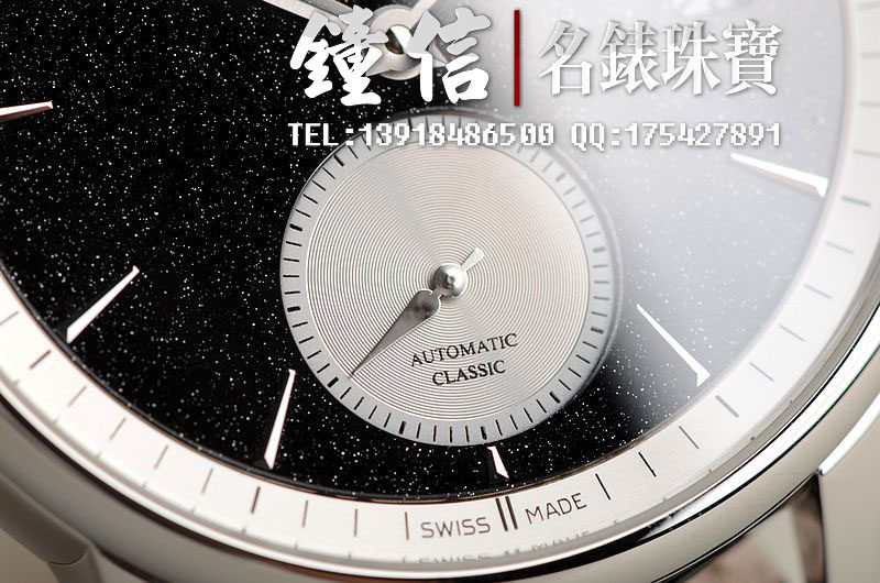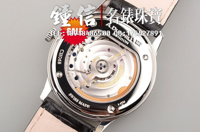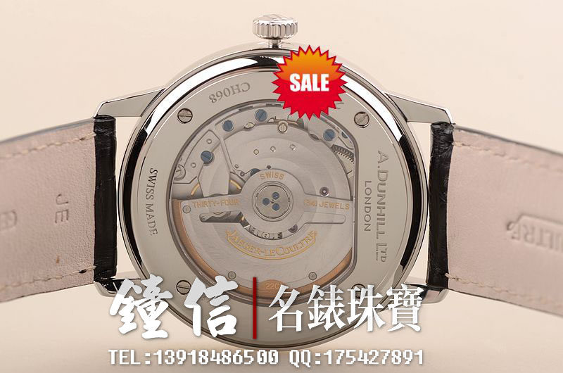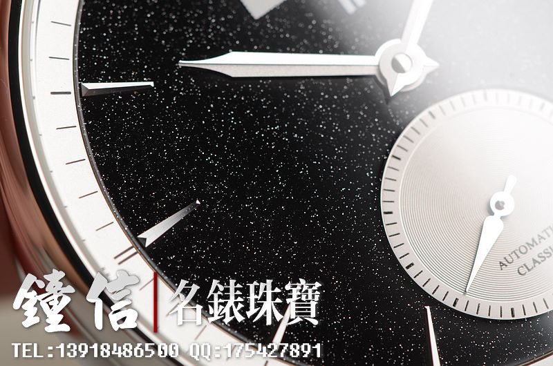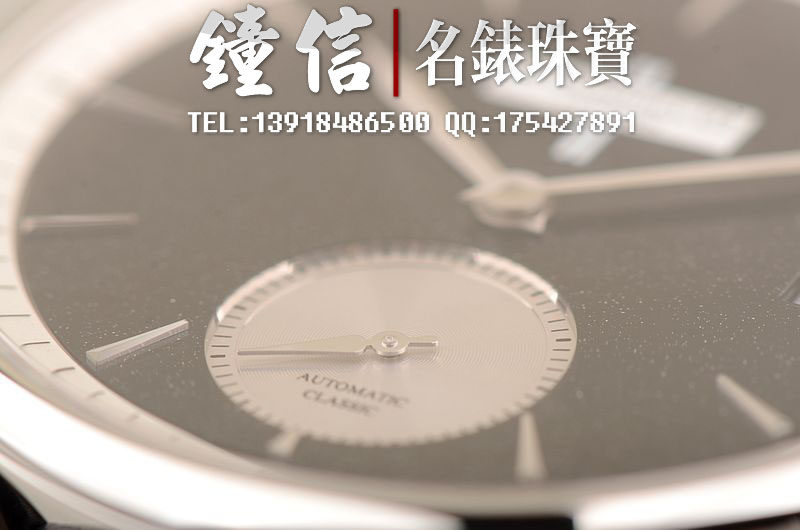 精钢表壳及折叠式表扣,原厂黑色积家鳄鱼皮表带未使用品相。蓝宝石水晶镜面及底盖,立体黑色石材表盘,小三针设计,3点位日历显示功能。口径38MM*9MM,防水50M。