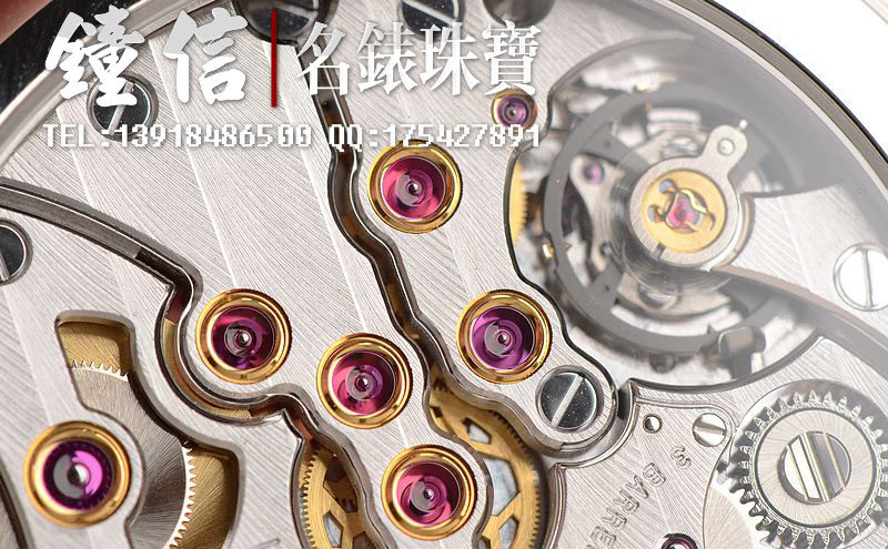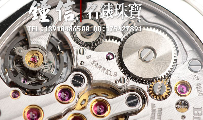 JB自产的CAL.13R1型机芯,手动机械,由211个零件组成,3个发条盒,极其精致日内瓦条纹打磨,倒角抛光修饰。最顶级的黄金套筒配置,28钻,摆频28800,5方位校正,动力储存约192小时,八天链长动力机芯。走时状态极佳。