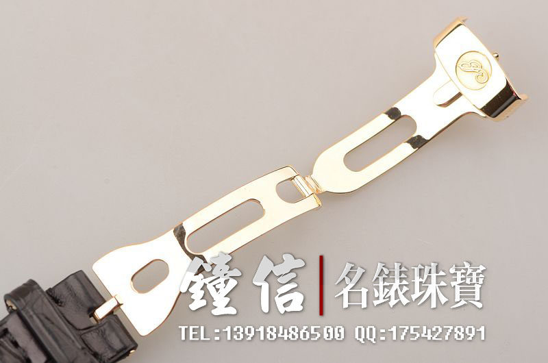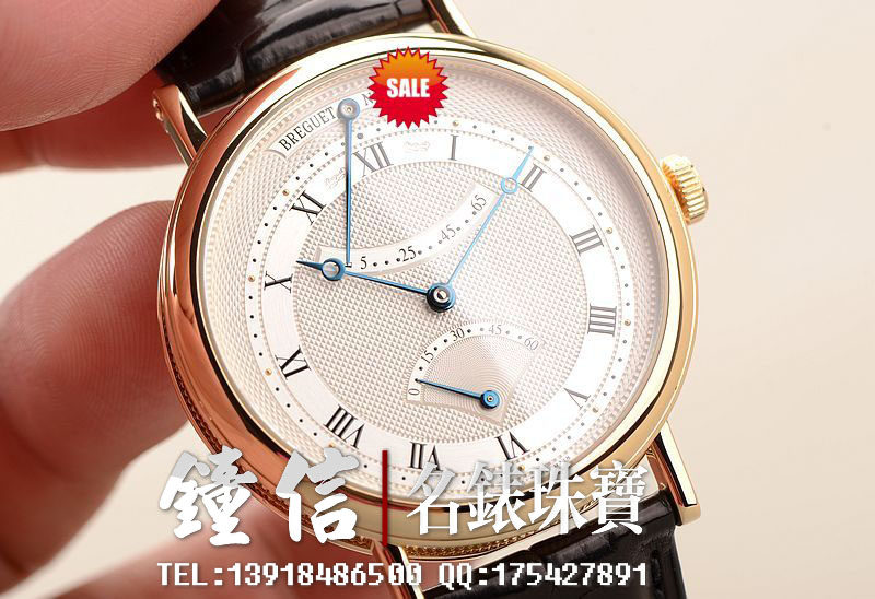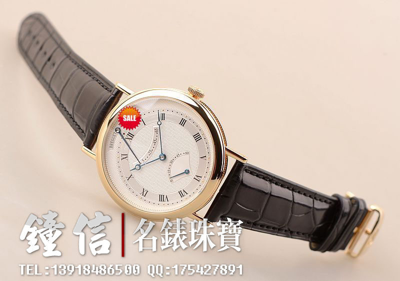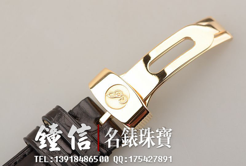 18K黄金宝玑钱币纹表壳及折叠式表扣,圣伯纳狗头印记。后配全新黑色鳄鱼皮表带。蓝宝石水晶镜面及底盖,立体白金镀银表盘,黑色罗马字刻度,宝玑蓝钢指针,动储显示及秒针逆跳功能。口径39MM*9.85MM。防水30M。