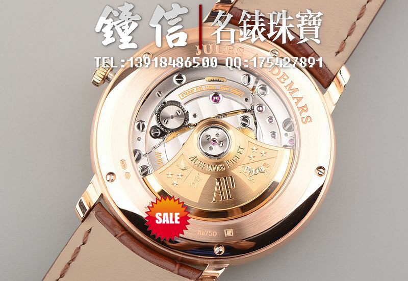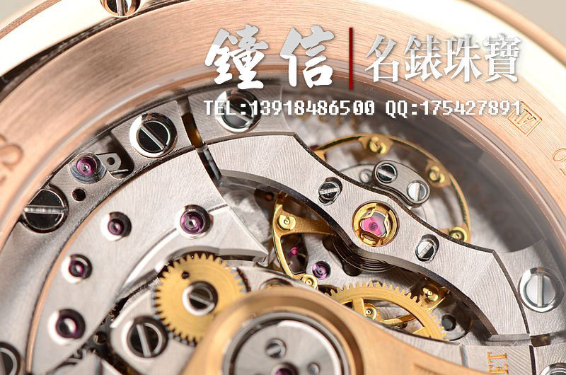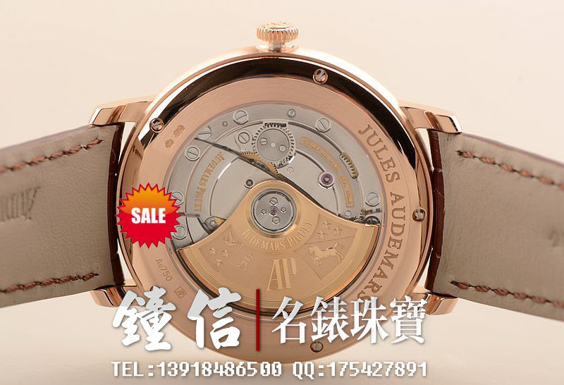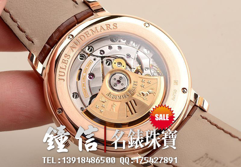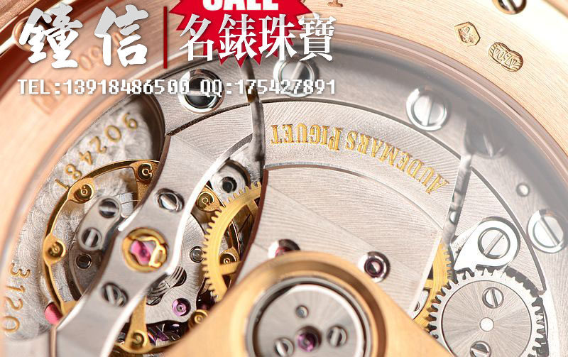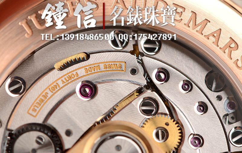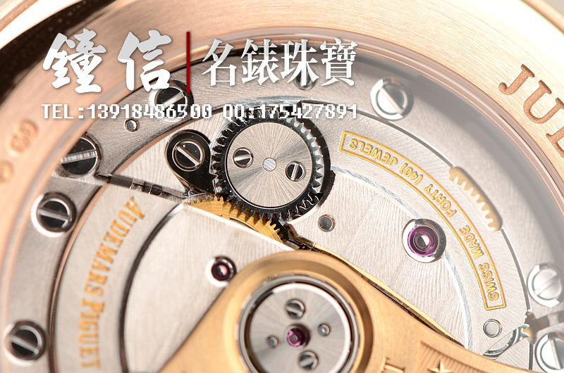 AP自产的CAL.3120型机芯,顶级自动机械机芯,极其精致日内瓦条纹打磨,倒角抛光修饰。有280个零件组成,40钻,摆频21600,18K玫瑰金镌刻自动转陀。动力储存约60小时,机芯有独立签署。走时状态极佳。