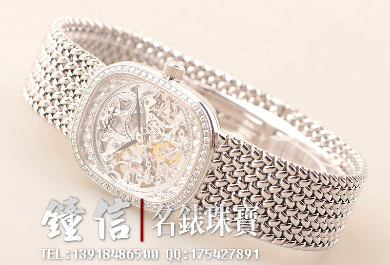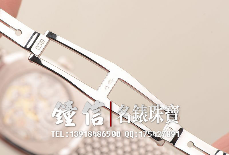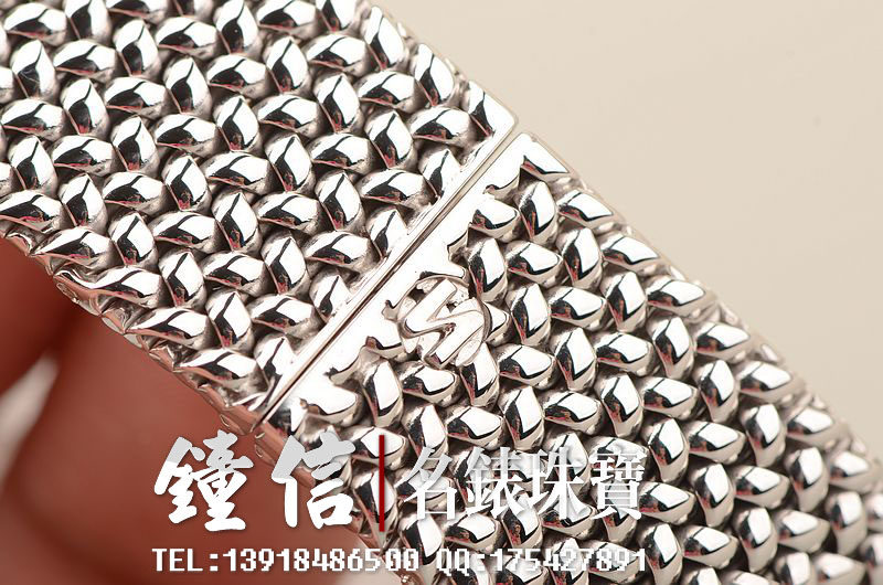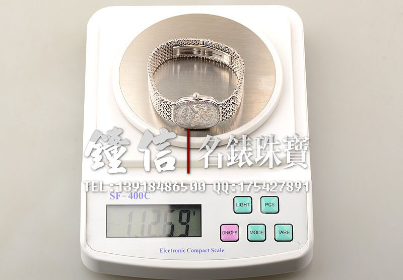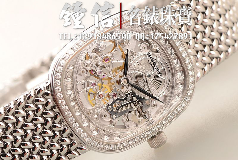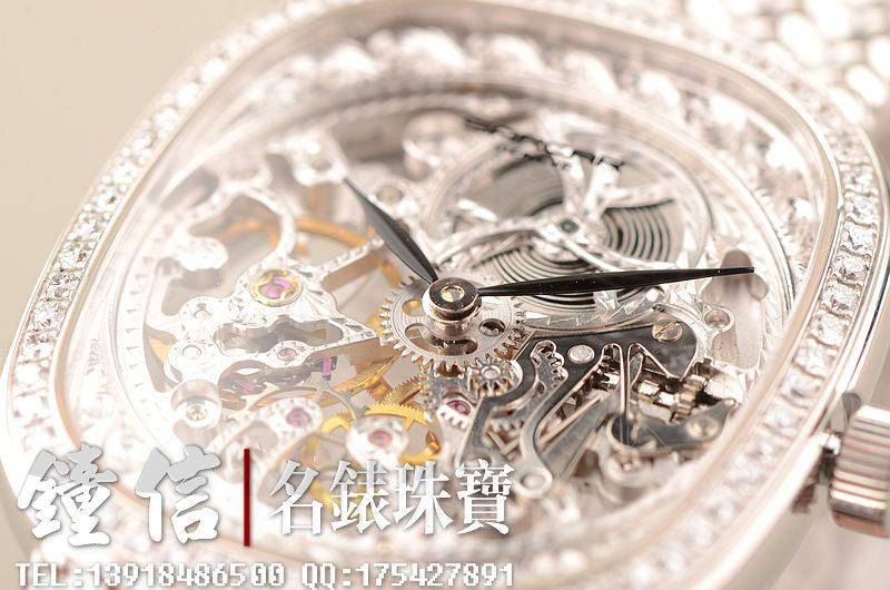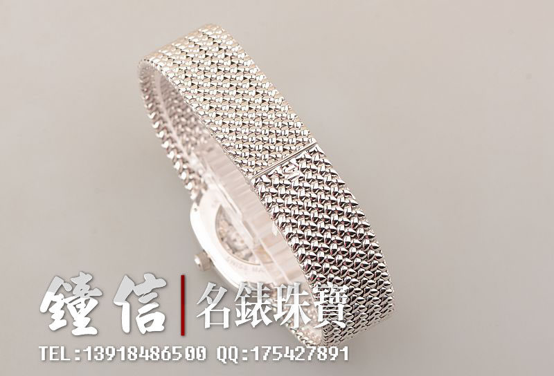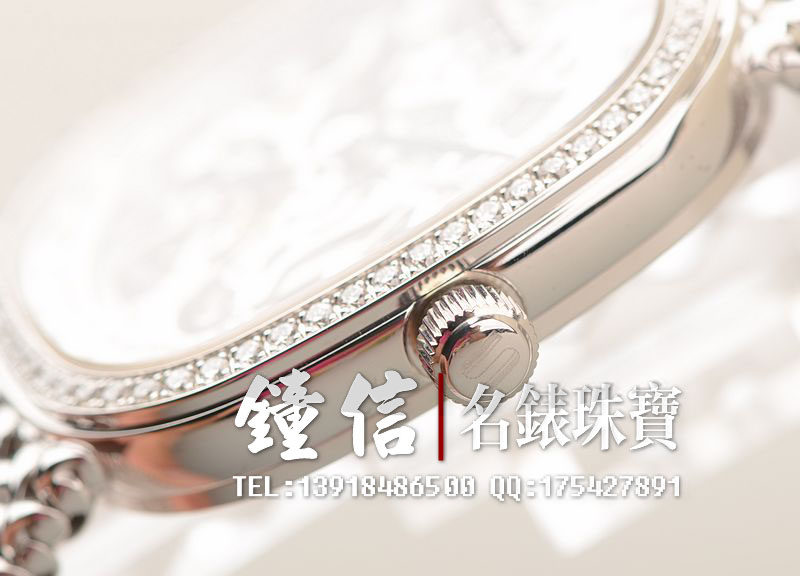 18K白金表壳及编制链带,18K白金折叠表扣。圣伯纳狗头印记。表框镶嵌原厂天然美钻,镂空表盘,白金镀铑指针,口径34MM*29MM*7MM,相当于圆表33MM左右大小。古典隽永,大气豪华。防水30M。