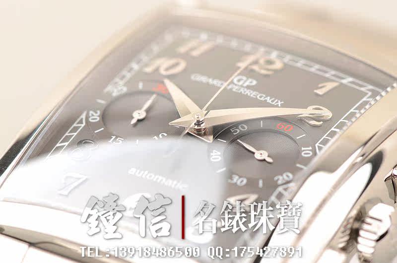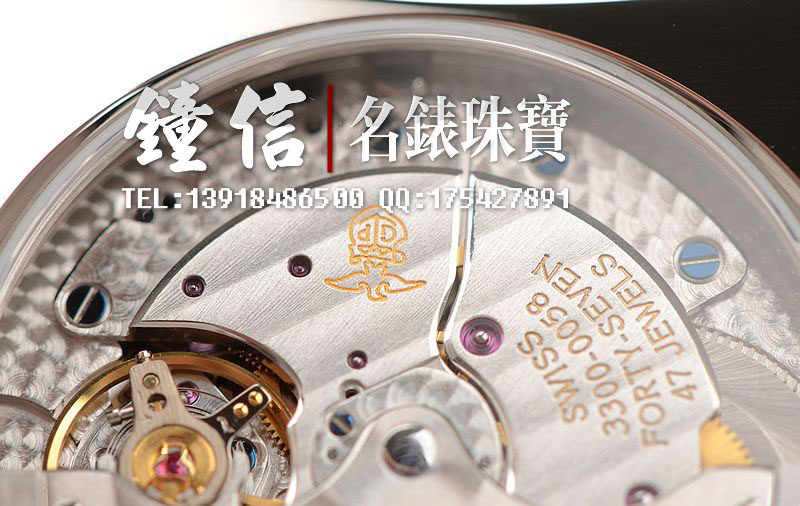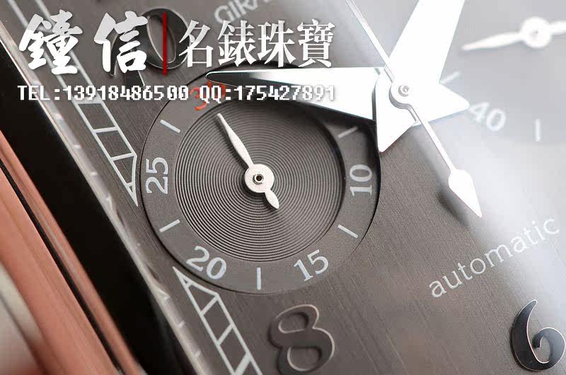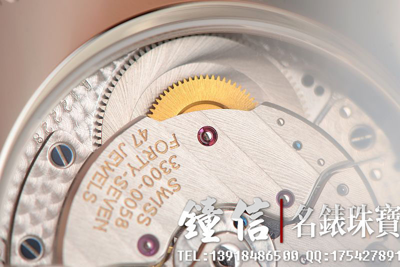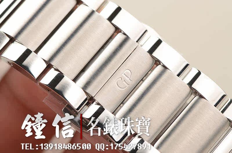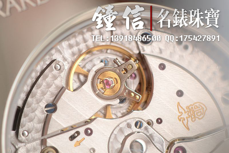 GP自产CAL.GP03300-0058机芯,自动机械。倒角抛光修饰,日内瓦条纹及鱼鳞纹相结合的打磨让整个机芯显得尤为美观和精致。47钻,摆频28800,动力储备约46小时。走时状态极佳。