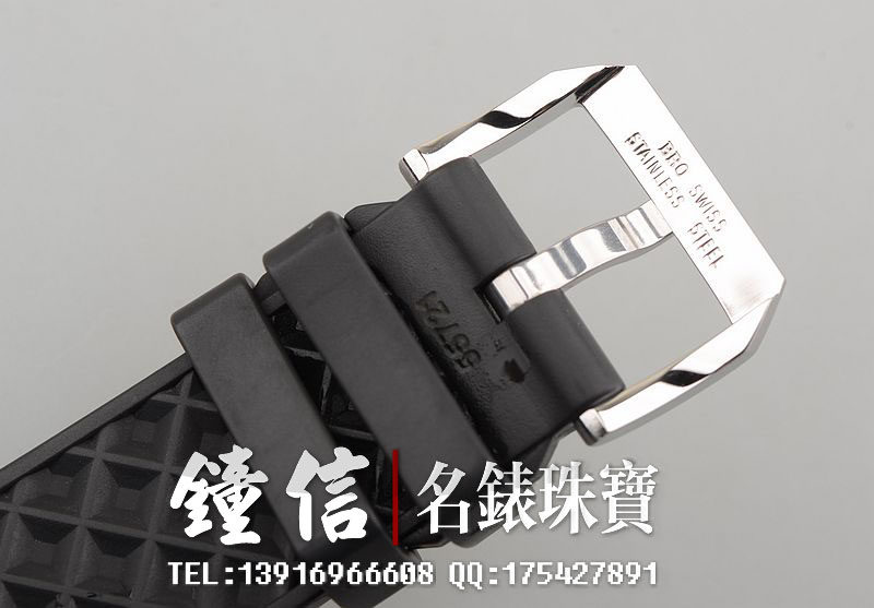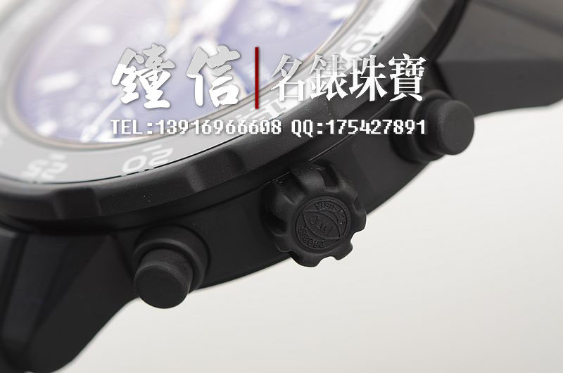 精钢表壳及表扣,表壳及表把镀有黑色硫化橡胶涂层。原厂黑色橡胶表带。黑白双色旋转计时表圈。减光镀膜蓝宝石水晶镜面,精致的加拉帕戈斯象龟浮雕底盖。立体黑色计时表盘。12点位30分钟计时功能,9点位独立小秒针,6点位12小时计时功能。3点位星期日历视窗。指针,刻度均有夜光。旋入式防水表把。口径44MM*15MM。防水120M。