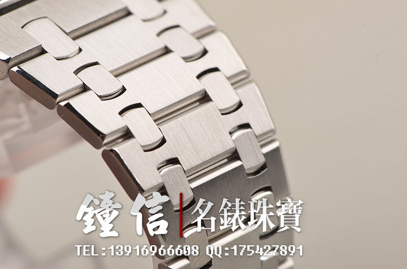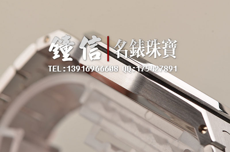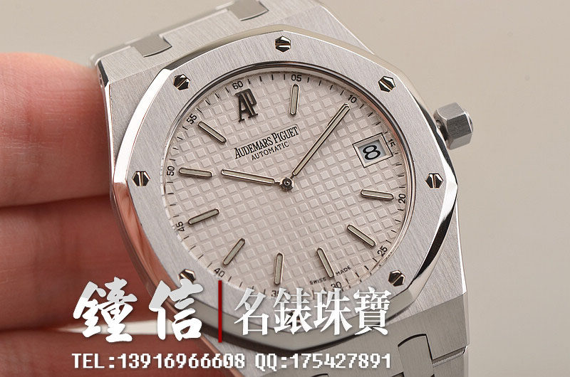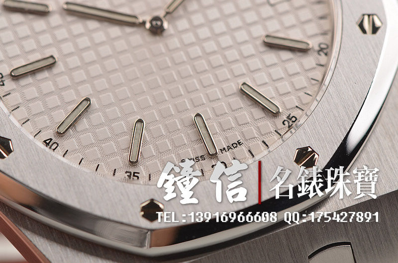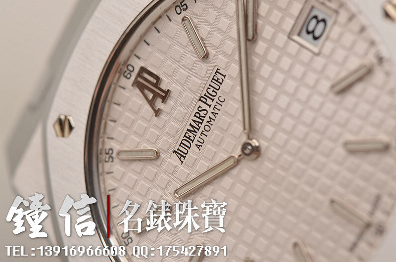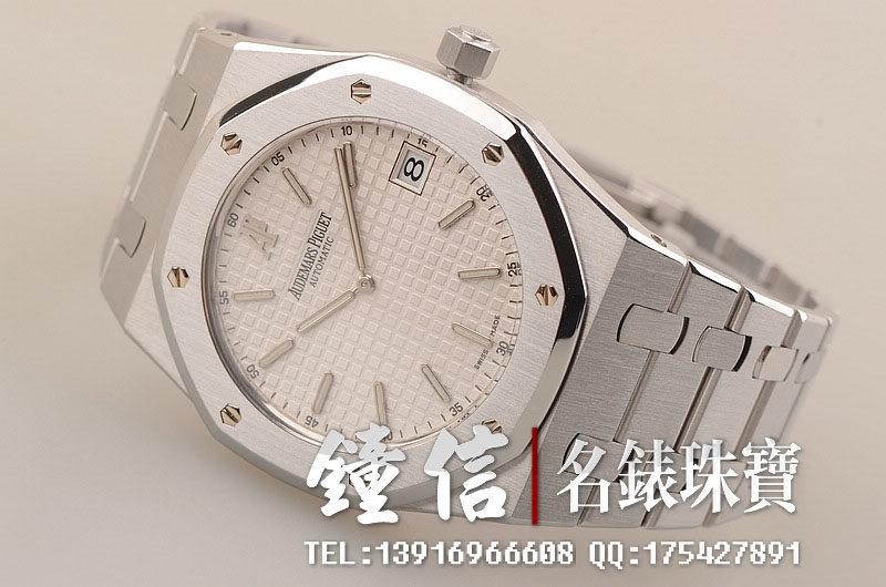 精钢八角皇家橡树表壳及链带,折叠式表扣。前后盖白金螺丝。蓝宝石水晶镜面及底盖,银色表盘镌刻Grande Tapisserie 大格纹装饰图案,搭配白金荧光立体时标和皇家橡树指针。3点位日历显示功能。口径39MM*8.1MM。防水50M。