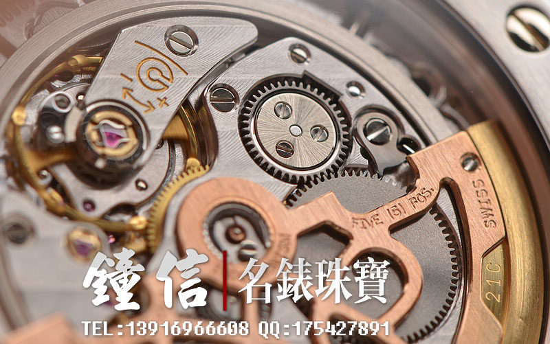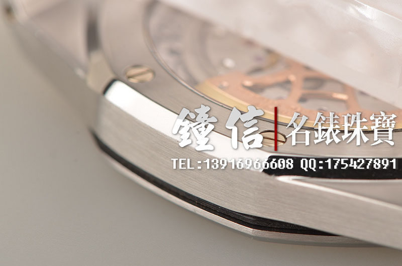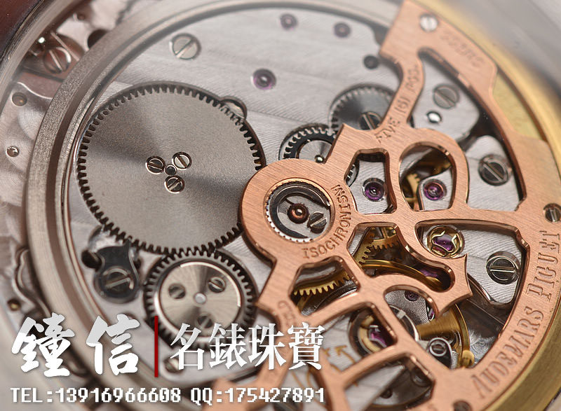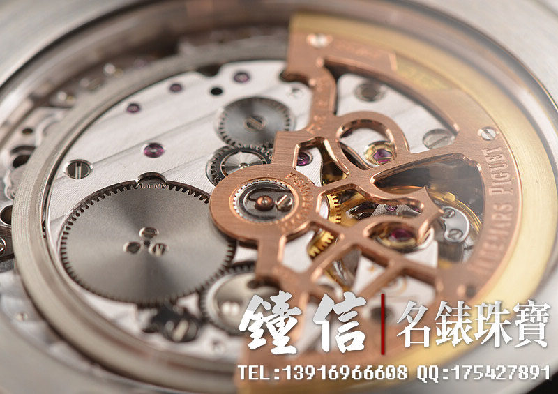 AP自产高级CAL.2121型机芯,自动机械,极其精致日内瓦条纹打磨,倒角抛光修饰。由247个零件组成,36钻,摆频19800,动力储存约40小时,5方位校正,21K玫瑰金镌刻自动转陀。走时状态极佳。