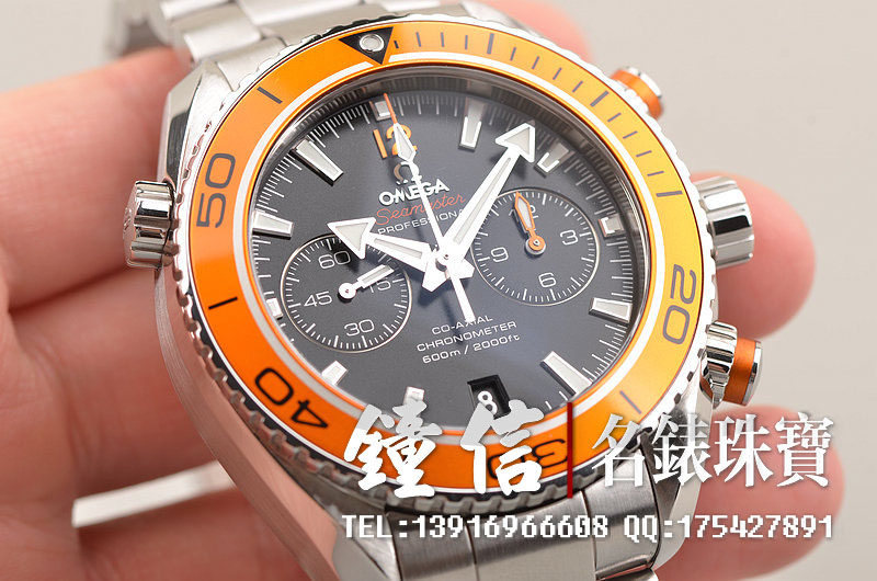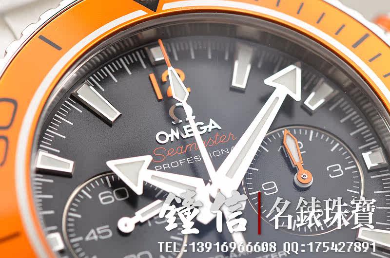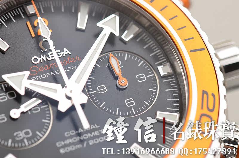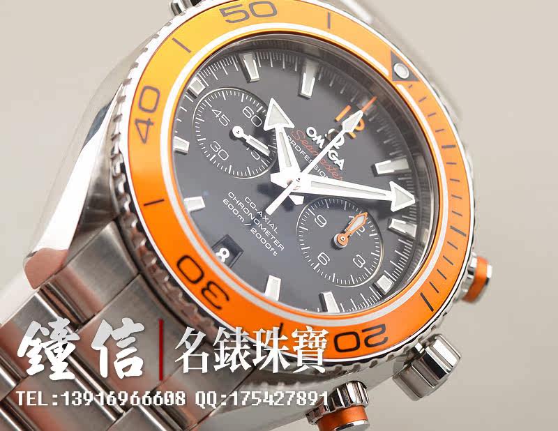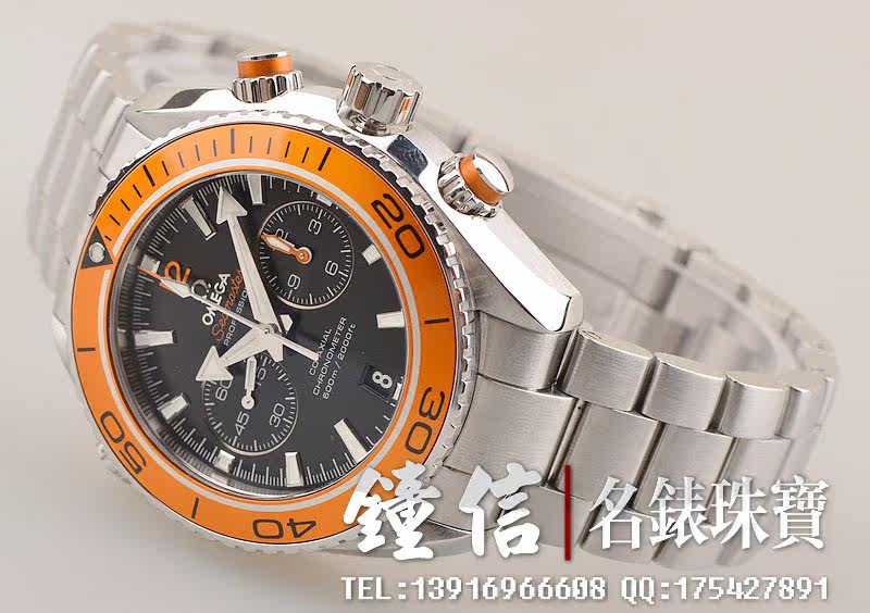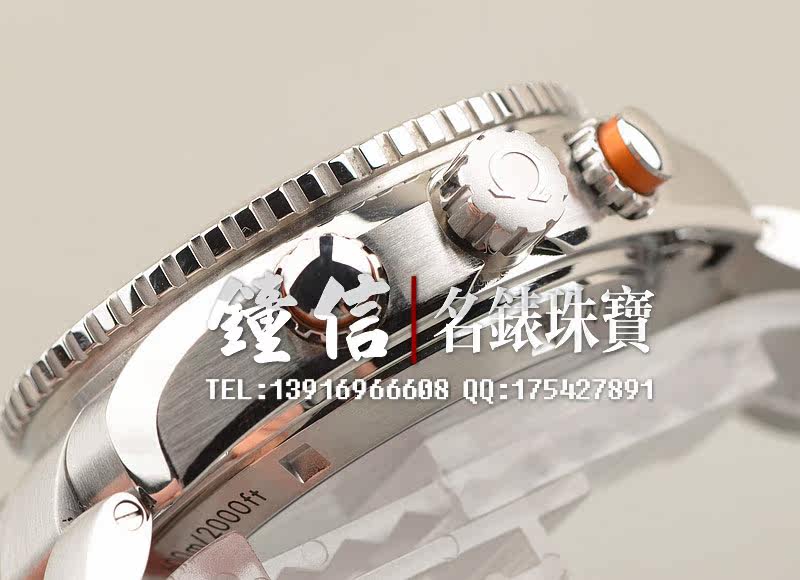 精钢表壳及链带,折叠式表扣。炫酷醒目橙色计时表圈及计时按钮,蓝宝石水晶镜面,立体黑色计时表盘,夜光刻度及指针,9点位独立小秒针,3点位12小时,6点位日历显示功能。旋入式防水表冠。10点位排氦气阀装置。口径45.5MM*17MM。防水深达600M。