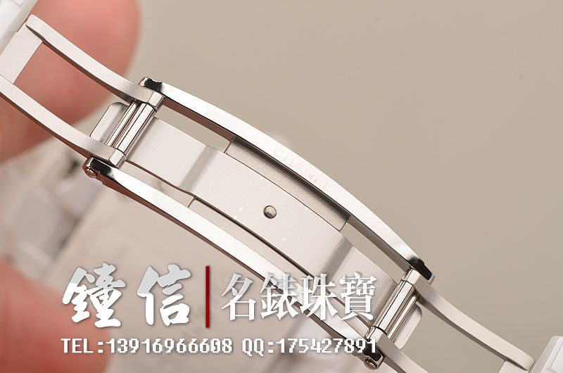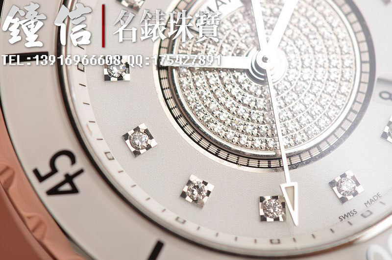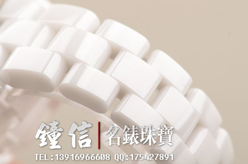 高科技白色陶瓷表壳及链带,双向按压式折叠扣表扣。蓝宝石水晶镜面,表盘镶嵌12颗钻石时标,表盘中央铺镶108颗钻石(约重0.21克拉),夜光时分针,4点位日历显示功能,旋入式防水表冠。口径33MM*10MM。防水200M。