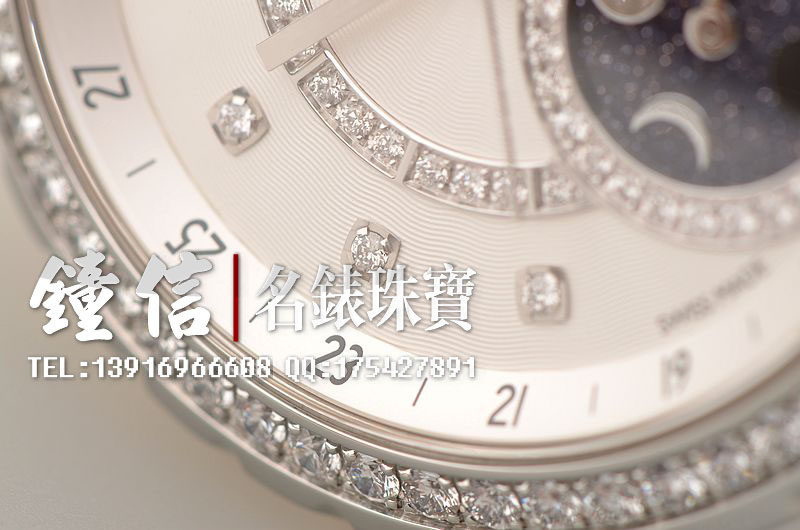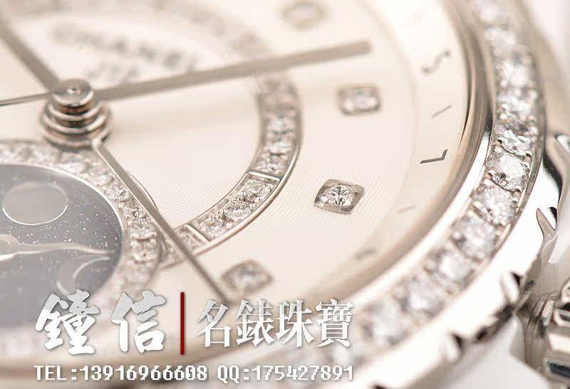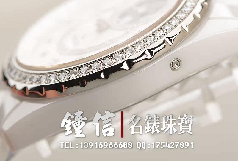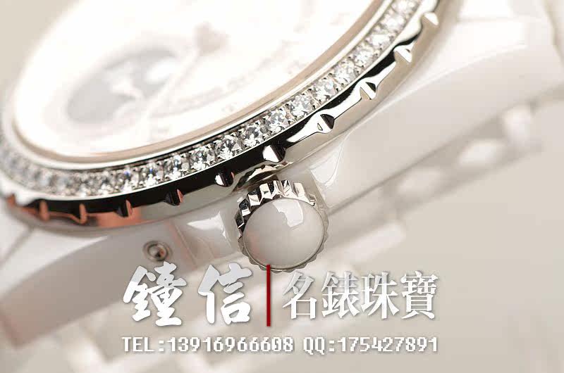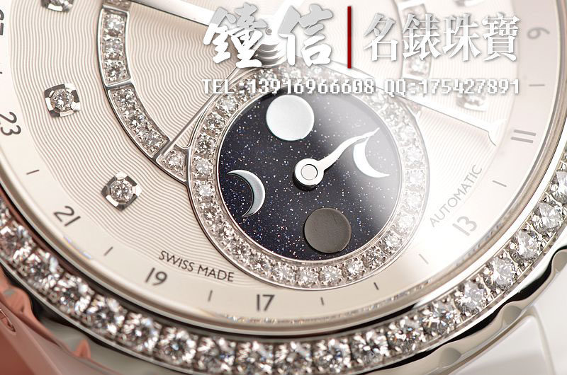 高科技白色陶瓷表壳及链带,双向弹簧按压式折叠表扣。蓝宝石水晶镜面,表圈镶嵌54颗明亮式切割圆钻(约重1.42克拉)乳白色雕纹表盘,镶嵌63颗明亮式切割圆钻(约重0.34克拉),搭配砂金石小表盘,指针式日历,指针式月龄月相显示(经由表壳侧面调校孔调校)。口径38MM*12MM,防水50M。