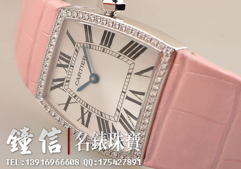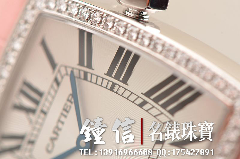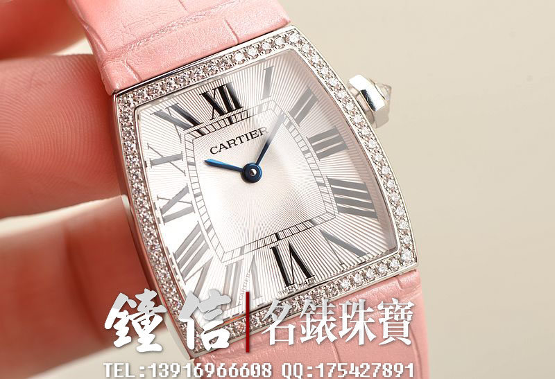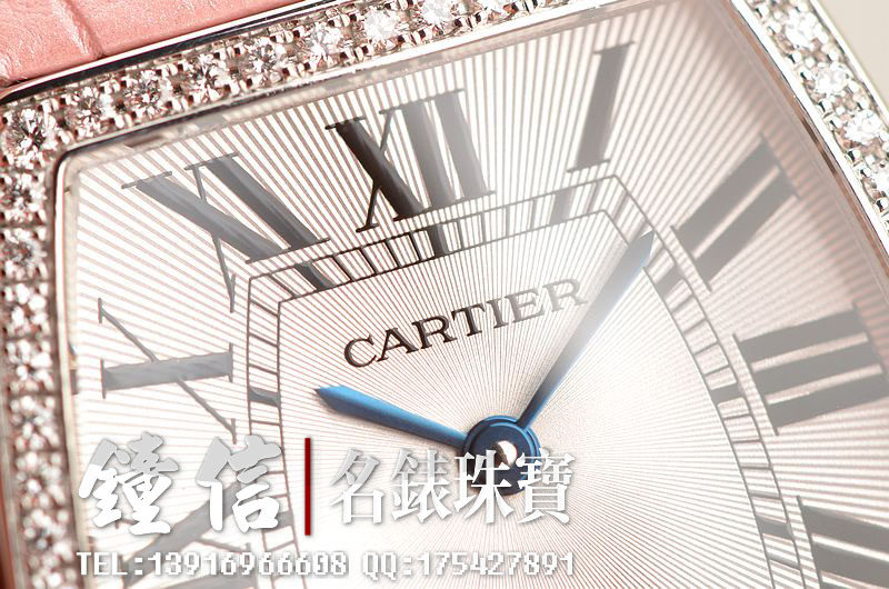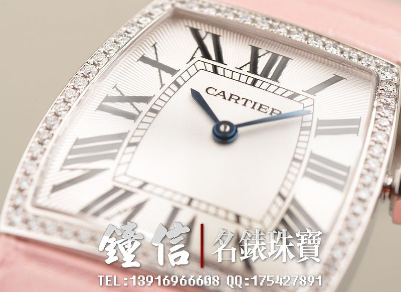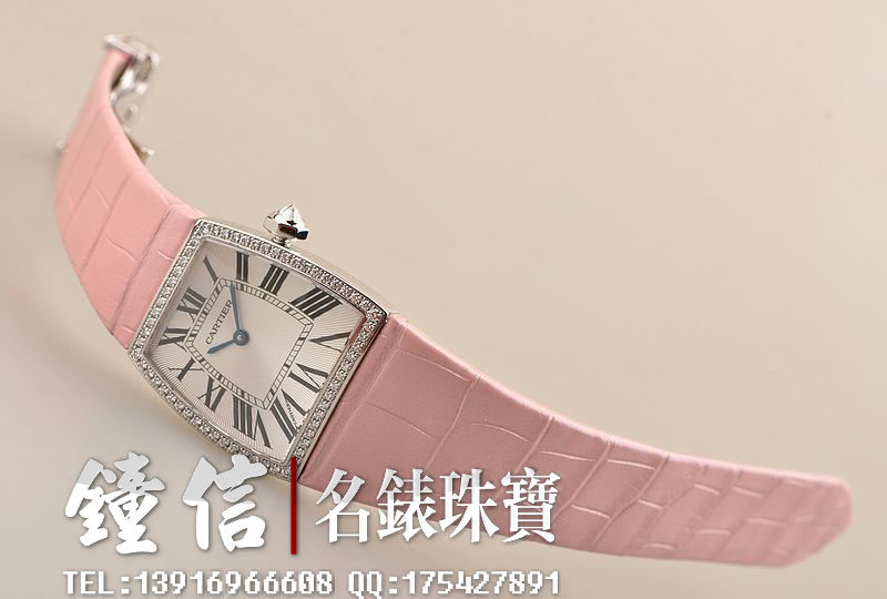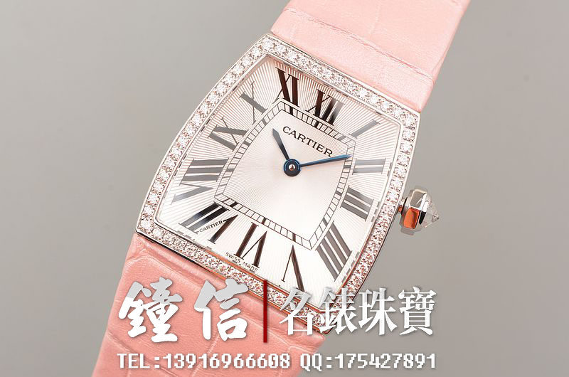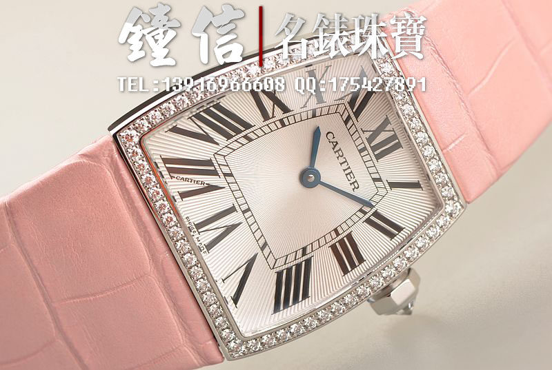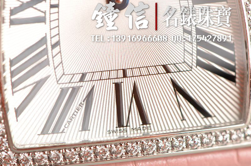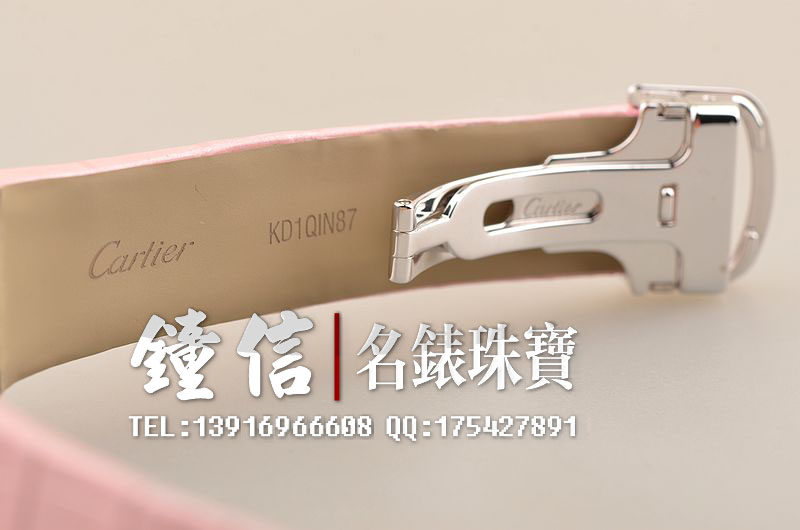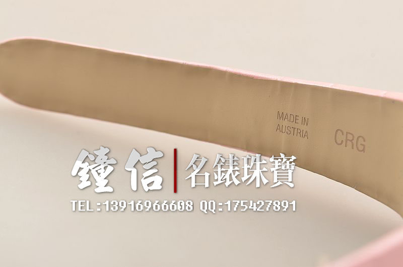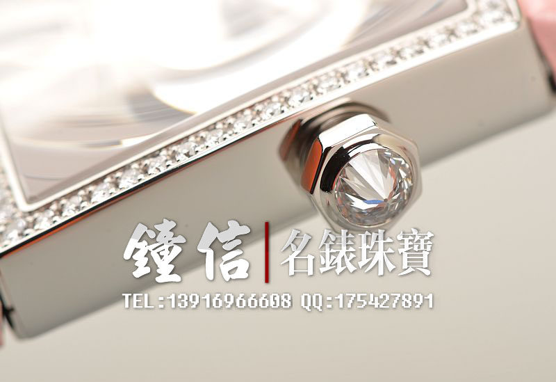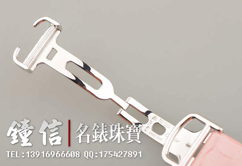 18K白金表壳及折叠式表扣,圣伯纳狗头印记。表框镶嵌原厂天然美钻,表冠镶嵌一颗大钻。后配全新亮光粉色鳄鱼皮表带。立体银白色放射纹表盘,黑色罗马字刻度,蓝钢指针。口径29MM*26.3MM*6.89MM,相当于圆表31MM左右大小。防水30M。