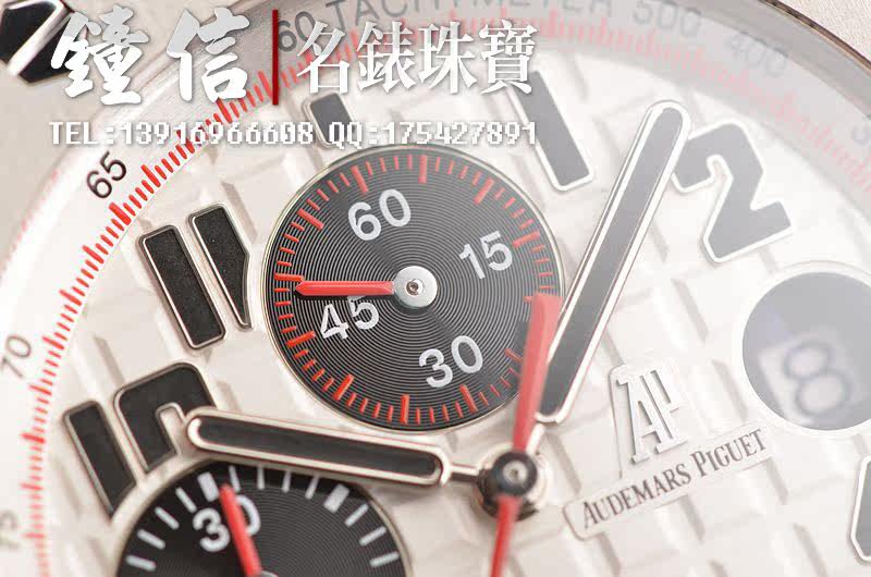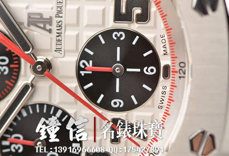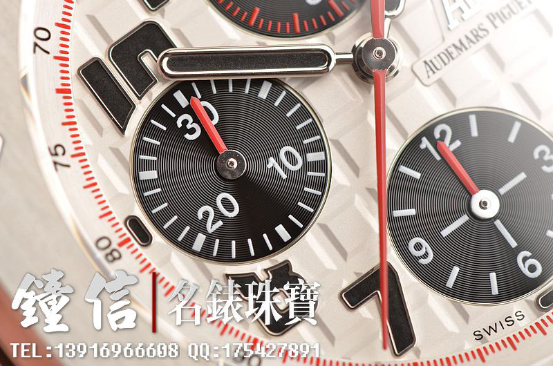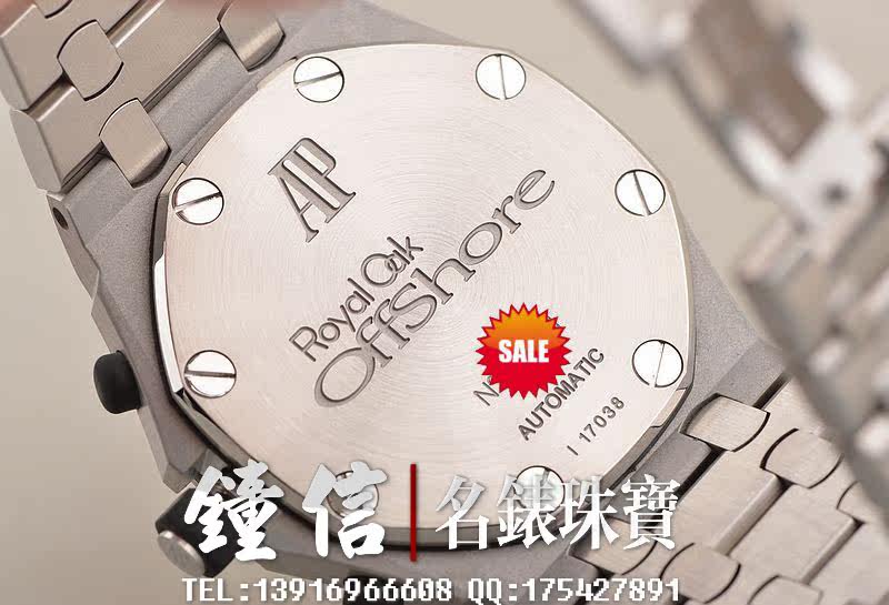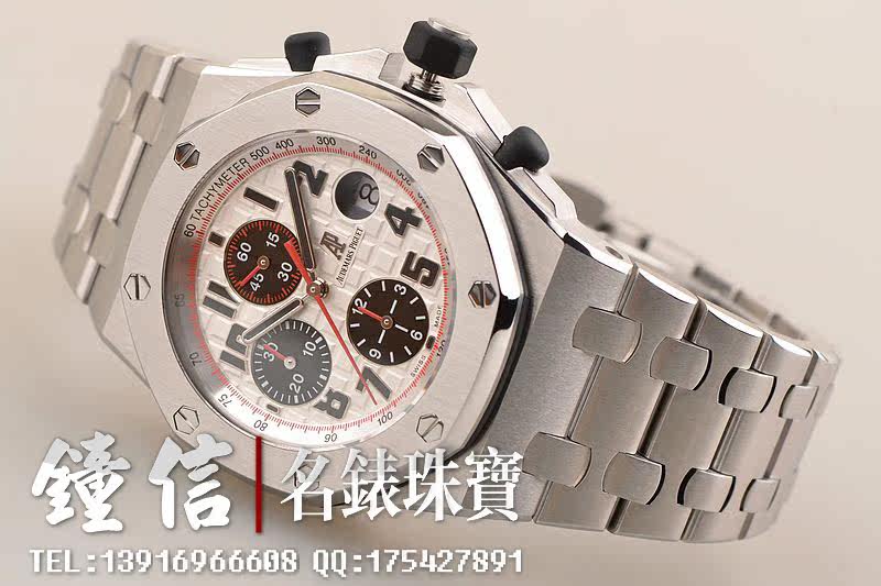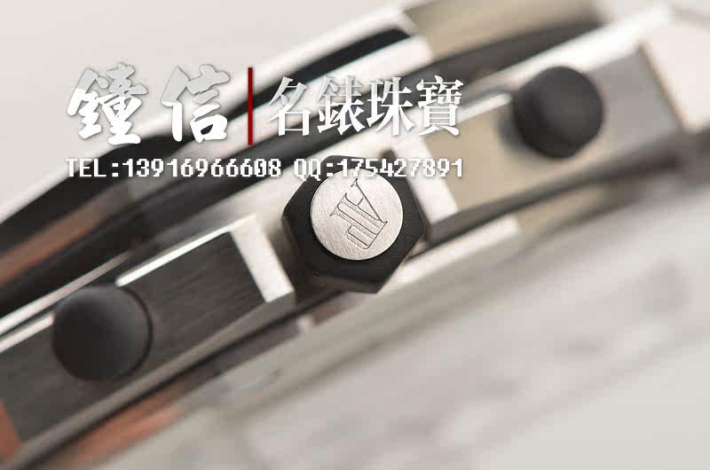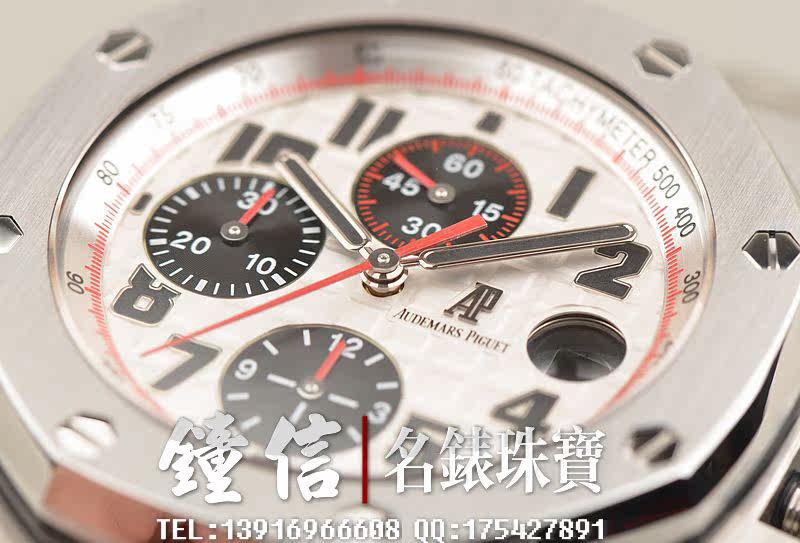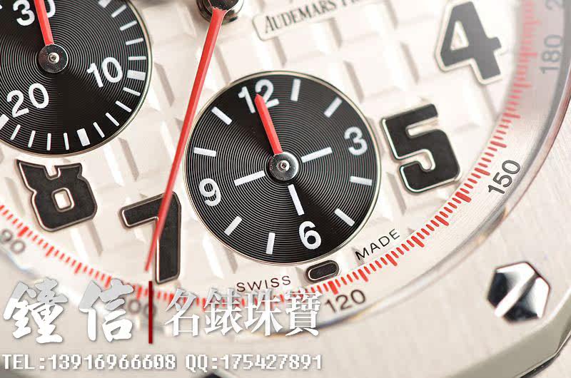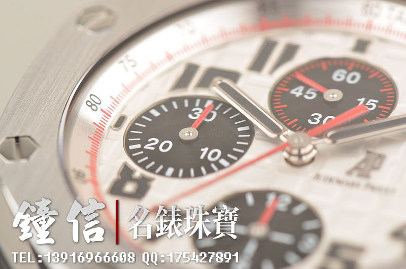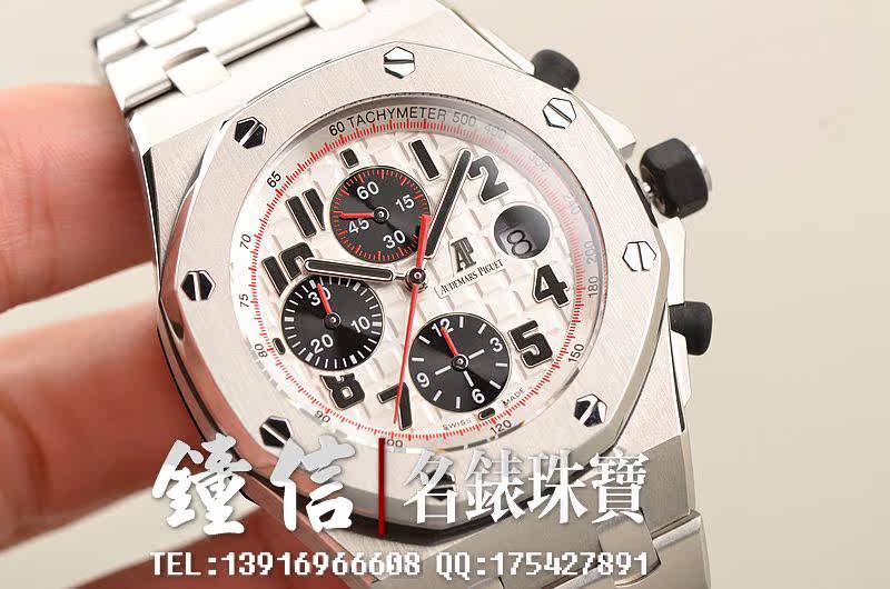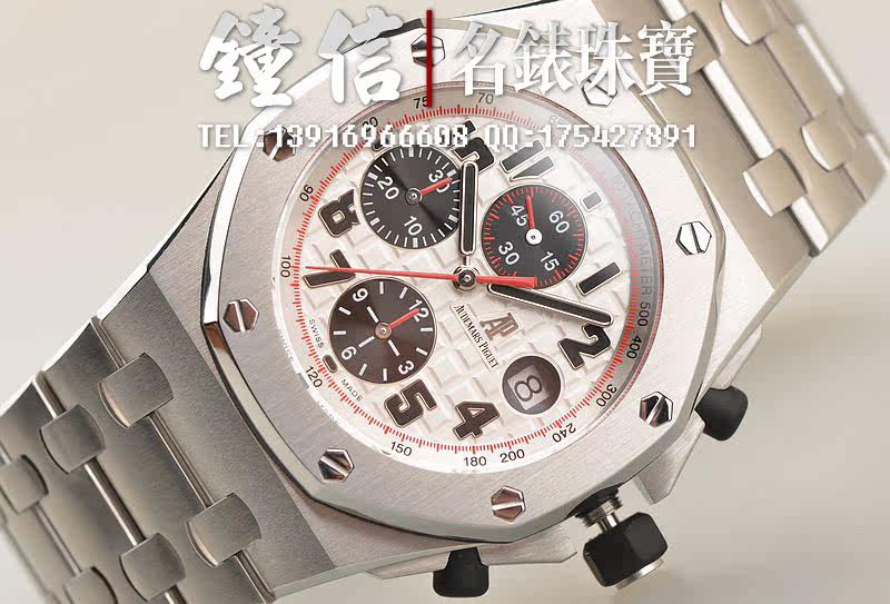 精钢八角形皇家橡树表壳及链带,双向按压式折叠保险扣。前后盖白金螺丝。蓝宝石水晶镜面,立体黑白华夫格PANDA熊猫表盘,12点位独立小秒针,9点位30分钟计时,6点位12小时计时,3点位放大镜日历视窗。旋入式防水表把。口径42MM*54MM*14.3MM。相当于圆表44MM左右大小。防水100M。
