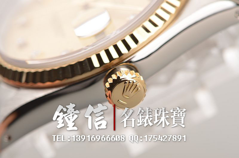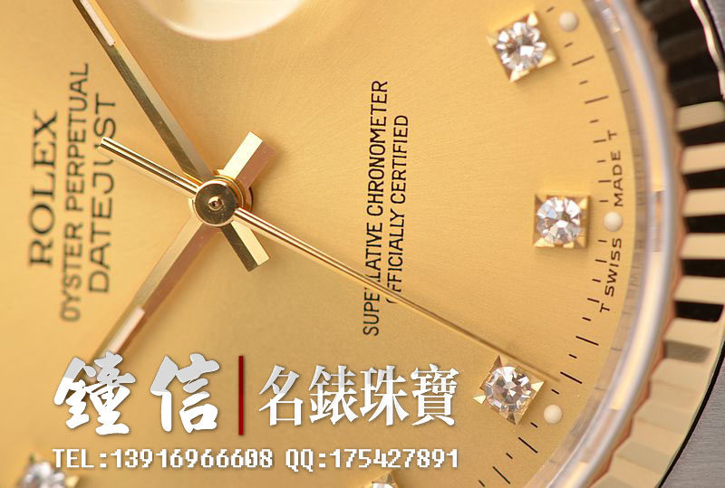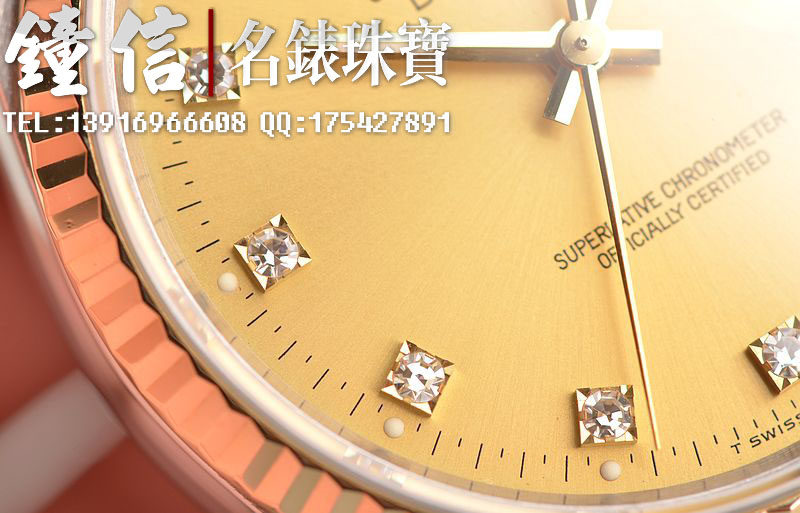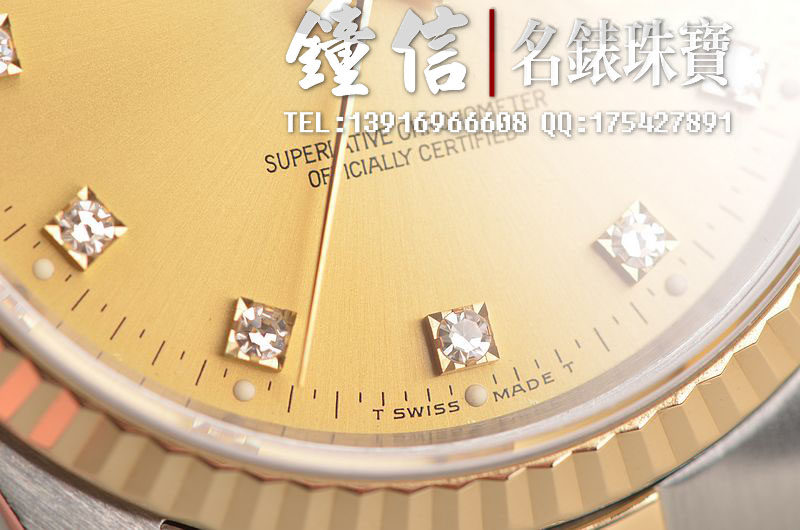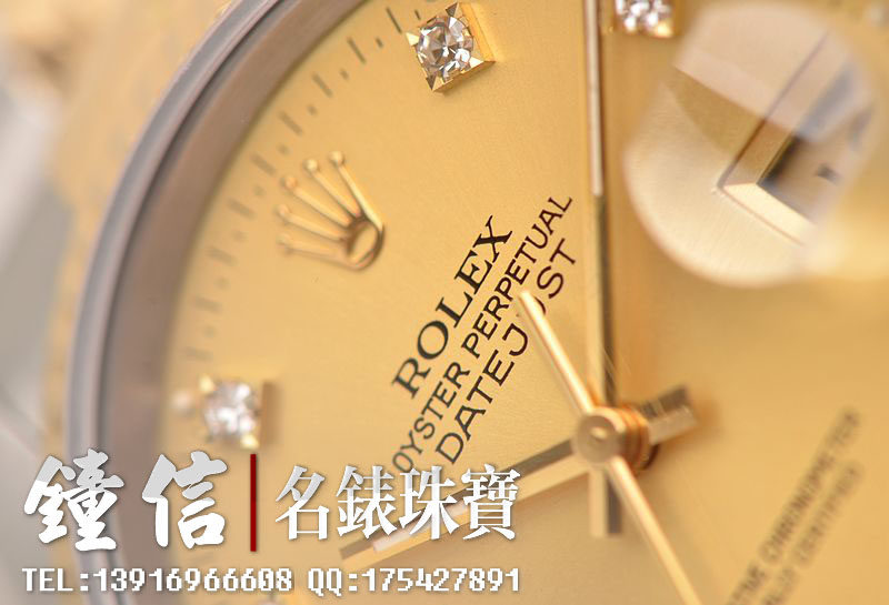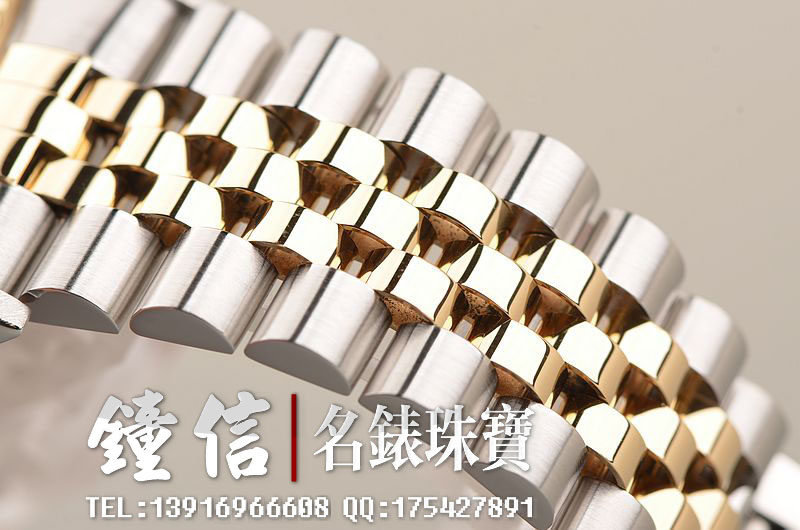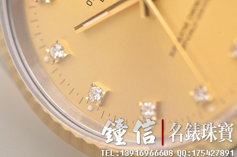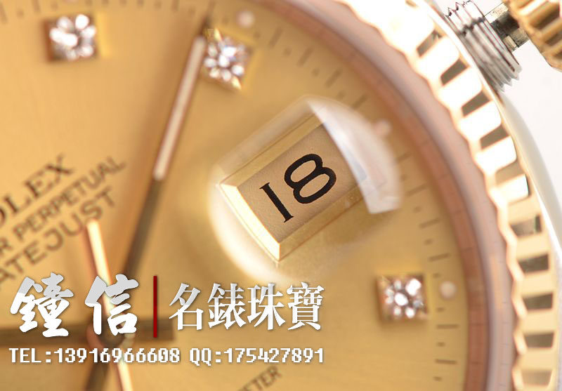 18K黄金及钢表壳及链带,18K三角坑纹黄金表圈,18K黄金及钢五铢链带,折叠式表扣。黄金指针,立体香槟金色表盘,原厂天然美钻刻度,蓝宝石水晶镜面,放大镜日历视窗。18K黄金旋入式防水锁把。口径36MM*10MM。防水100M。