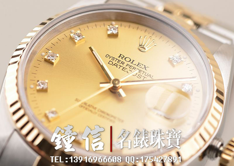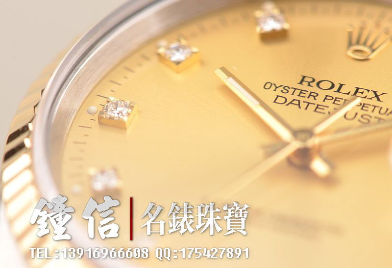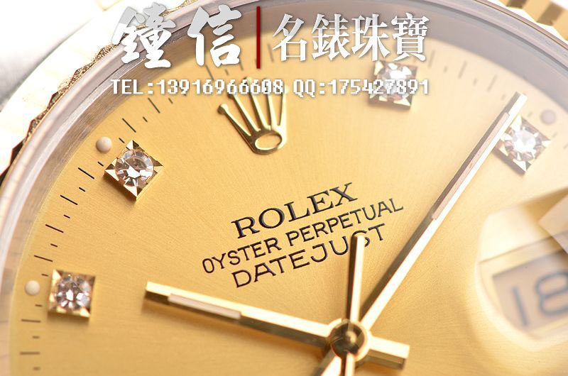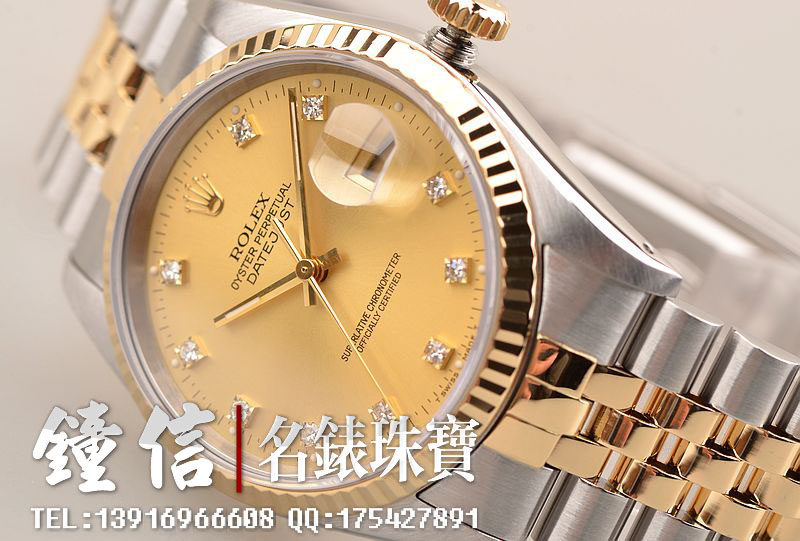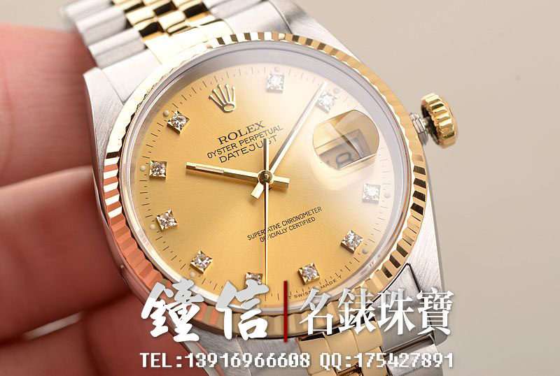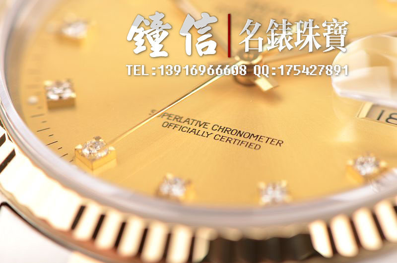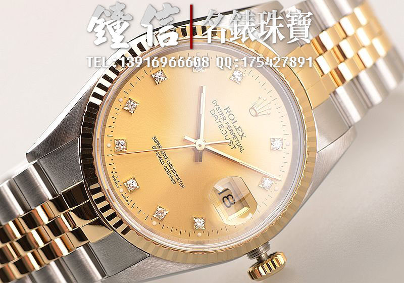 18K黄金及钢表壳及链带,18K三角坑纹黄金表圈,18K黄金及钢五铢链带,折叠式表扣。黄金指针,立体香槟金色表盘,原厂天然美钻刻度,蓝宝石水晶镜面,放大镜日历视窗。18K黄金旋入式防水锁把。口径36MM*10MM。防水100M。
