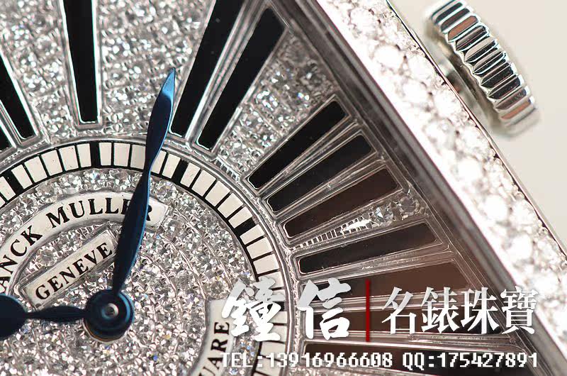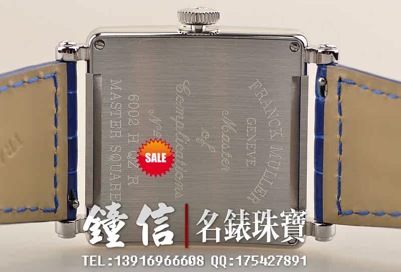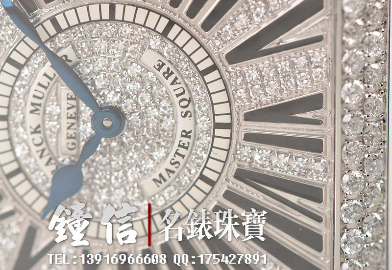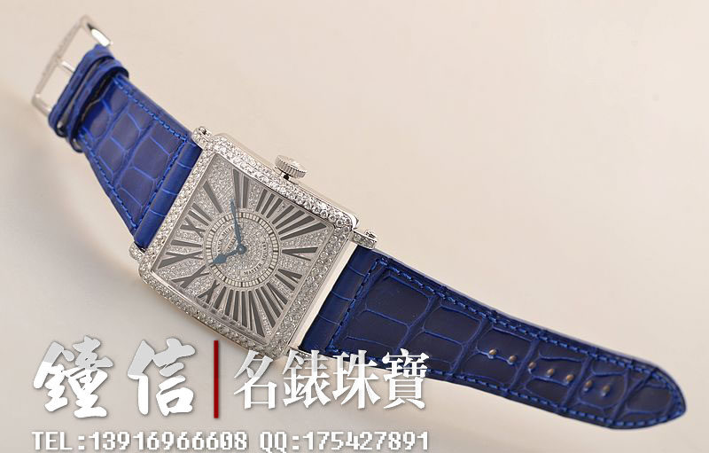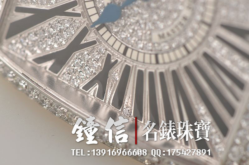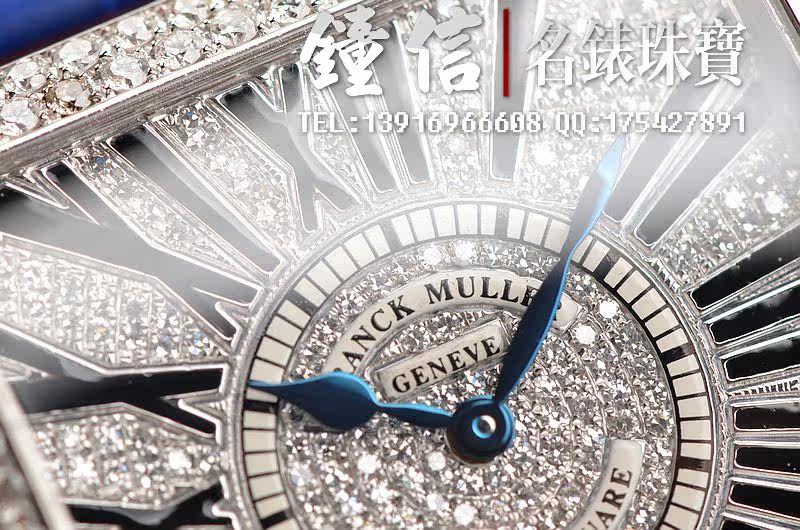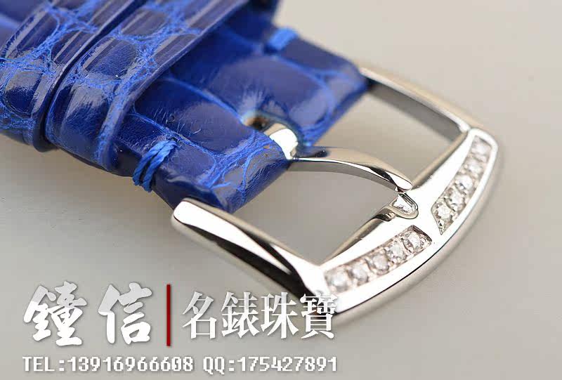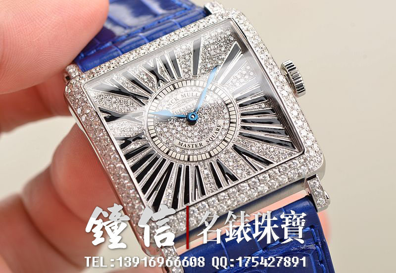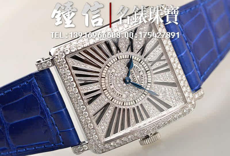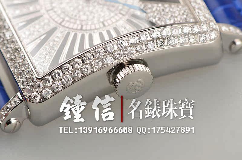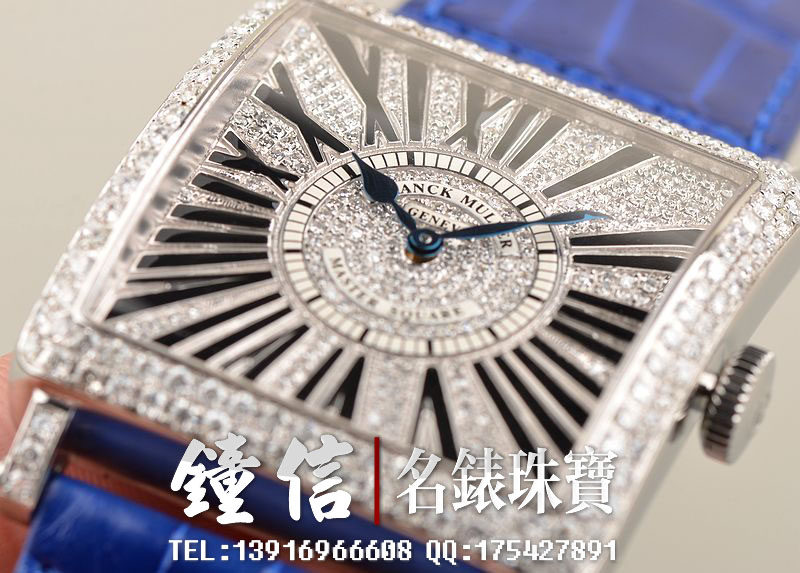 精钢表壳及表扣,表框,表耳及表盘密镶满天星天然豪华美钻(后镶)。后配全新蓝色短吻鳄鱼皮表带。蓝宝石水晶镜面,蓝钢桃心指针,黑色罗马字刻度。口径46MM*36.5MM*10MM,相当于圆表41MM左右大小。男女皆可佩戴,无性别。防水30M。