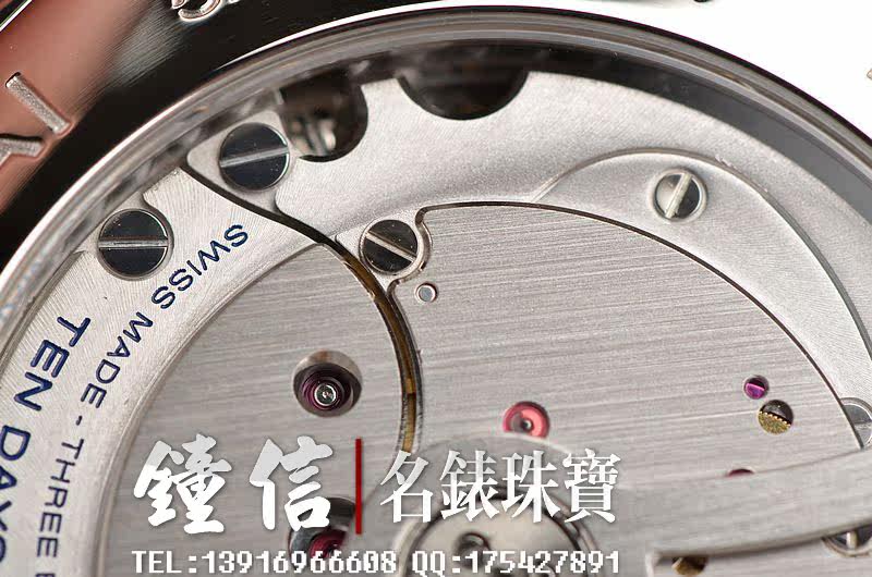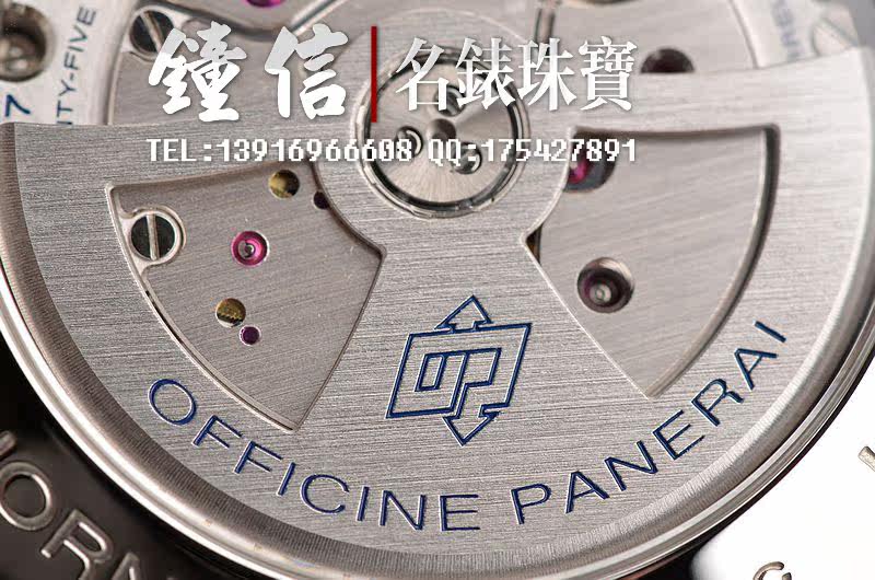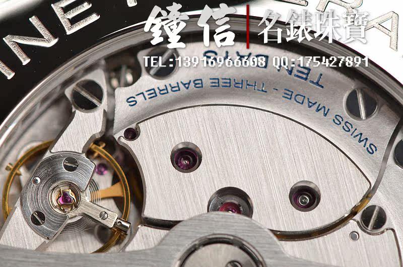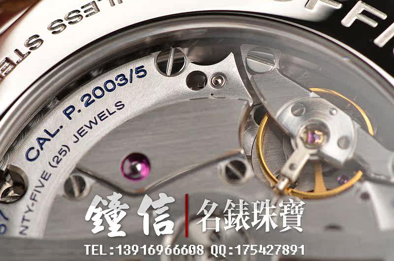 沛纳海自产CAL.P2003/5型机芯,高级自产芯,自动机械,由356个零件组成,极其精致日内瓦条纹打磨,倒角抛光修饰。3个发条盒,双导柱轮,25钻,摆频28800,动力储存高达240小时,十天链。机芯独立签署,走时状态极佳。