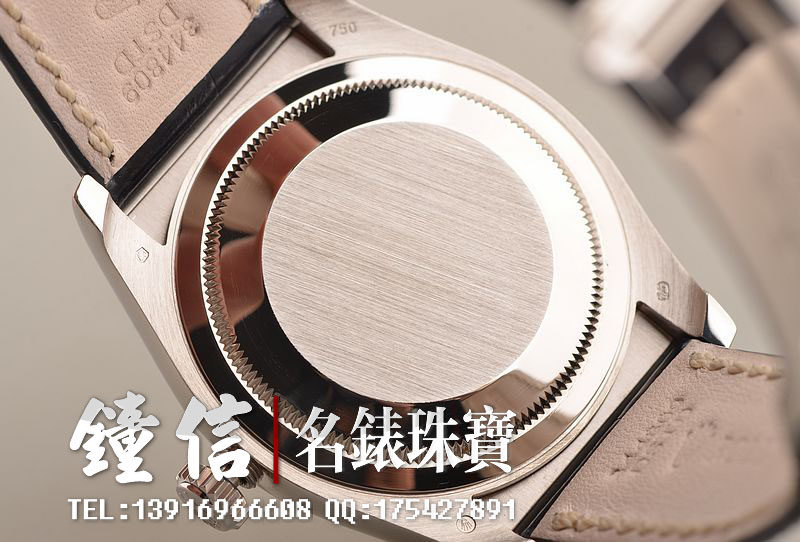 18K白金表壳及折叠式表扣,圣伯纳狗头印记。18K白金三角坑纹表圈。原厂深蓝色鳄鱼皮表带成色很新。蓝宝石水晶镜面,少见立体银白色表盘配以蓝色阿拉伯数字刻度,白金夜光指针,3点位放大镜日历视窗显示功能。旋入式防水表冠。口径36MM*12MM。防水100M。