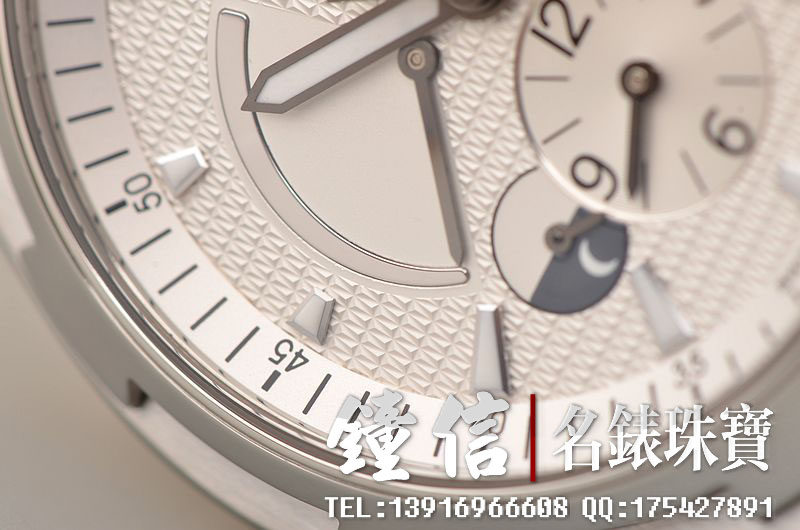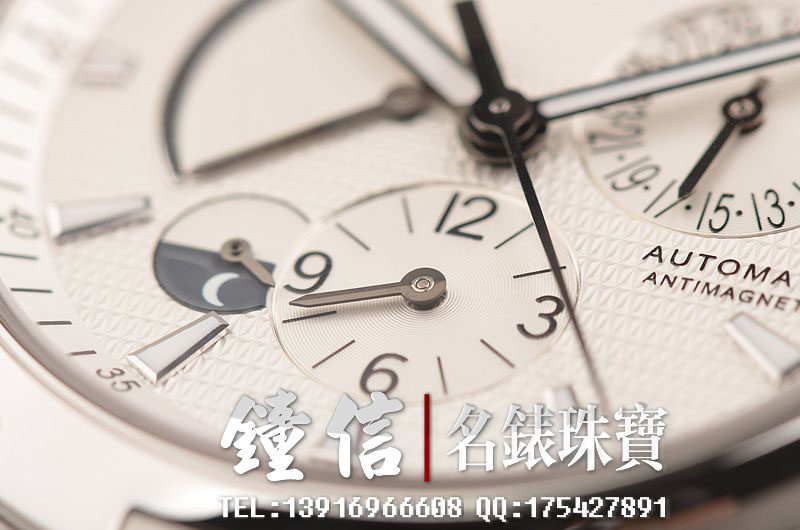 精钢表壳及三角立体铸造链带,双向折叠式表扣。蓝宝石水晶镜面,立体白色表盘,指针式动能储备显示,指针式日历,GMT第二时区及昼夜显示功能。旋入式防水表冠。精美的扬帆出海雕刻底盖。口径42MM*12.45MM,防水150M。