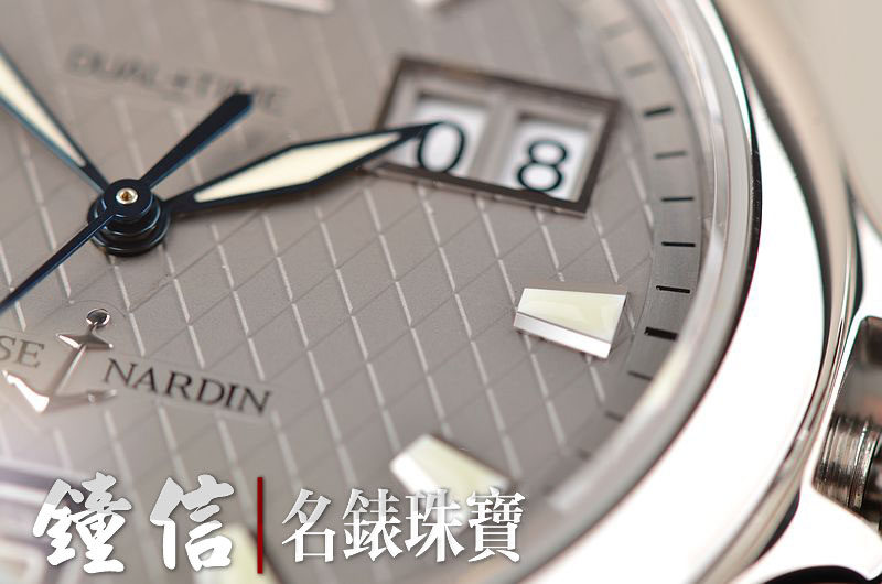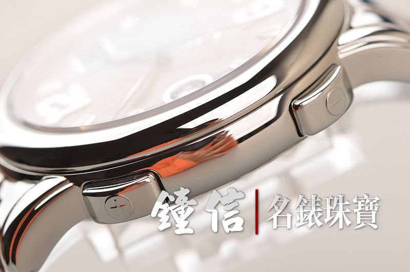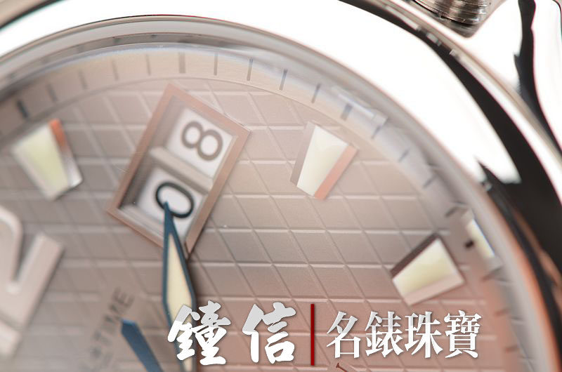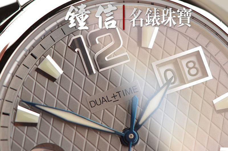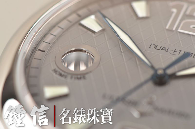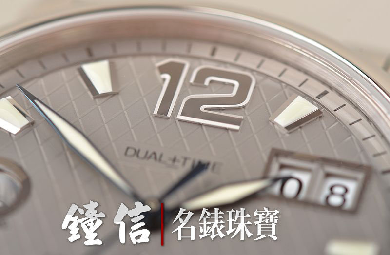 精钢表壳及链带,折叠式表扣,蓝宝石水晶镜面及底盖。立体灰色表盘,夜光刻度及时分针,两点位大日历视窗,9点位第二时区数字显示,表壳侧面10点和8点位分别有当前时区的小时快调按钮。口径40MM*11.8MM。旋入式防水表冠。防水100M。