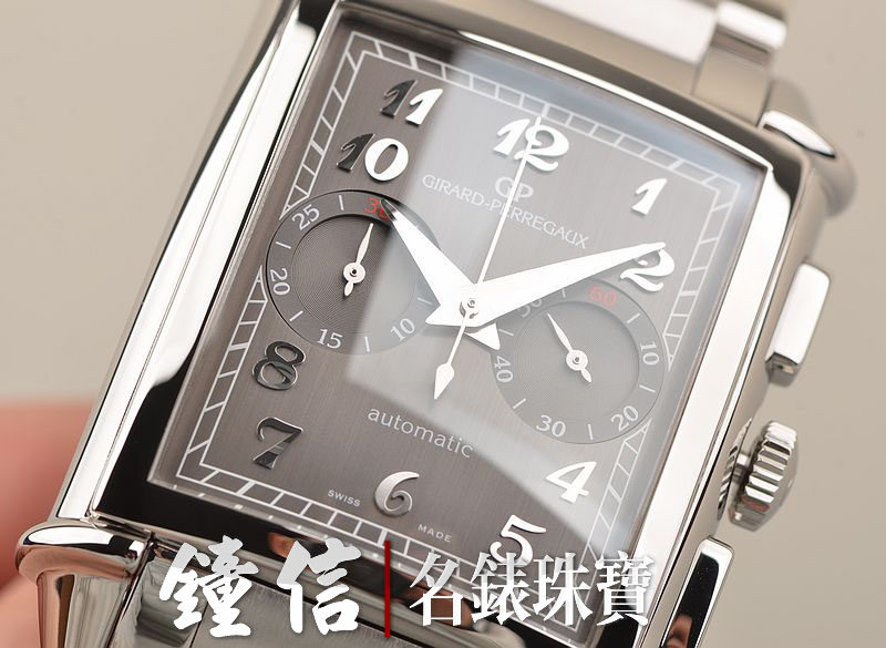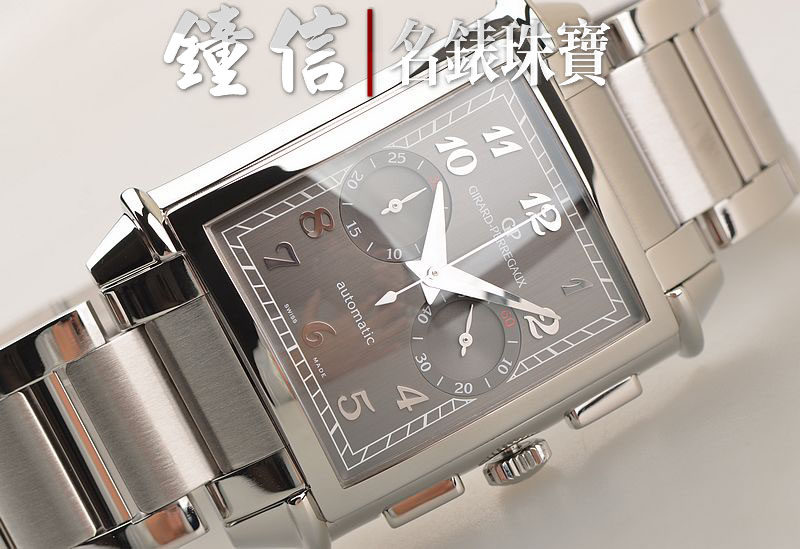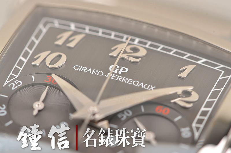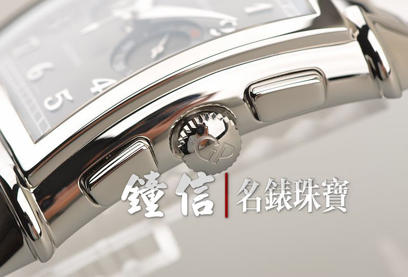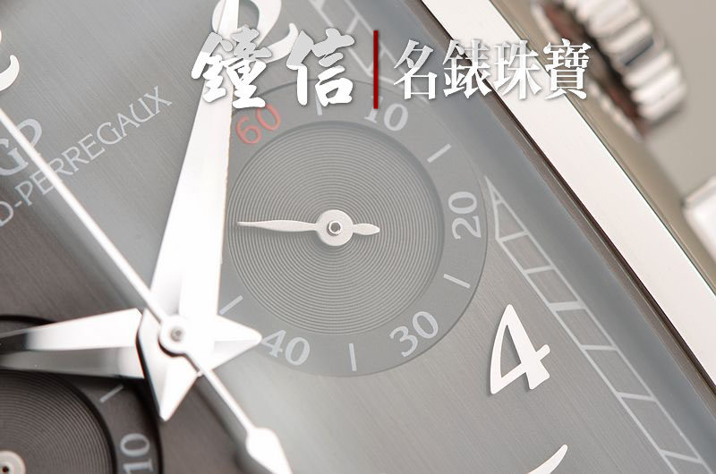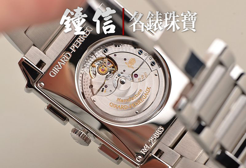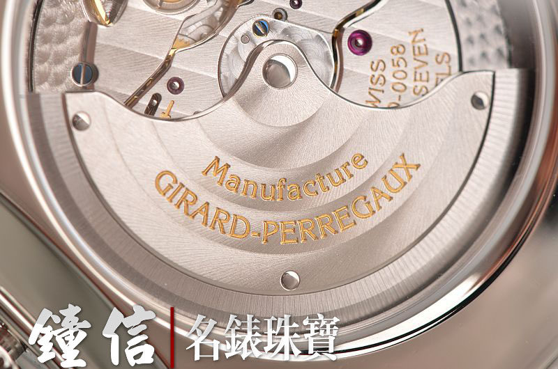 GP自产CAL.GP03300-0058机芯,自动机械。倒角抛光修饰,日内瓦条纹及鱼鳞纹相结合的打磨让整个机芯显得尤为美观和精致。47钻,摆频28800,动力储备约46小时。走时状态极佳。