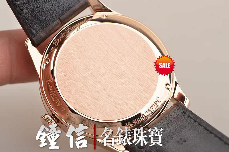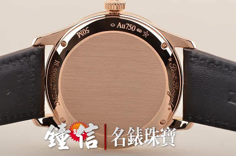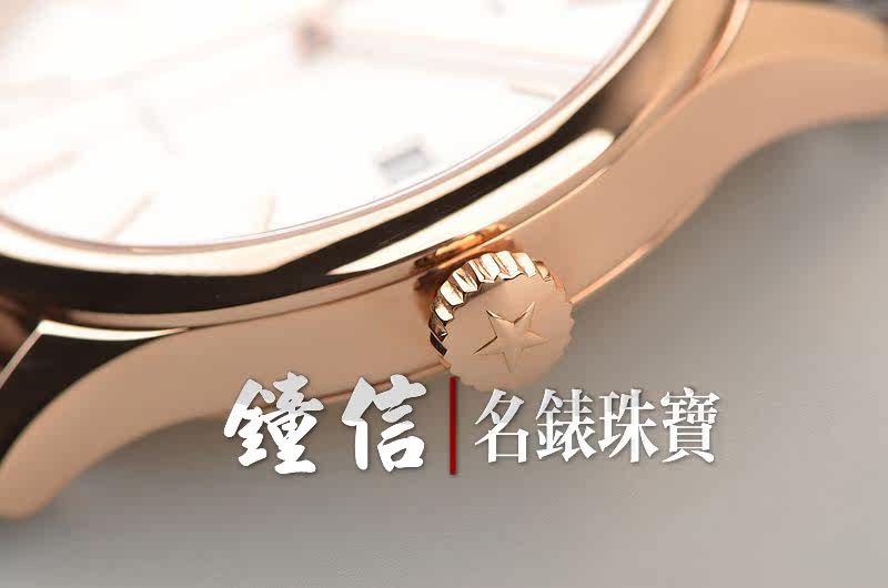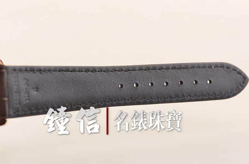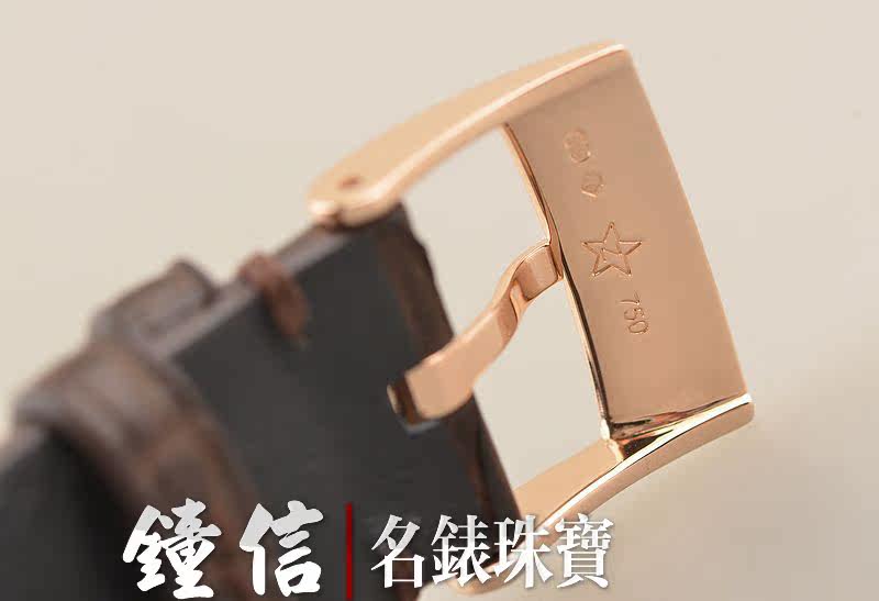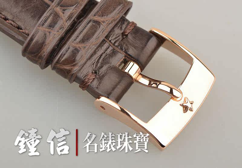 18K玫瑰金表壳及表扣,圣伯纳狗头印记。后配全新棕色鳄鱼皮表带。蓝宝石水晶镜面,立体白色表盘,玫瑰金指针及刻度,3点位日历显示。口径38MM*11MM,防水50M。