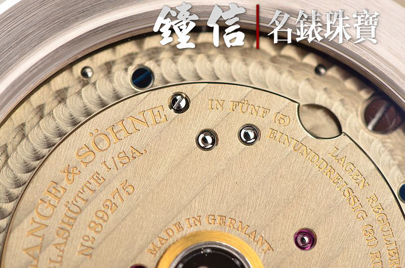 A. Lange & Sohne自产的CAL.L086.2型机芯,自动上链,标准德式3/4大夹板机芯,德国银材质,极其精致人手打磨,倒角抛光修饰,蓝宝石固定红宝石轴承,白金套筒,雕花鹅颈微调,铂金边配重镂空自动转陀,汇集德式高级制表所有元素。由268个零件组成,31钻,摆频21600,5方位校正,动力储存约72小时(3天链),走时状态极佳。