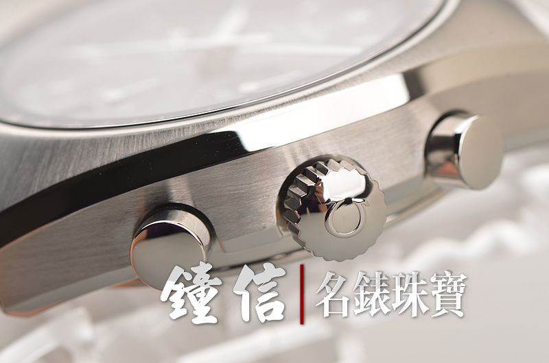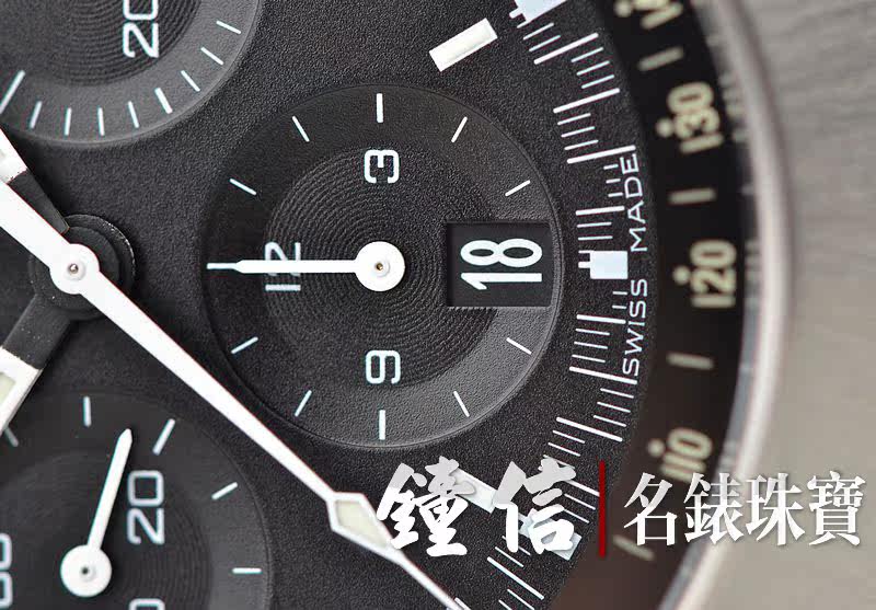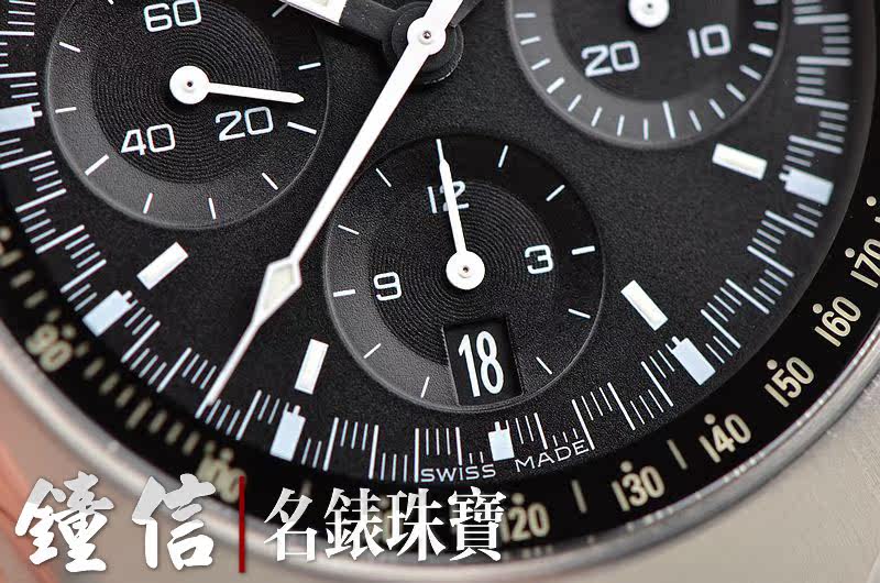 精钢表壳及链带,折叠式表扣。蓝宝石水晶镜面,立体哑光黑色计时表盘,夜光刻度及指针,测速计位于表镜内侧,亦有夜光显示功能。3点位30分钟计时圈,6点位12小时计时圈及日历显示窗口,9点位独立小秒针。表壳侧面10点位用作日历快调的调校孔。口径42.4MM*46.2MM*15MM。相当于圆表44MM左右大小。防水100M。