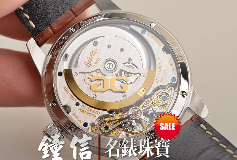 GO自产的CAL.90-03型机芯,自动机械,极其精致人手条纹打磨,倒角抛光修饰,标准德式3/4大夹板机芯,双鹅颈微调,高达61钻,摆频28800,5方位校正,机芯有独立签署,21K黄金镂空LOGO自动转陀。走时状态极佳。