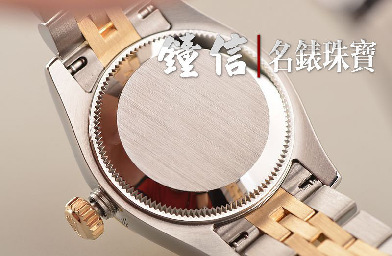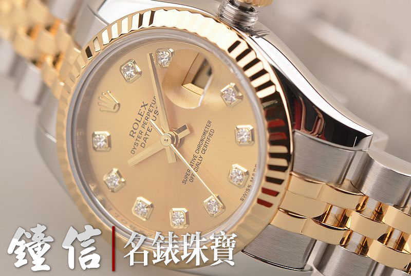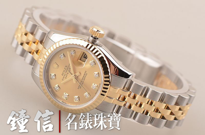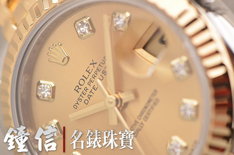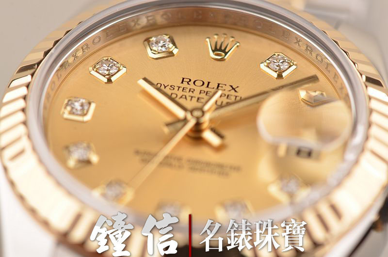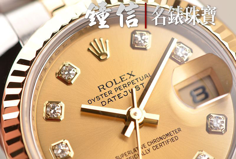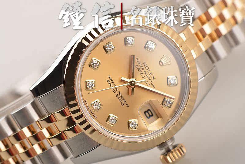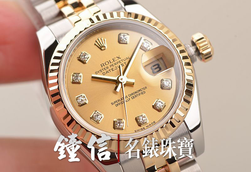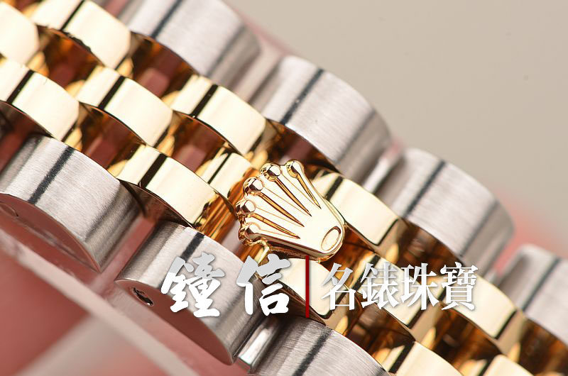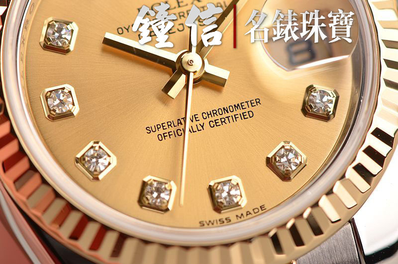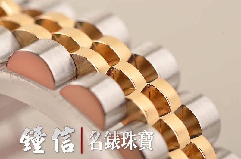 904L精钢及18K黄金表壳及链带,18K黄金三角坑纹表圈。折叠式表扣。蓝宝石水晶镜面,立体香槟金色表盘,原厂天然钻石刻度,黄金指针,3点位放大镜日历显示功能。旋入式防水表冠。口径26MM*11MM,防水100M。