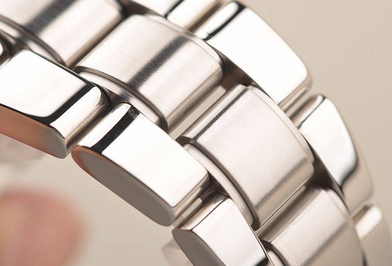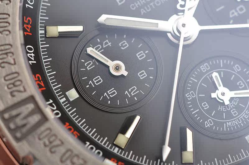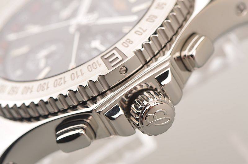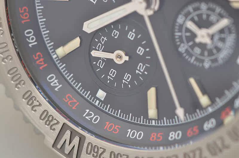 精钢表壳及链带,折叠式表扣。蓝宝石水晶镜面及底盖,立体黑色计时表盘,夜光指针及刻度,9点位昼夜显示功能,6点位60分钟计时及12小时计时累加计时显示功能,3点位独立小秒针,另有红色箭头60分钟计时指针功能。口径45MM*15.4MM。防水100M。