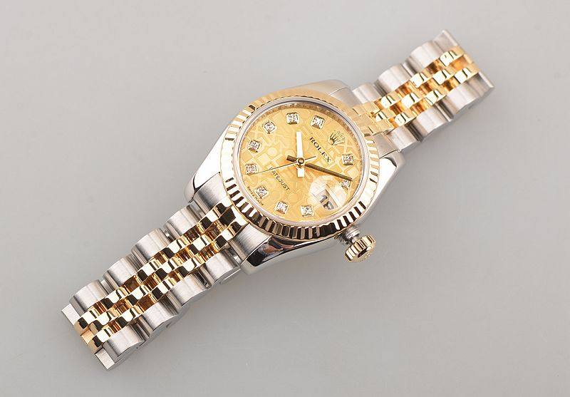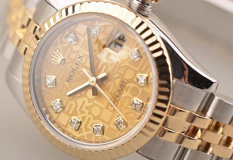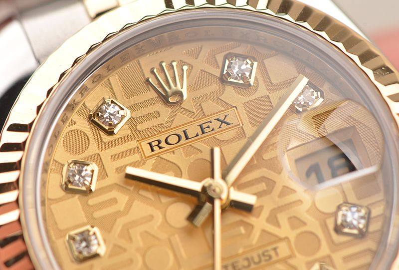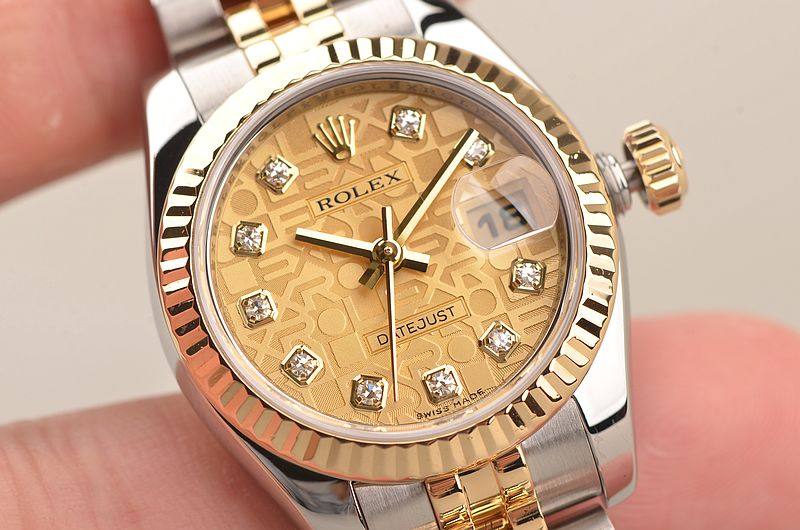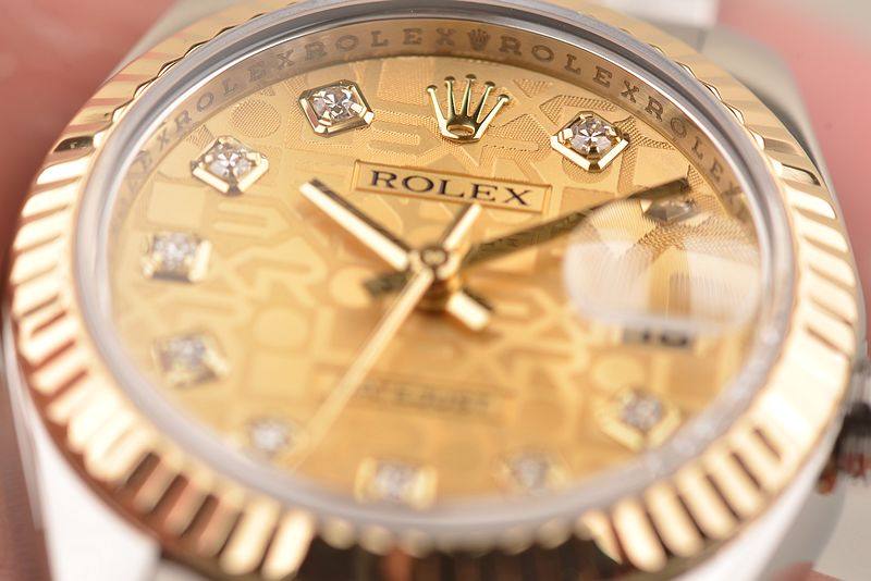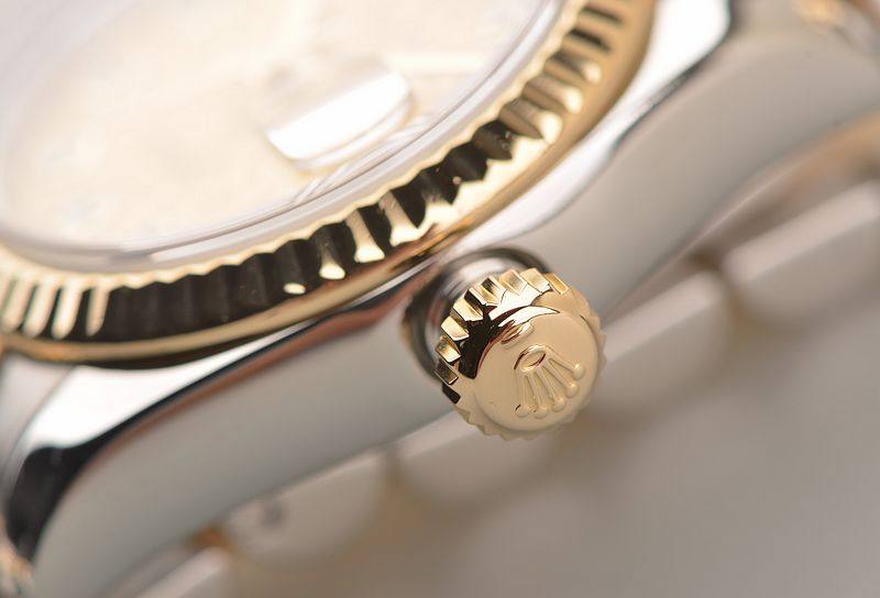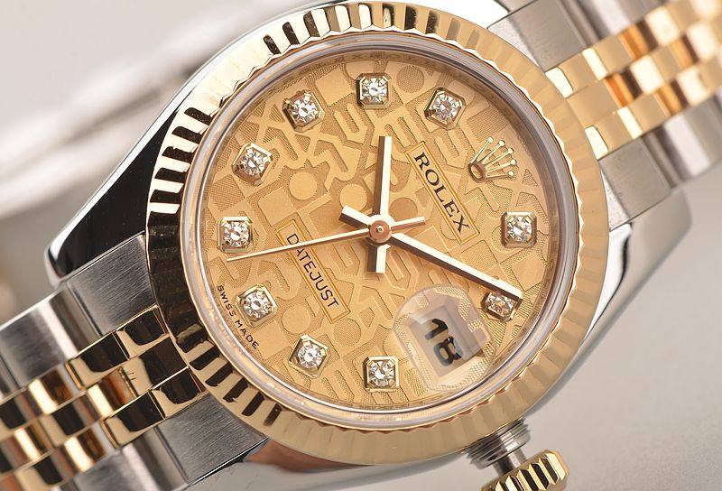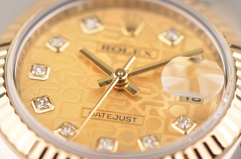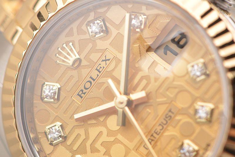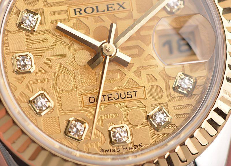 904L精钢及18K黄金表壳及链带,18K黄金三角坑纹表圈。折叠式表扣。蓝宝石水晶镜面,立体香槟金色电脑纪念纹表盘,原厂天然钻石刻度,黄金指针,3点位放大镜日历显示功能。旋入式防水表冠。口径26MM*11MM,防水100M。