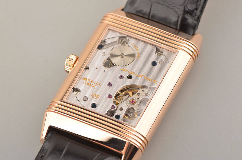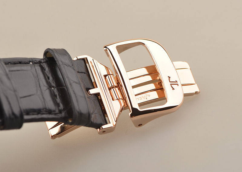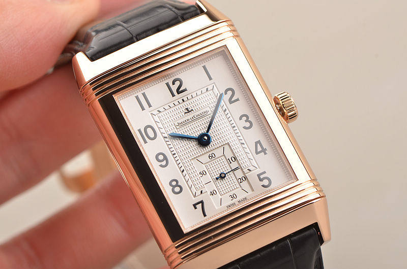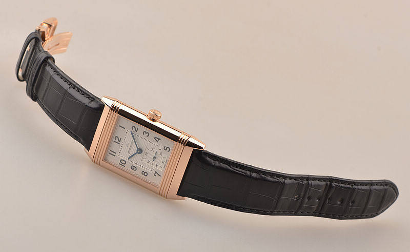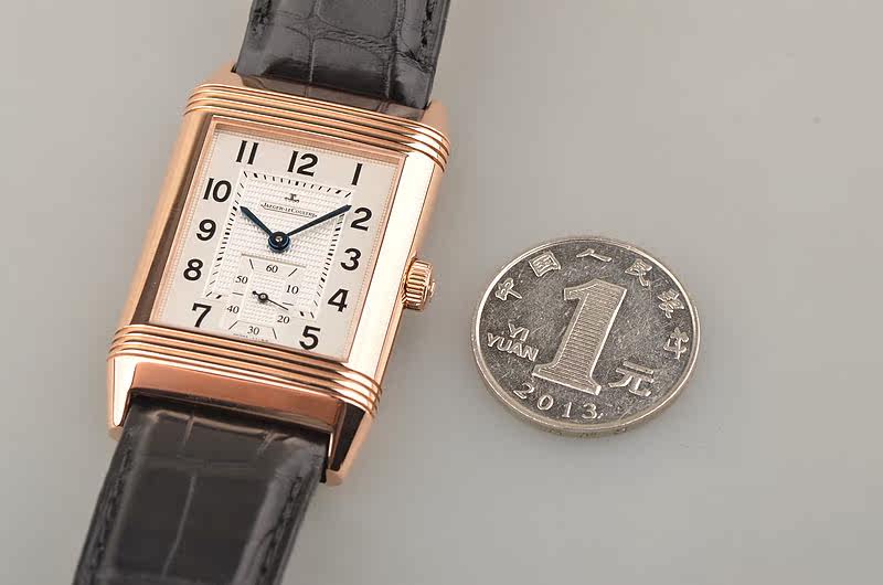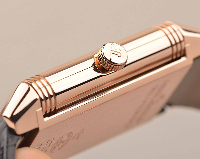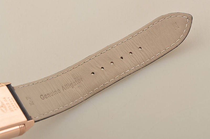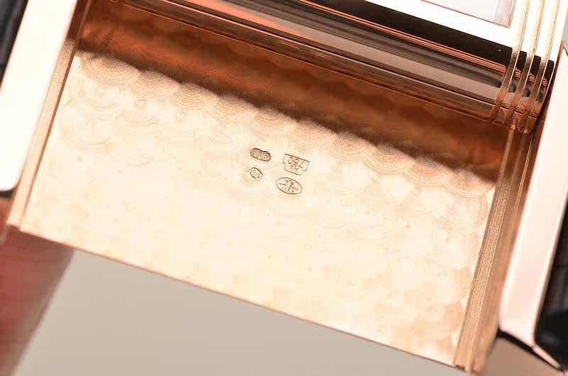 18K玫瑰金表壳及折叠式表扣,圣伯纳狗头印记。后配全新黑色鳄鱼皮表带。蓝宝石水晶镜面及底盖,立体银白色表盘,小三针设计,蓝钢指针。口径48.5MM*30MM*10.4MM,是Reverso系列中的最大号尺寸,相当于圆表42MM左右大小。防水30M。