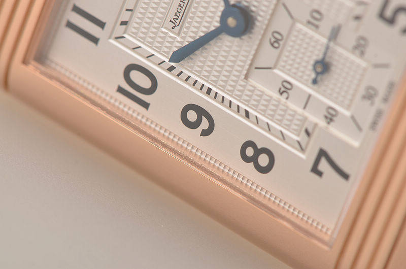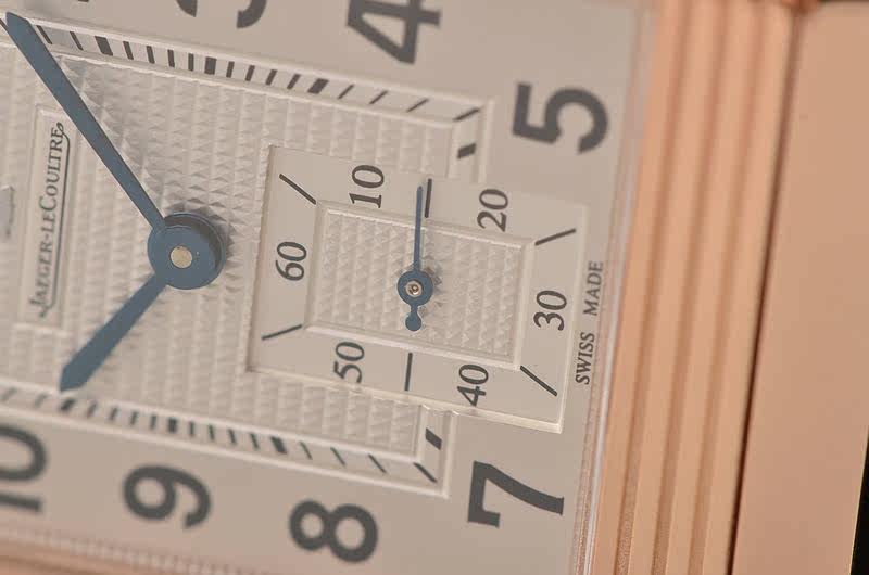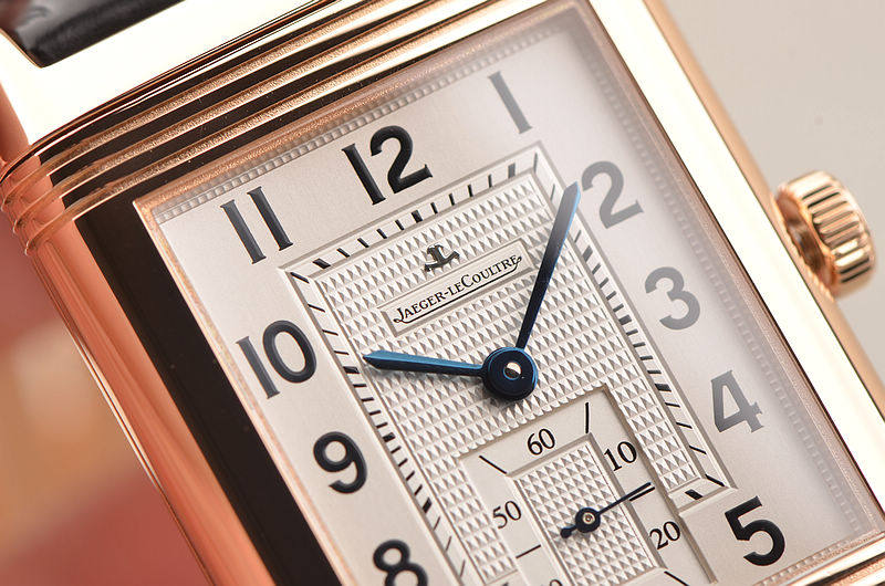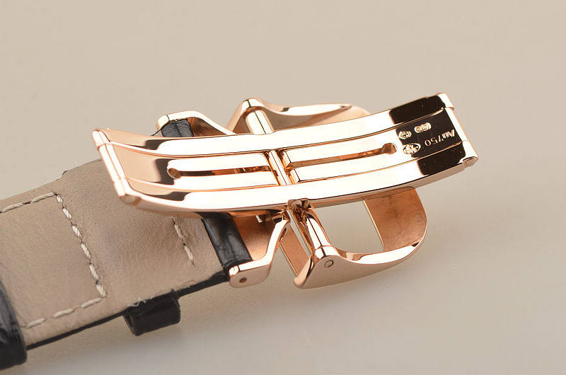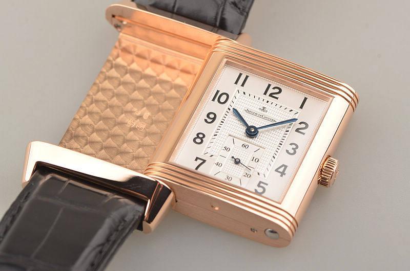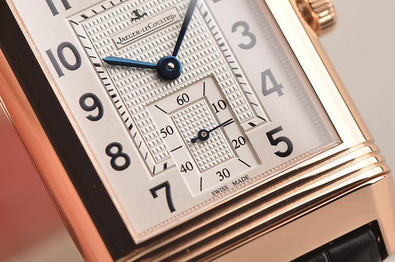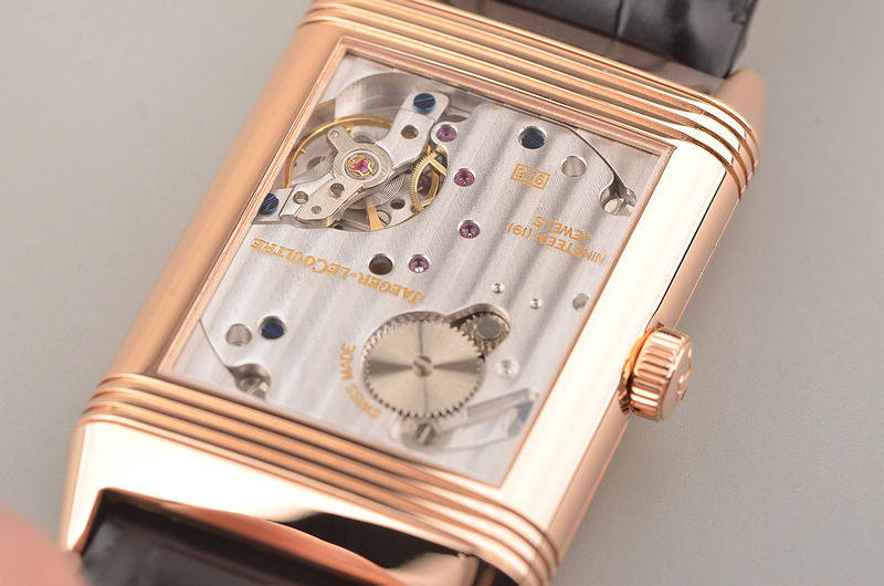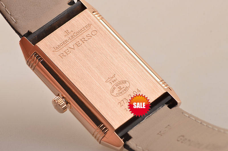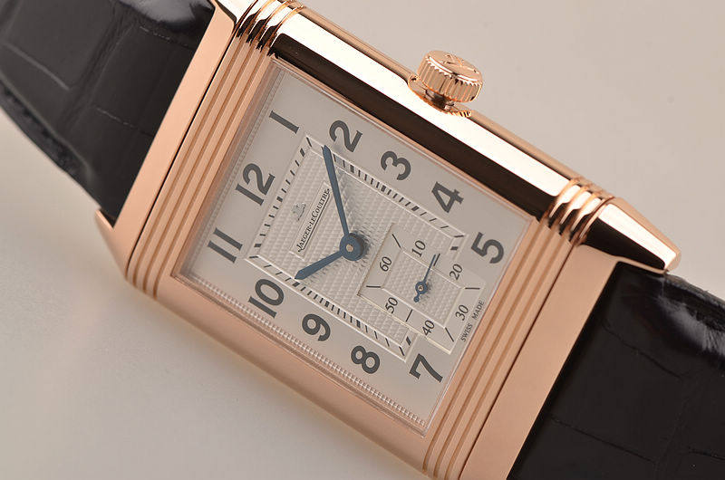 18K玫瑰金表壳及折叠式表扣,圣伯纳狗头印记。后配全新黑色鳄鱼皮表带。蓝宝石水晶镜面及底盖,立体银白色表盘,小三针设计,蓝钢指针。口径48.5MM*30MM*10.4MM,是Reverso系列中的最大号尺寸,相当于圆表42MM左右大小。防水30M。
