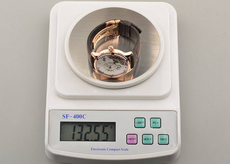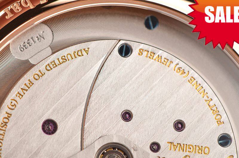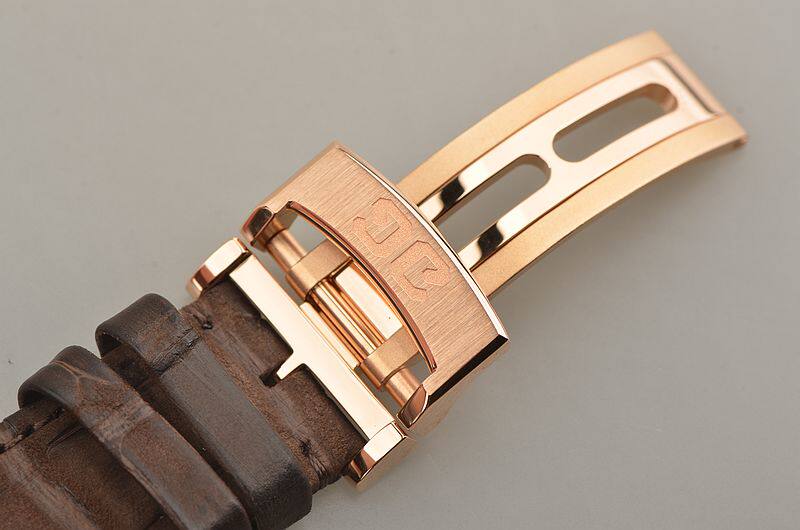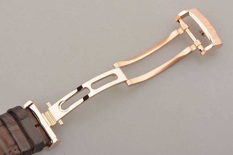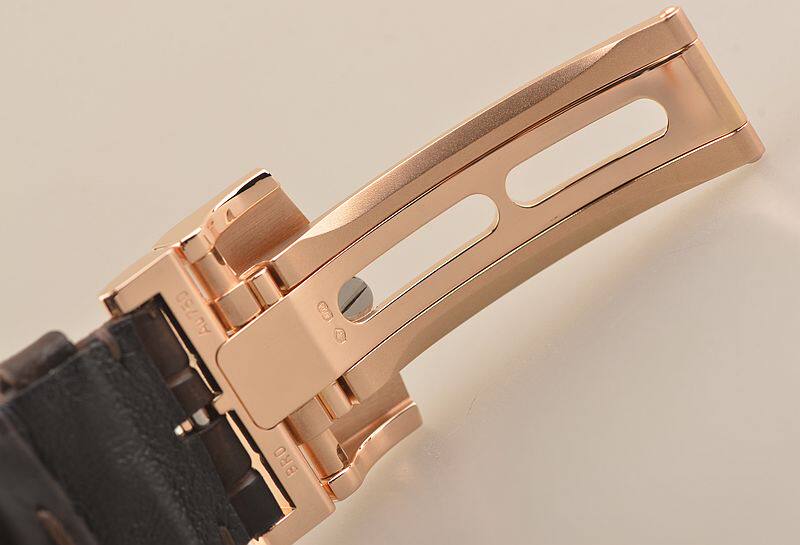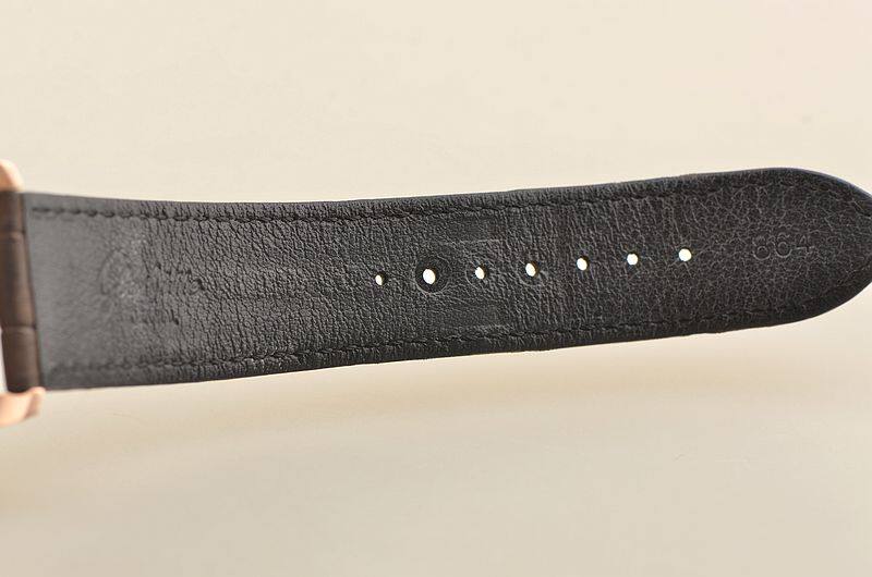 18K玫瑰金表壳及折叠式表扣,圣伯纳狗头印记。原厂棕色路易斯安娜短吻鳄鱼皮带成色极新。蓝宝石水晶镜面及底盖,立体银白色表盘,蓝钢玫瑰金夜光指针及刻度,偏心小三针,大日历,双鹅颈反作。口径42MM*12.3MM。防水50M。