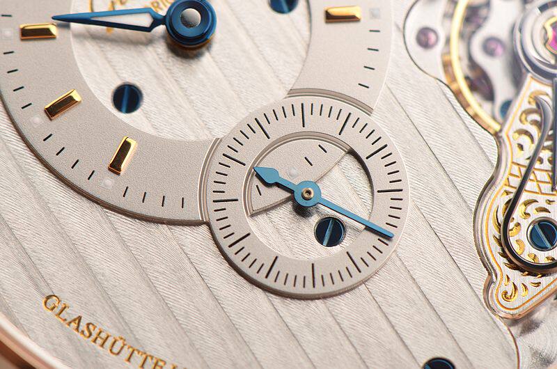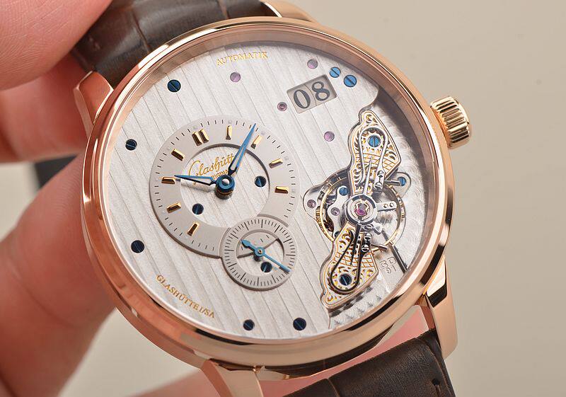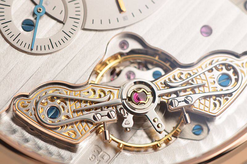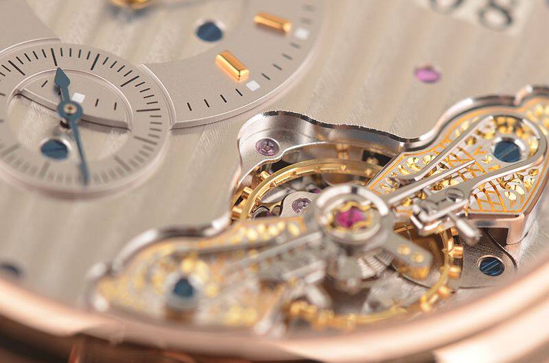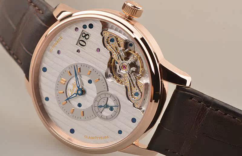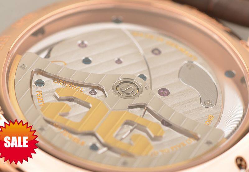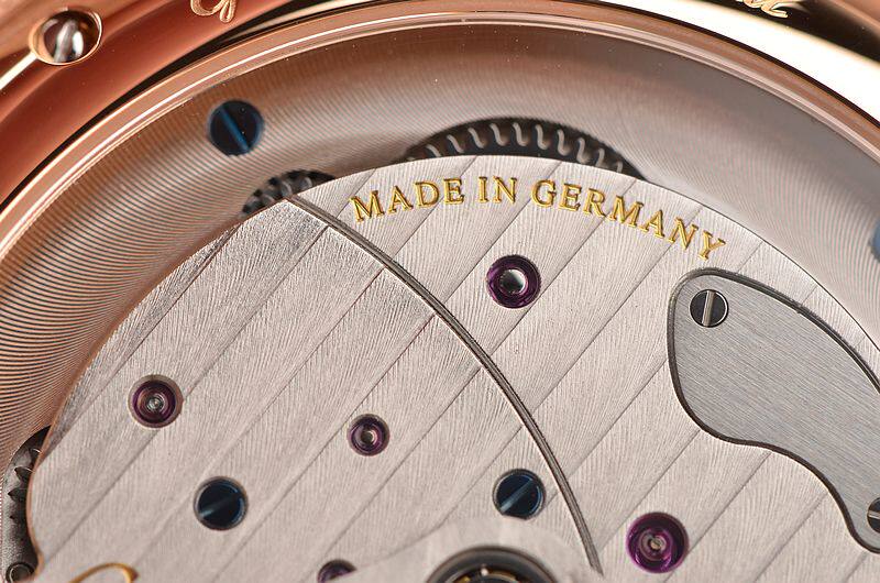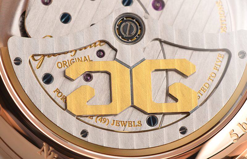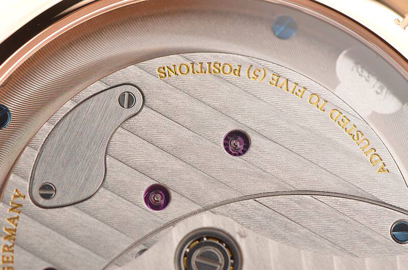 GO自产的CAL.91-02型机芯,自动机械,极其精致人手条纹打磨,倒角抛光修饰。鹅颈反作机芯,德式3/4大夹板,49钻,摆频28800,5方位校正,动力储存约42小时。走时状态极佳。