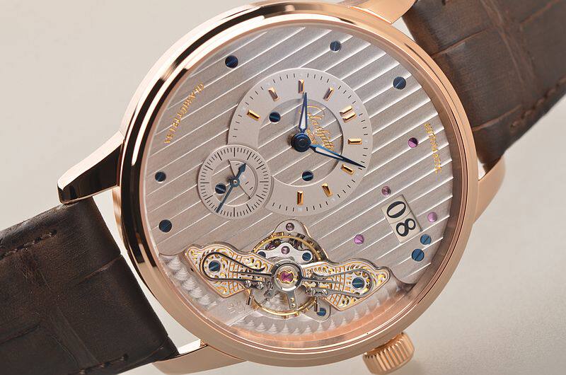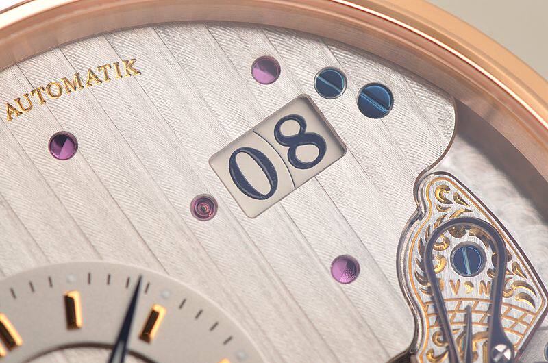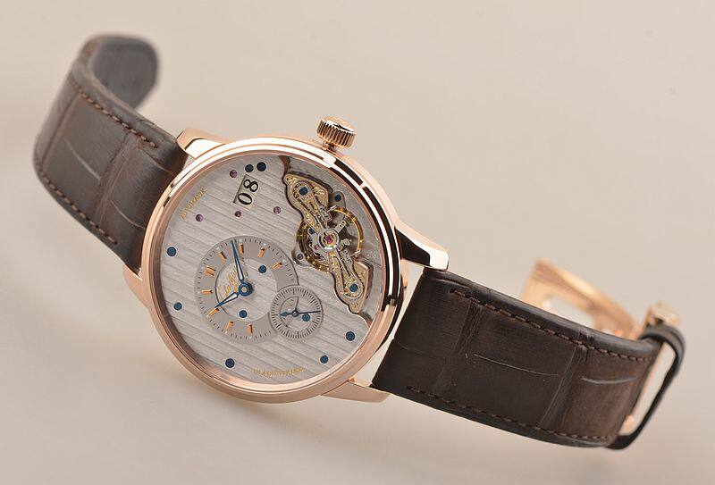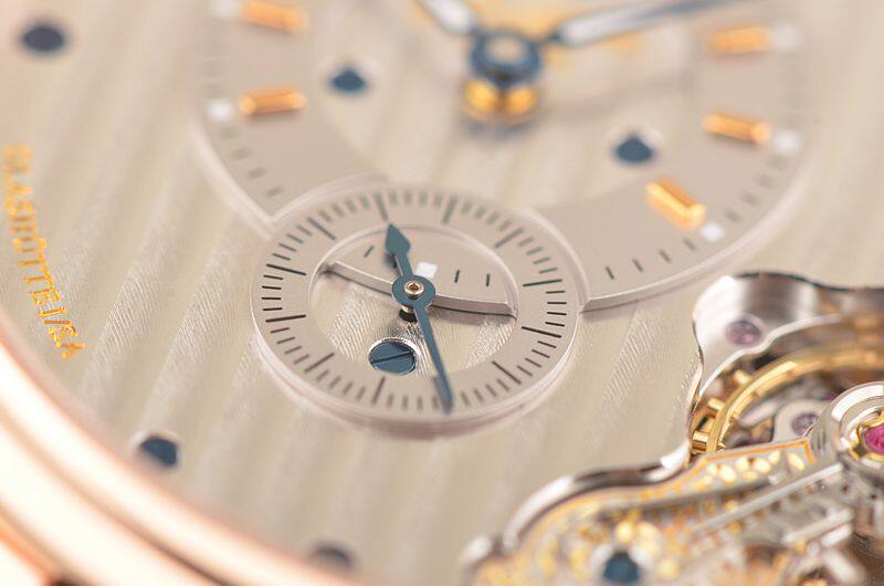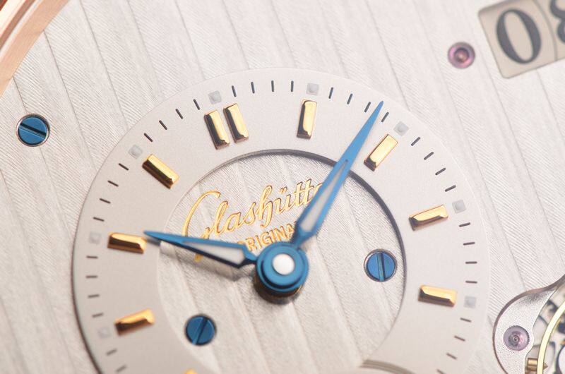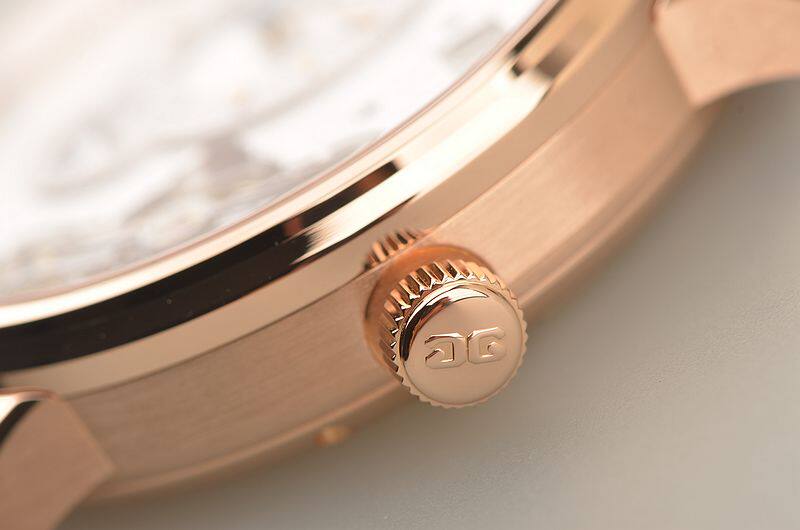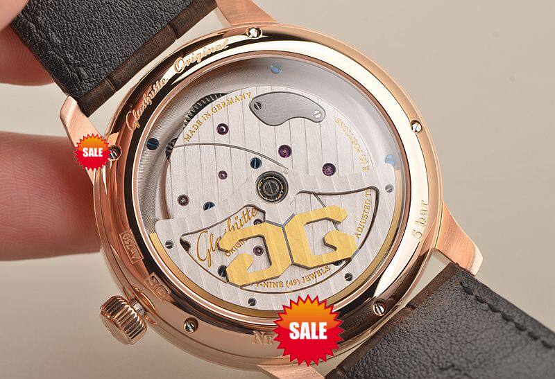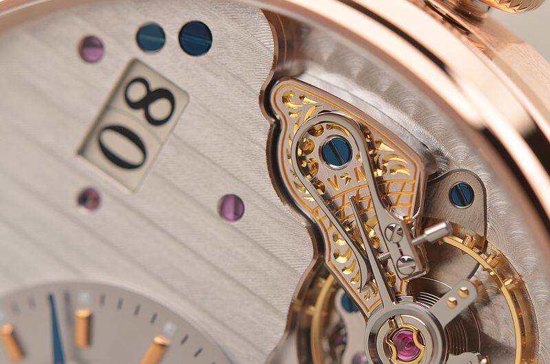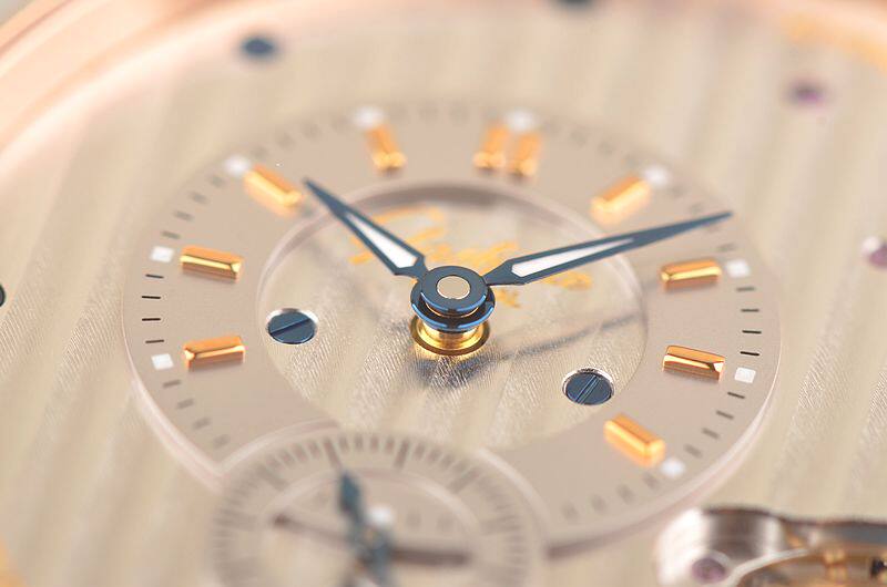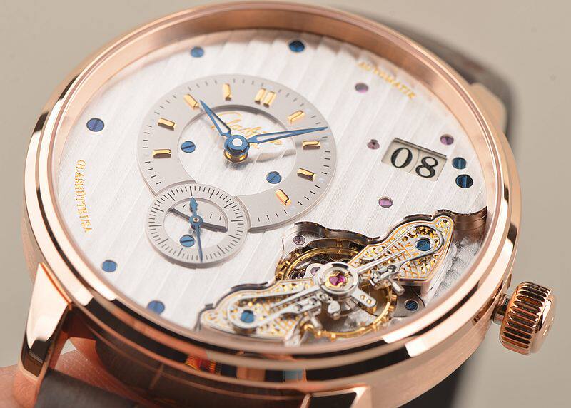 GO自产的CAL.91-02型机芯,自动机械,极其精致人手条纹打磨,倒角抛光修饰。鹅颈反作机芯,德式3/4大夹板,49钻,摆频28800,5方位校正,动力储存约42小时。走时状态极佳。
