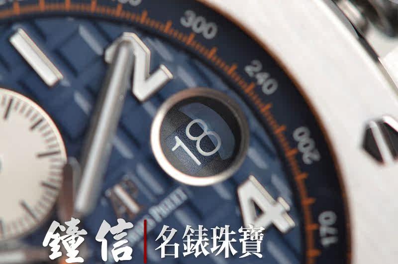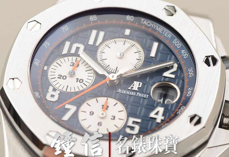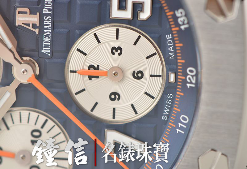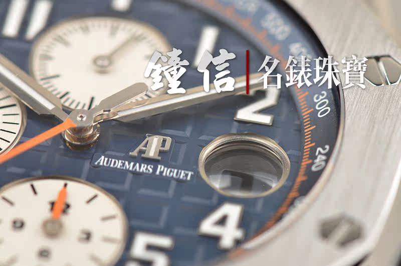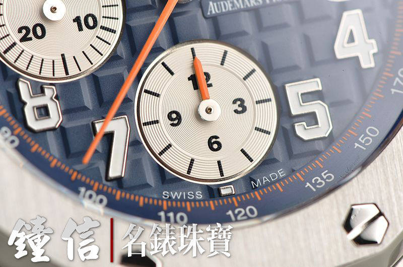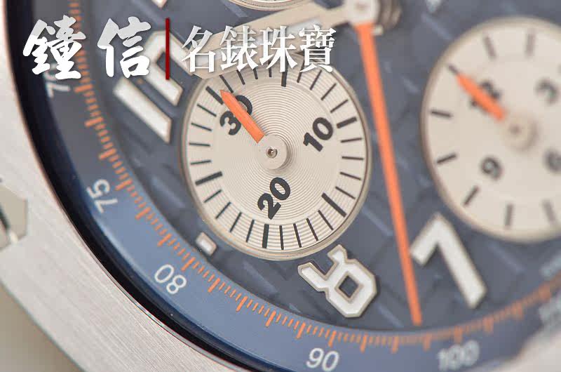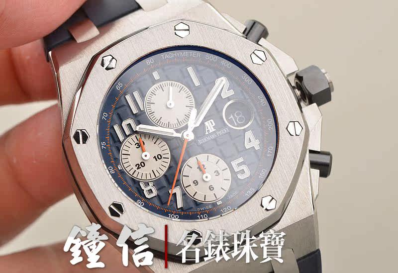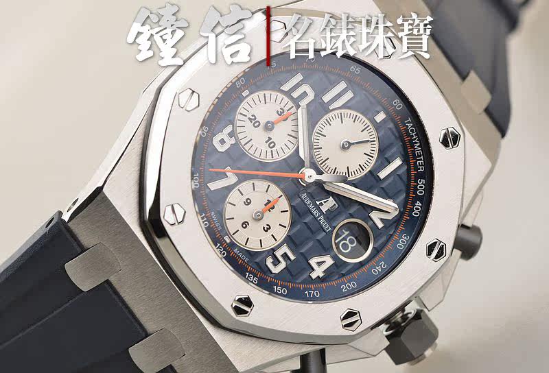 精钢八角皇家橡树表壳及表扣,原厂深蓝色胶带成色极新。蓝宝石水晶镜面及底盖,热门的立体蓝色计时表盘,12点位独立小秒针,9点位30分钟计时,6点位12小时计时,3点位放大镜日历视窗。旋入式陶瓷防水表冠,陶瓷计时按钮。口径42MM*14.6MM。防水100M。