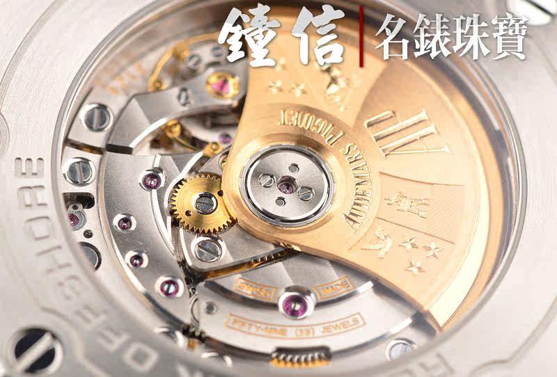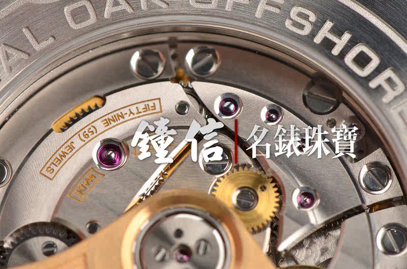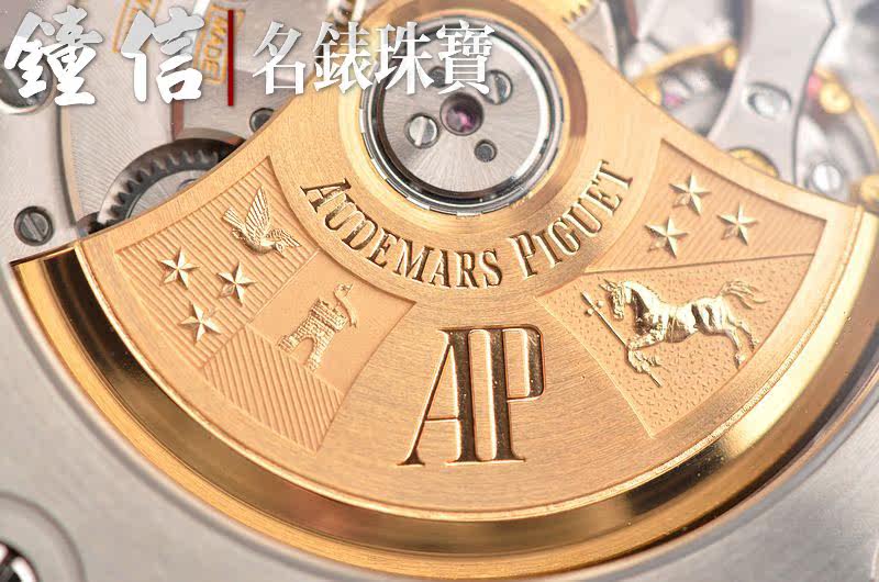 AP自产CAL.3126/3840型机芯,自动机械,极其精致日内瓦条纹打磨,倒角抛光修饰。由365个零件组成,59钻,22K玫瑰金镌刻自动转陀,摆频21600,动力储存约55小时。走时状态极佳。