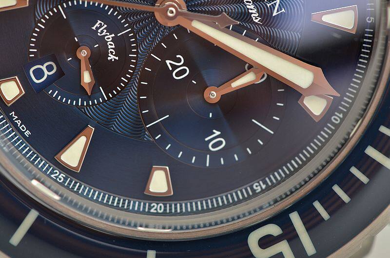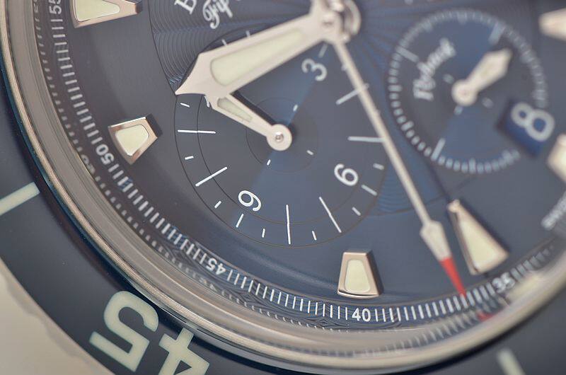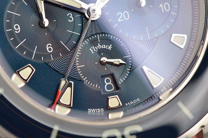 精钢表壳及表扣,原厂蓝色帆布内衬防水牛皮表带成色很新。蓝色陶瓷旋转计时表圈。立体蓝宝石水晶镜面,立体蓝色瓷釉印花计时表盘,飞返计时功能。夜光刻度及指针,9点位12小时计时,6点位独立小秒针及日历显示功能,3点位30分钟计时。旋入式防水表冠。口径45MM*15.5MM。防水深达300M。