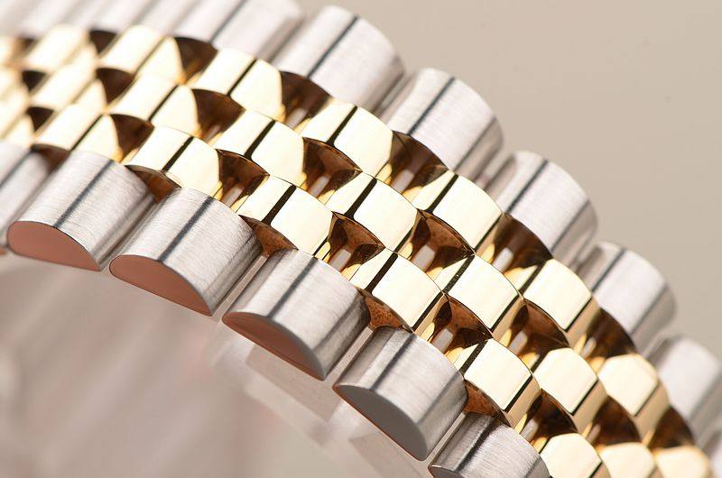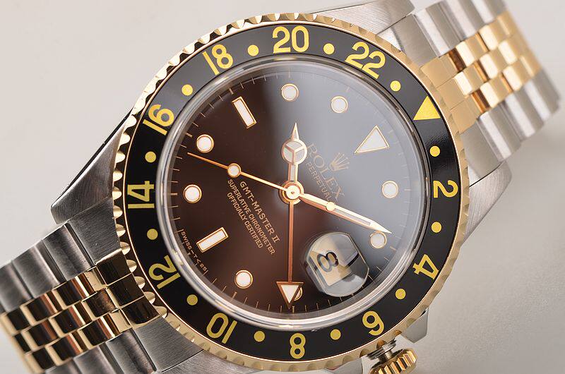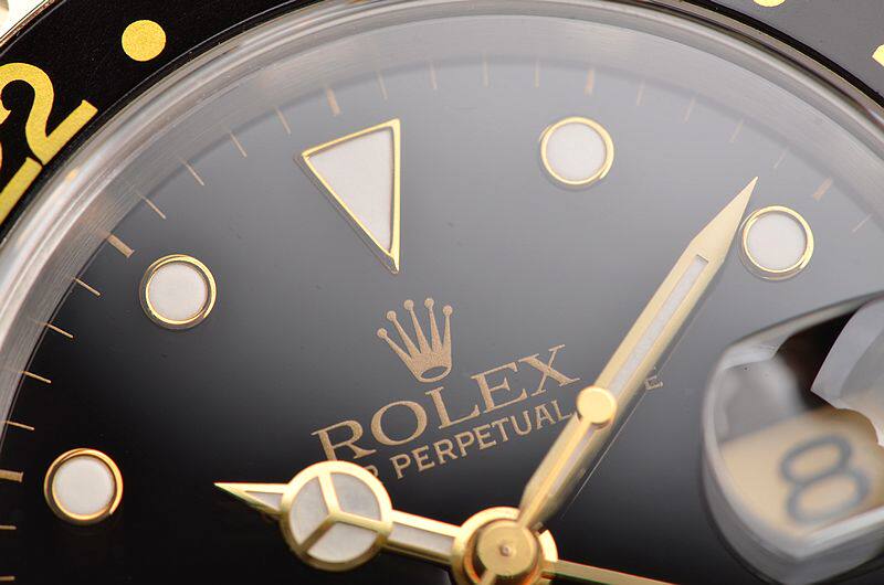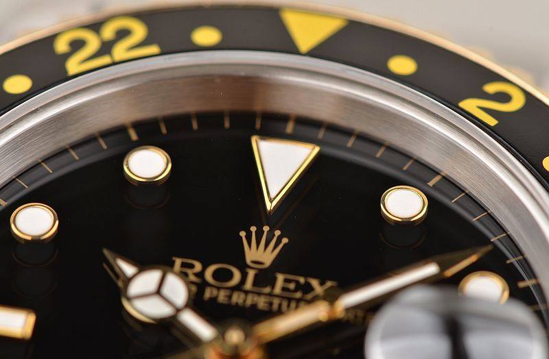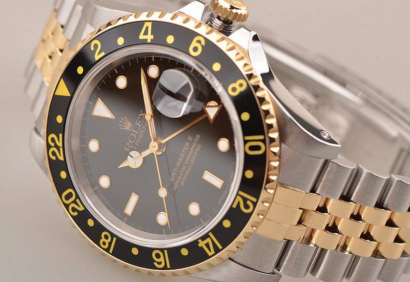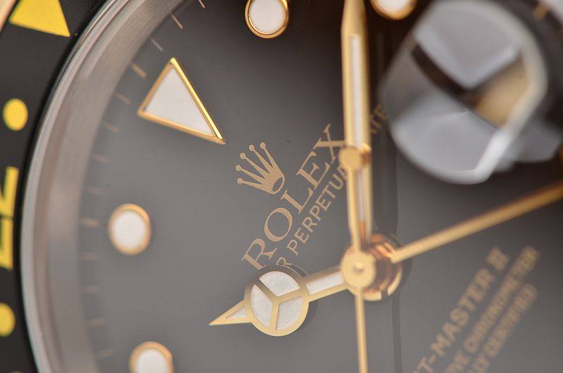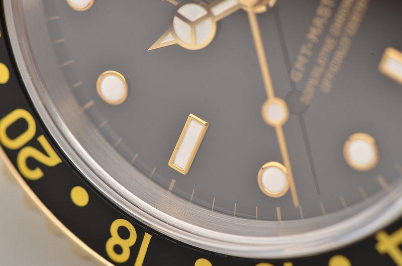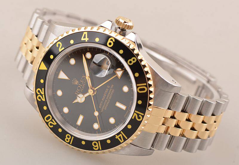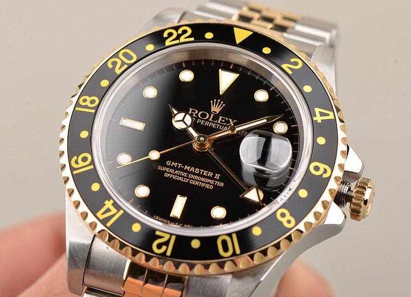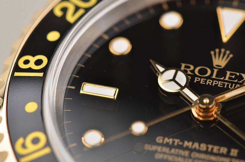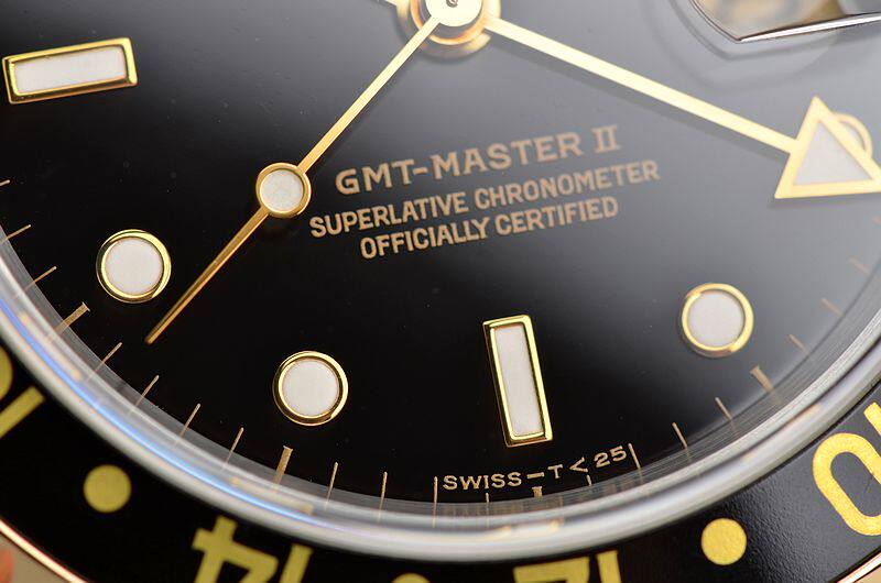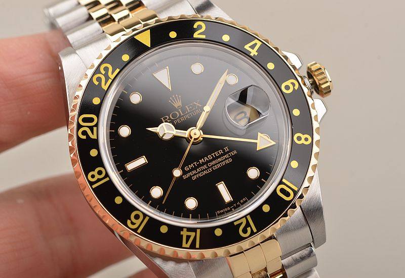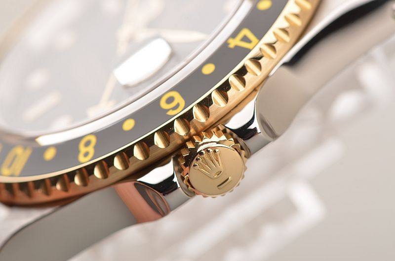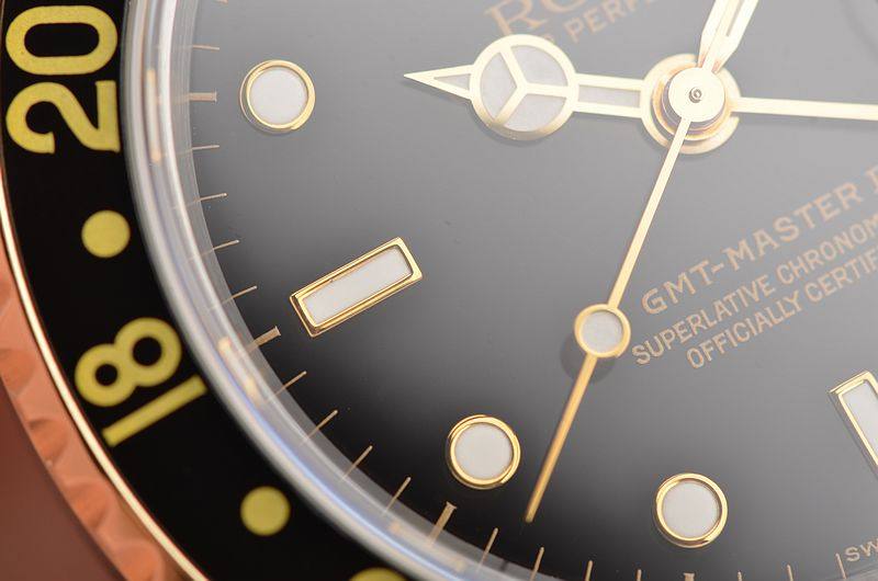 904L精钢及18K黄金表壳及五珠链带,黑色双向旋转GMT表圈。蓝宝石水晶镜面,立体黑色T<25表盘,夜光刻度及指针,GMT第二时区功能。3点位放大镜日历视窗。旋入式防水表冠。口径40MM*13MM。防水100M。
