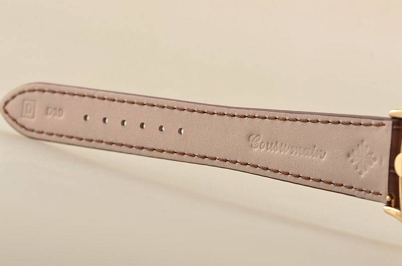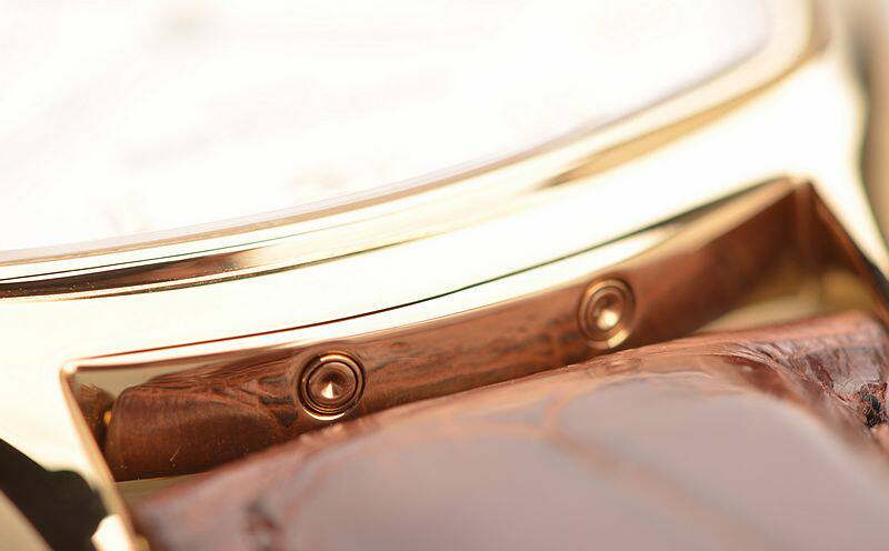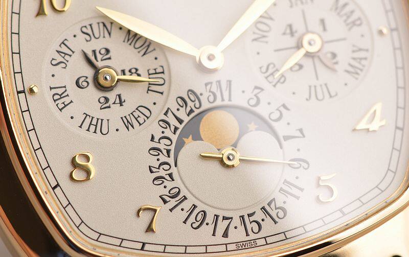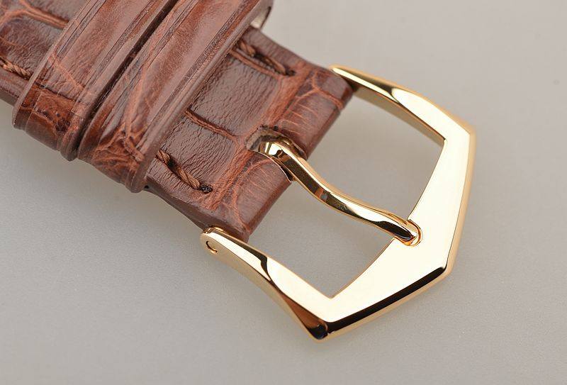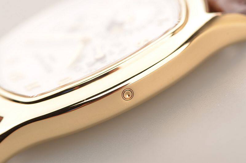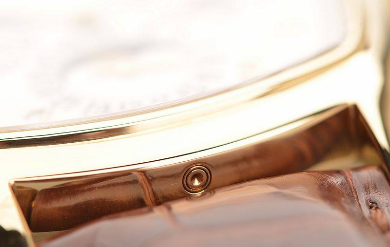 18K黄金坐墊形(cushion-shaped)錶身及表扣,圣伯纳狗头印记。后配全新棕色鳄鱼皮表带。蓝宝石水晶镜面及底盖,立体乳白色粒紋(grained cream-colored)錶面,立體黃金寶璣式數目字時標,黃金葉形時分針,錶面近三時位置設有月份(金色長針,英文簡寫)及閏年(黑色短針)顯示錶盤,日期及月相顯示錶盤設於錶面近六時位置,星期(金色長針,英文簡寫)及24小時上下午指示(黑色短針)錶盤則放在錶面近九時位置;口径44.6MM*37MM*8.2MM,相当于圆表41MM左右大小。防水30M。