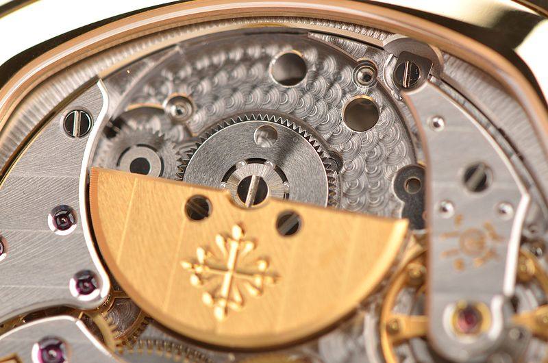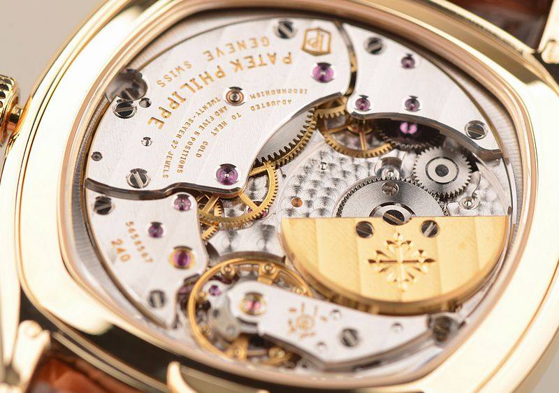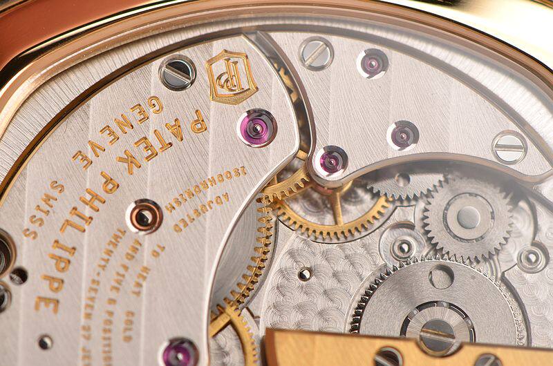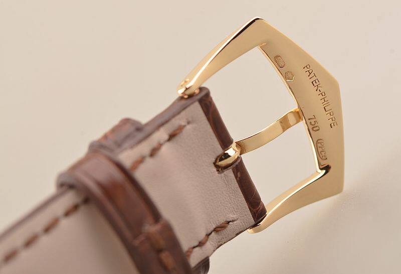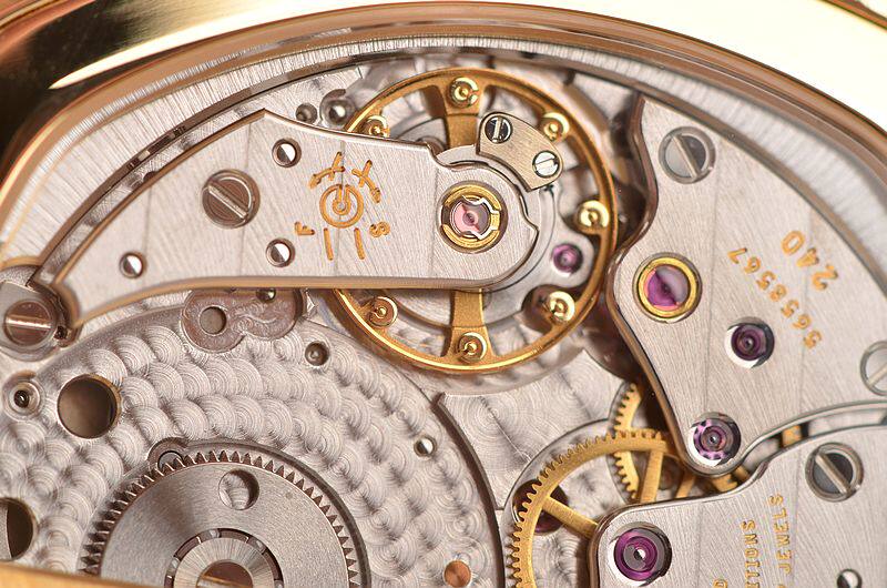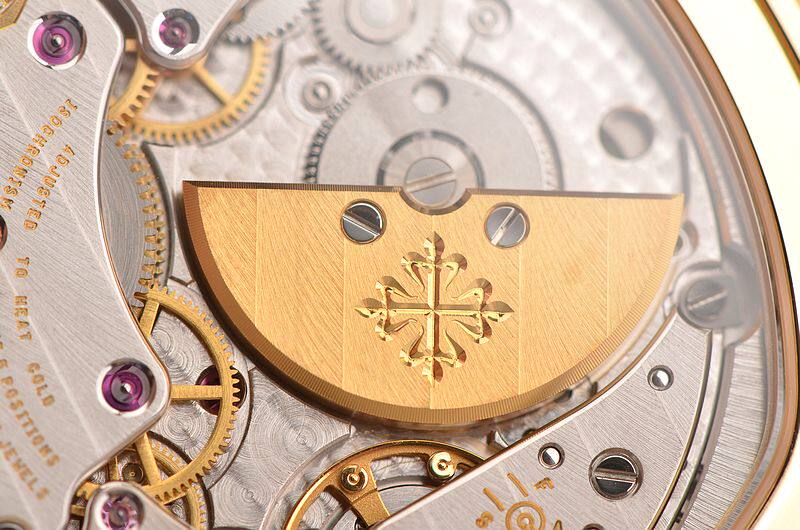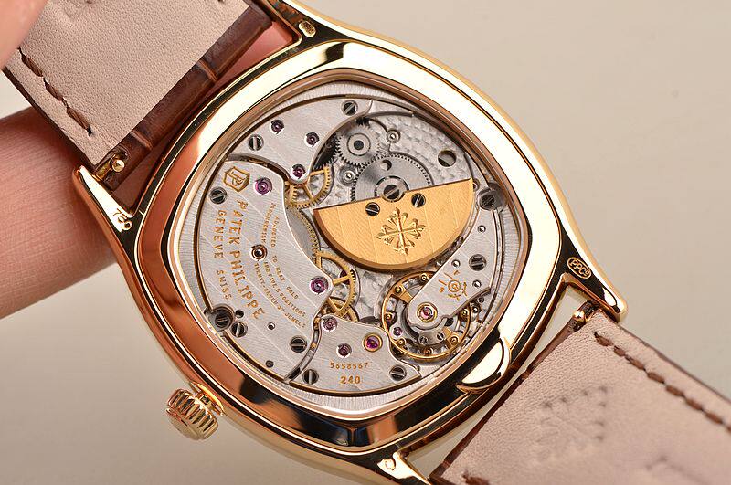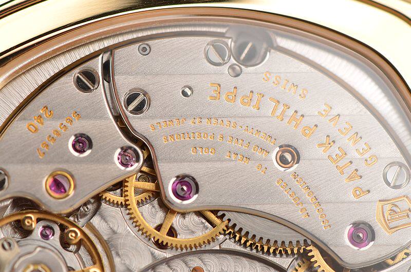 PP自产CAL.240Q型机芯,新款双P印记。自动机械,极其精致日内瓦条纹打磨,倒角抛光修饰。由275个零件组成,8块机芯夹板,27钻,摆频21600,5方位校正,22K黄金镌刻自动转陀,万年历,月相功能。动力储存约48小时。走时状态极佳。
