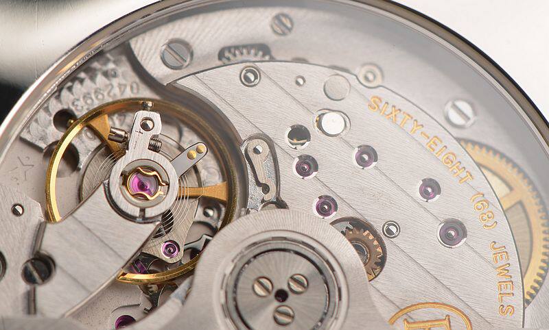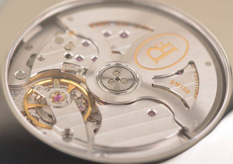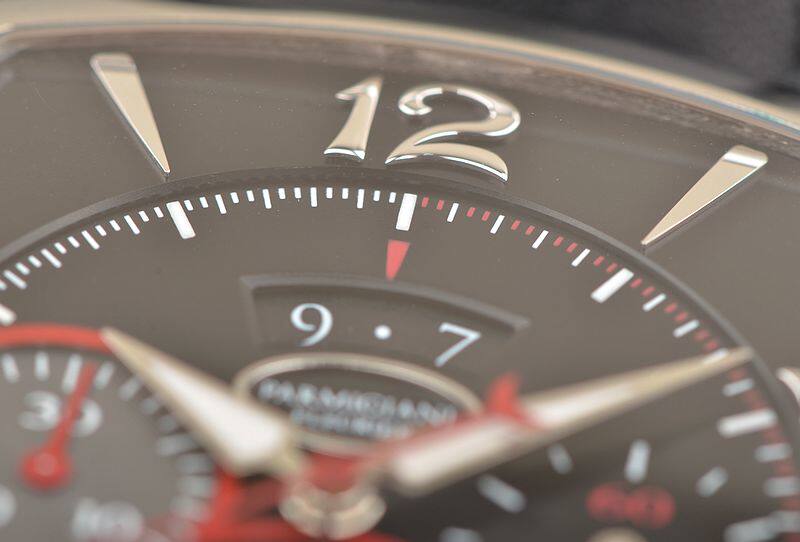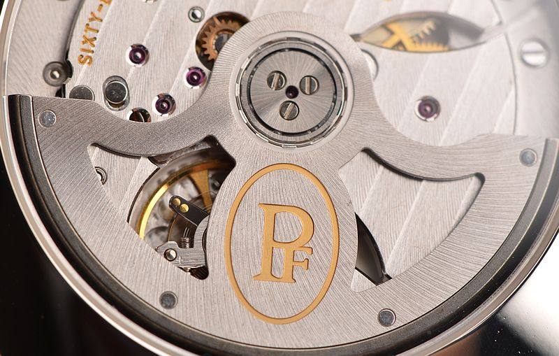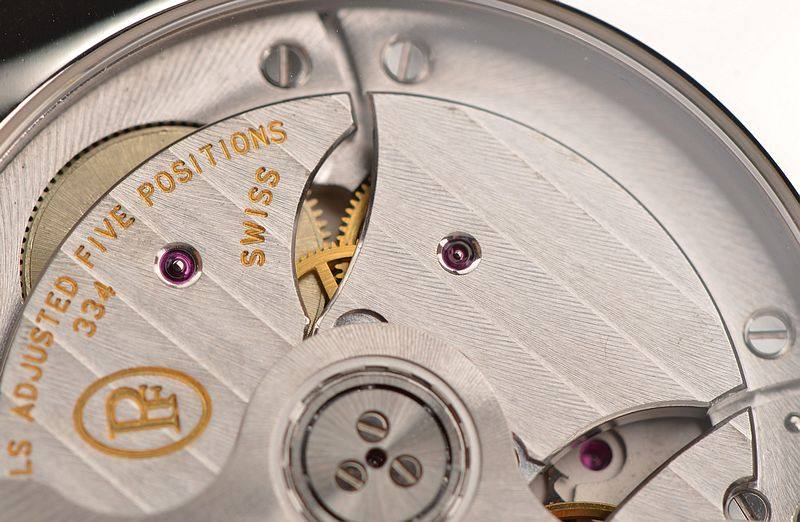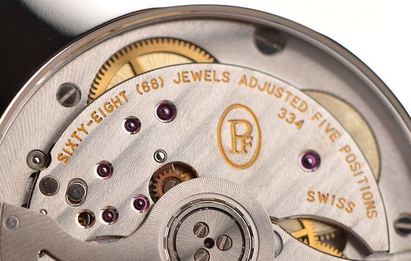 帕玛强尼自产的CAL.PF334型机芯,由303个零件组成,自动机械,计时及日历功能,精致日内瓦条纹打磨,倒角抛光修饰,68钻,5方位校正,摆频28800。动力储存约50小时。走时状态极佳。