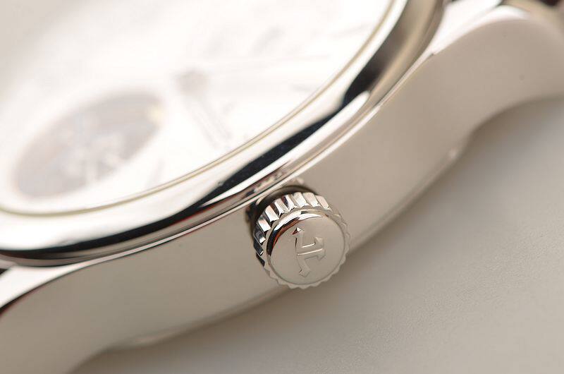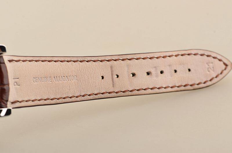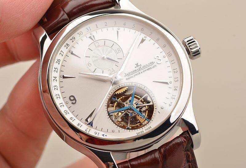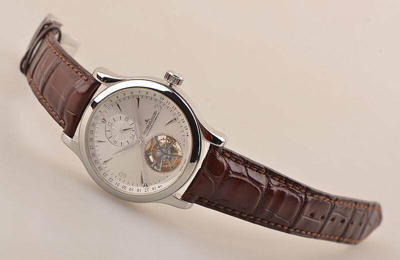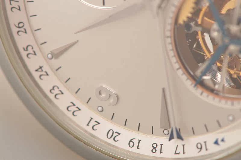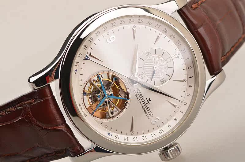 精钢表壳及折叠式表扣,原厂棕色鳄鱼皮表带成色较新。蓝宝石水晶镜面及底盖,立体银白色表盘,12点位指针式第二时区功能,月芽型日历指针,6点位镂空陀飞轮,口径41.5MM*12.6MM,防水50M。
