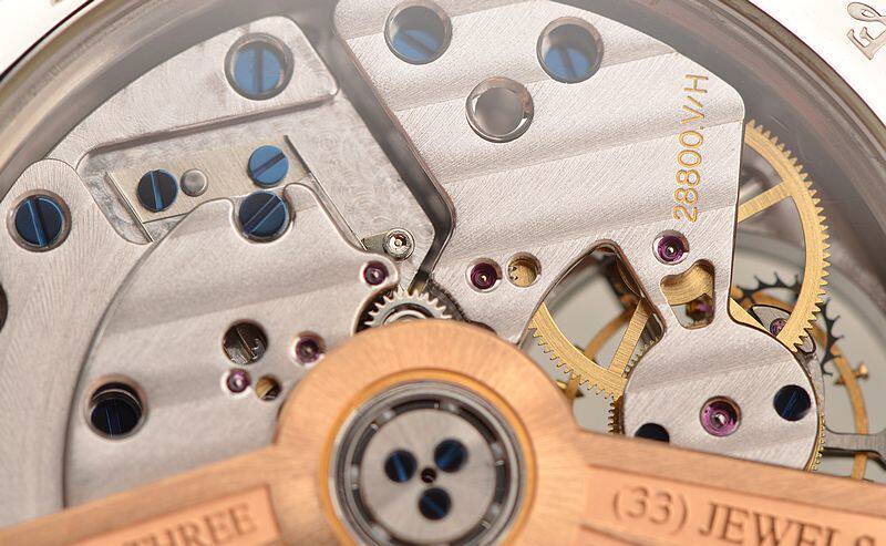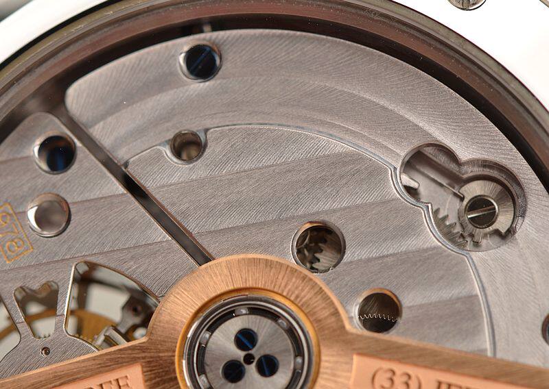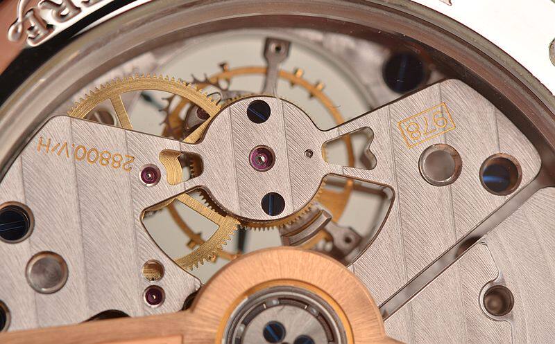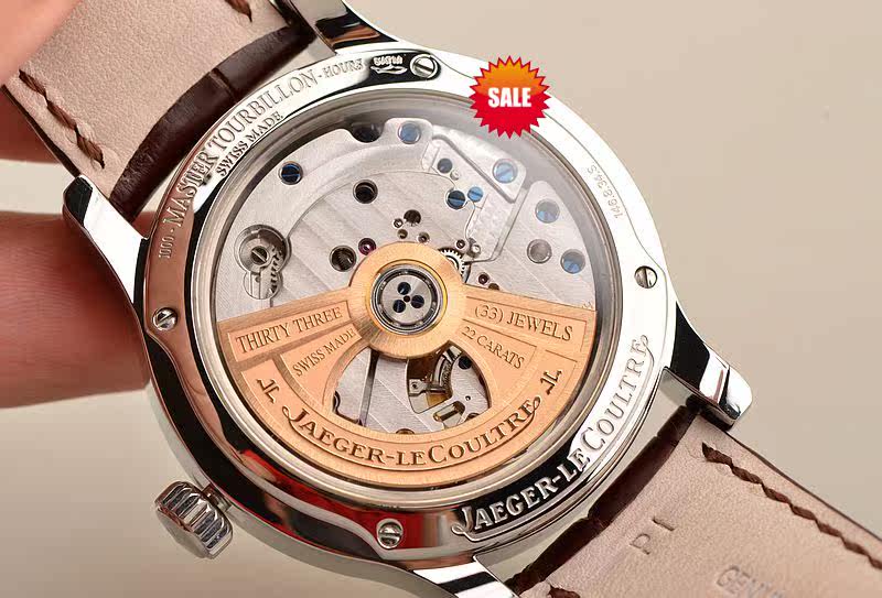 积家自产顶级CAL.978型机芯,自动机械,陀飞轮,极其精致日内瓦条纹打磨,倒角抛光修饰。机芯独立签署,由302个零件组成,33钻,摆频28800,动力储存约48小时。22K玫瑰金镌刻自动转陀,走时状态极佳。